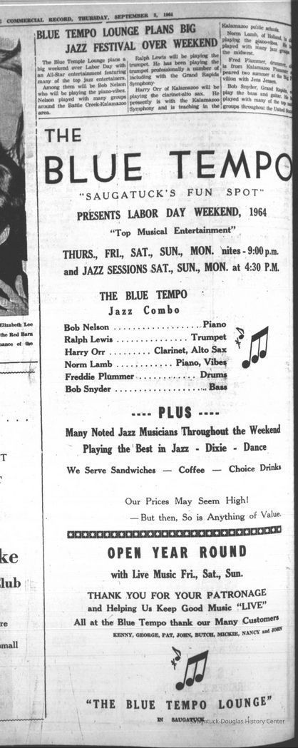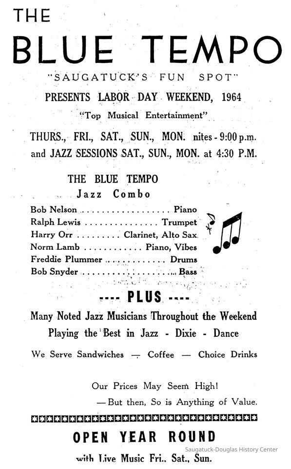 Especially after the Big Pavilion burned in 1960 the Blue Tempo on Culver Street in Saugatuck was known for attracting well-known, although mostly local, jazz musicians. Norm Lamb, playing both with various combos and as a solo performer in a piano-bar setting, appeared in various Saugatuck and Douglas venues f or more than 20 years. The Blue Tempo owners were often in trouble with the authorities that regulated alcoholic beverages so it is unclear what is mean by "Choice Drinks."