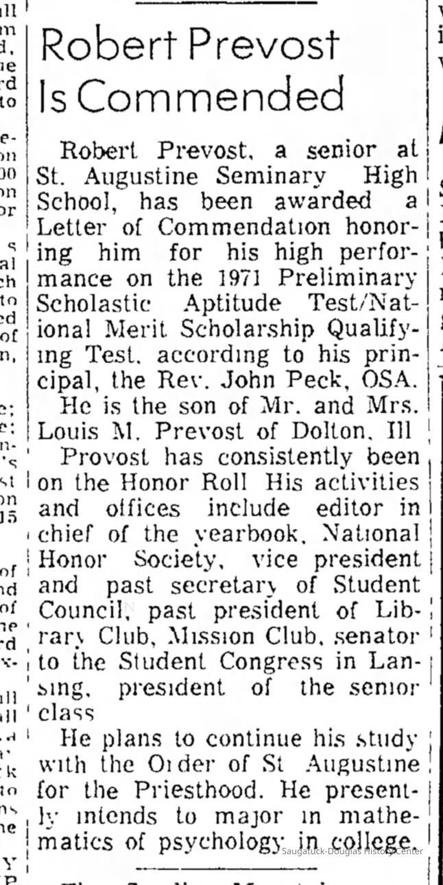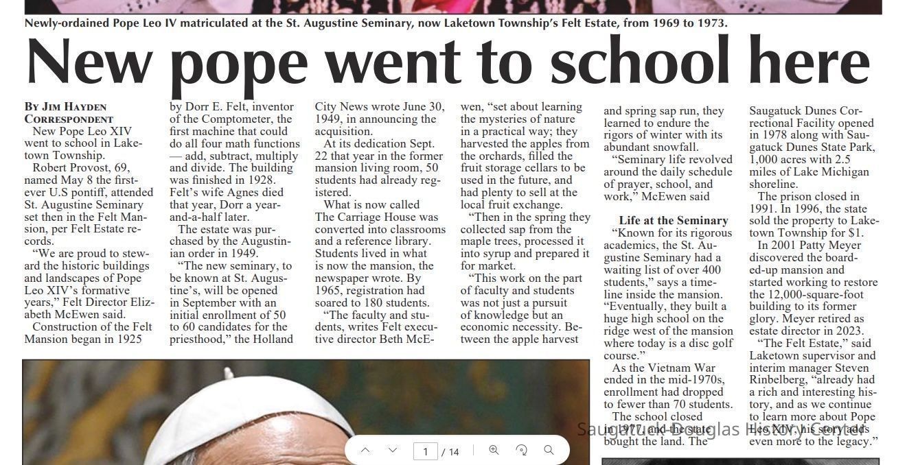 "The Saint Augustine Seminary, a prep school for Catholics, was at the Felt Mansion and Shore Acres Park in Laketown Township, between Holland and Saugatuck. Archives of the Holland Evening Sentinel from October 1972 reference Robert Prevost as a senior at Saint Augustine Seminary High School. The Felt Estate confirmed he graduated in 1973. The Holland Sentinel covered a reunion for the school in 2013 and said Prevost was there. The estate was built by inventor Dorr Felt in 1925 and bought by the Augustinian order in 1949 for use as a school, with the goal of educating between 50 and 60 students at a time who were interested in becoming priests. The mansion included the dorm and chapel and a garage was converted to host classes and include a library. By 1965, the Felt Estate said, the school was serving 180 students and had a waiting list of 400. But interest later waned and enrollment was below 70 by the mid-1970s. The school closed in 1977. The state bought the land and Laketown Township bought it [the mansion] for $1 in 1996. The mansion is now a venue and museum." Source: https://www.woodtv.com/news/allegan-county/new-pope-attended-catholic-school-in-west-michigan/ by: Rachel Van Gilder, Josh Sanchez. Updated: May 8, 2025 / 08:41 PM EDT The St. Augustine Seminary High School was built on the grounds west of the Felt Mansion. The building was repurposed to be a State of Michigan correctional facility around 1987. The prison was closed in 1992 and the building was demolished. Carved stones* from high school still lay on the ground near a storage building on the southwest corner of the disc golf course. Robert Prevost was elected Pope Leo XIV on May 8, 2025. *See organization profile for the Felt Estate.