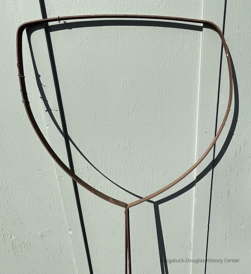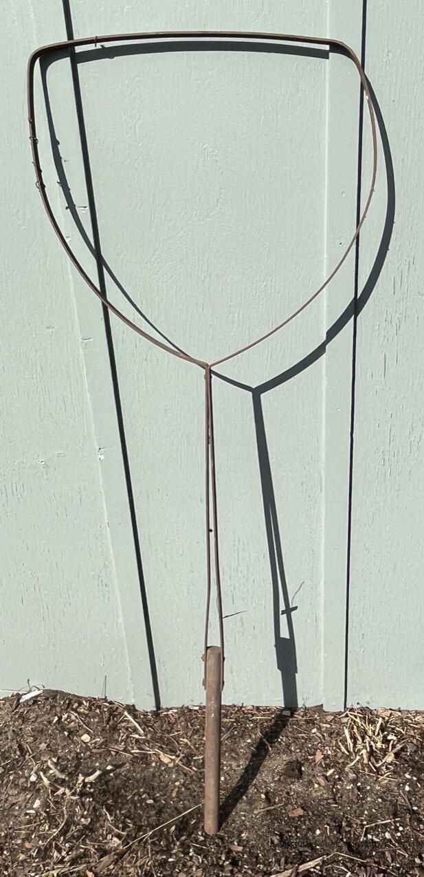 Metal tool with 16-inch metal blade in a flattened loop shape. This tool is too large and has too light a shaft for scuffle weeding so it may have been used to smooth soil or gravel. Three-quarter inch flat blade is not sharp. Possibly a net bag was attached to loop so tool was used to harvest fruit.