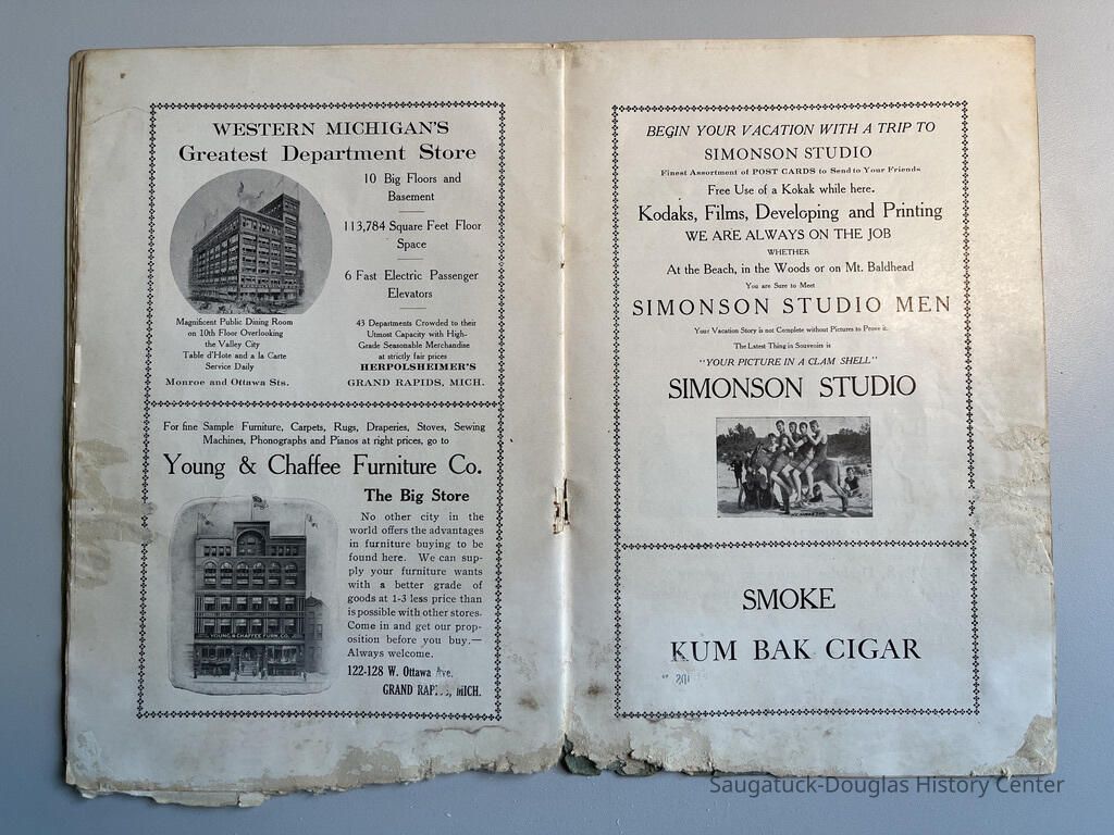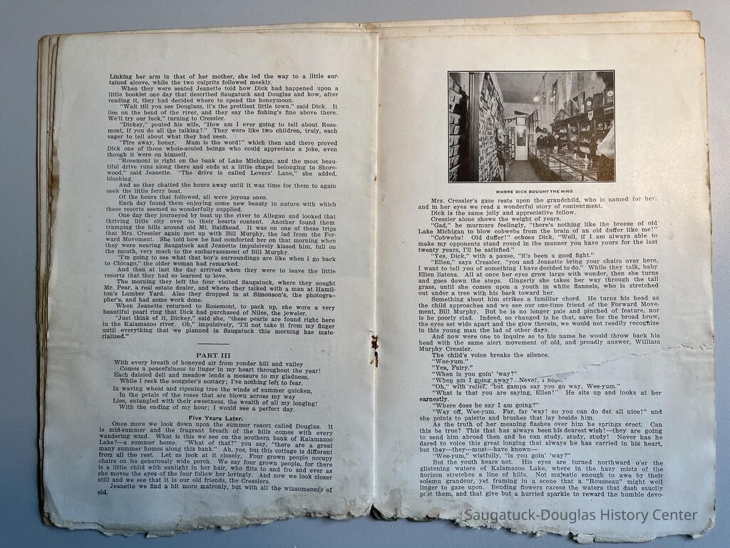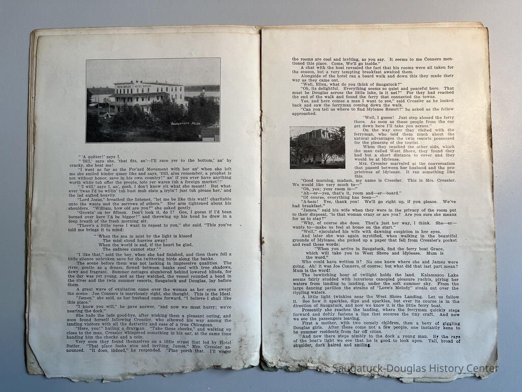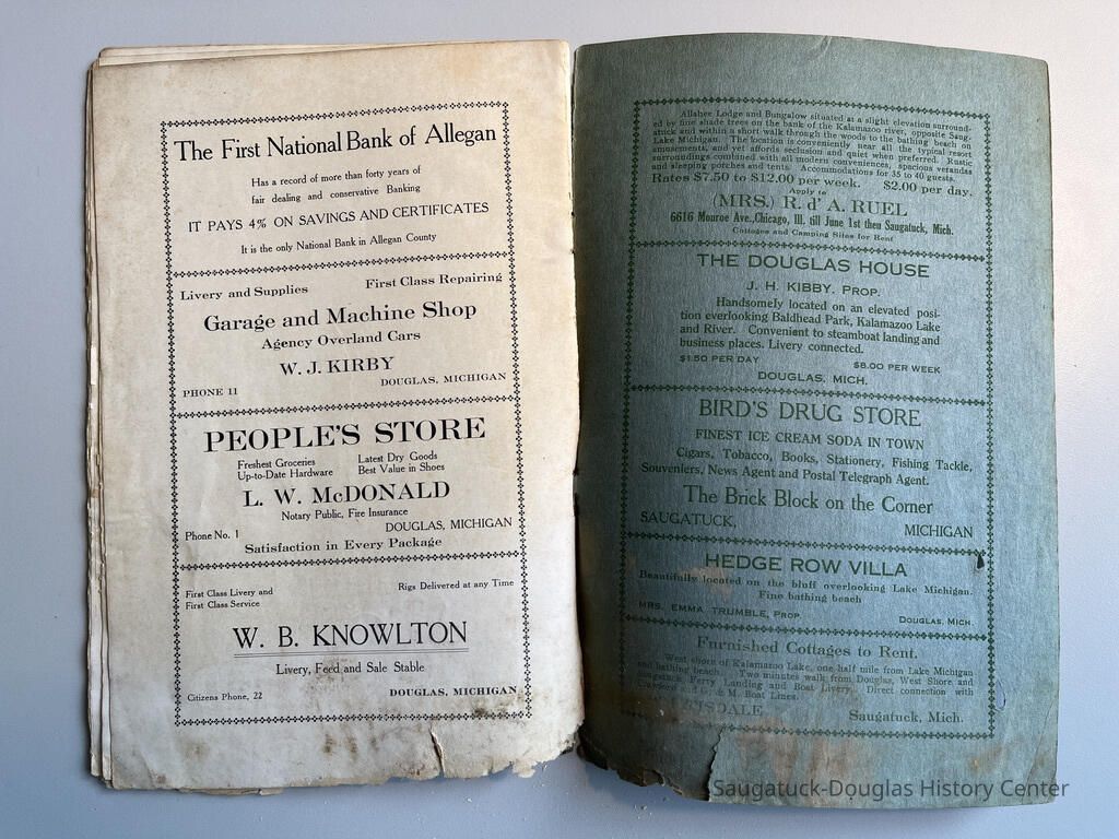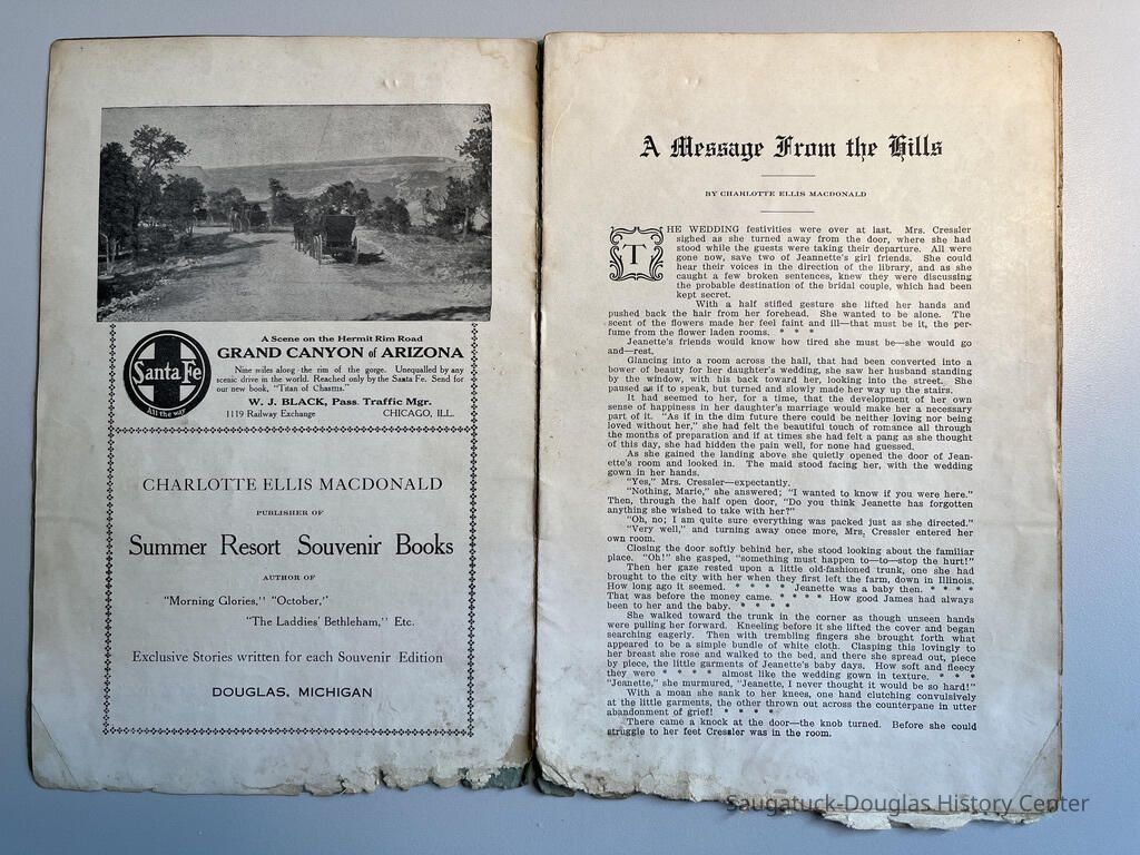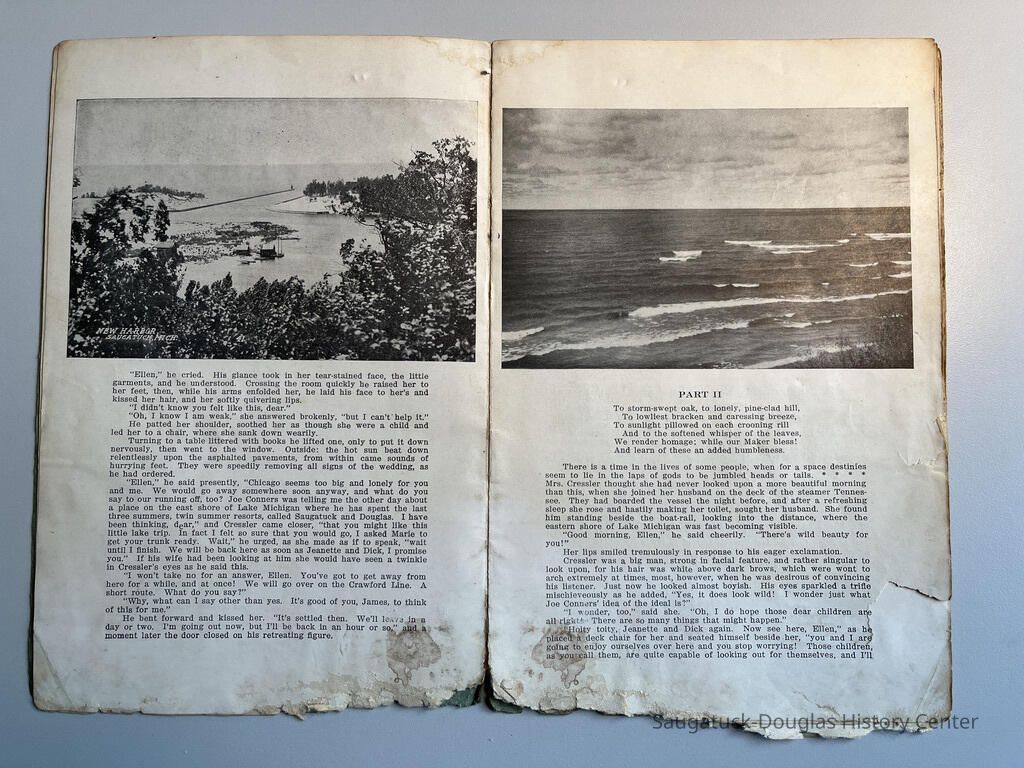 Booklet is loaded with ads from local tourist-trade businesses and Simonson postcard images. "Then there was a Mrs. McDonald in Douglas, mother of Claude and sister-in-law of Mrs. McDonald of the funeral home. She wrote short novelettes that were printed in folders advertising Saugatuck as a resort. They were all romantic in theme." -Jeanette Barr of Port Washington, Wisconsin, the daughter of Dr. R. J. Walker, in a 1976 letter to Kit Lane reprinted in SDHS newsletter insert pg 284.