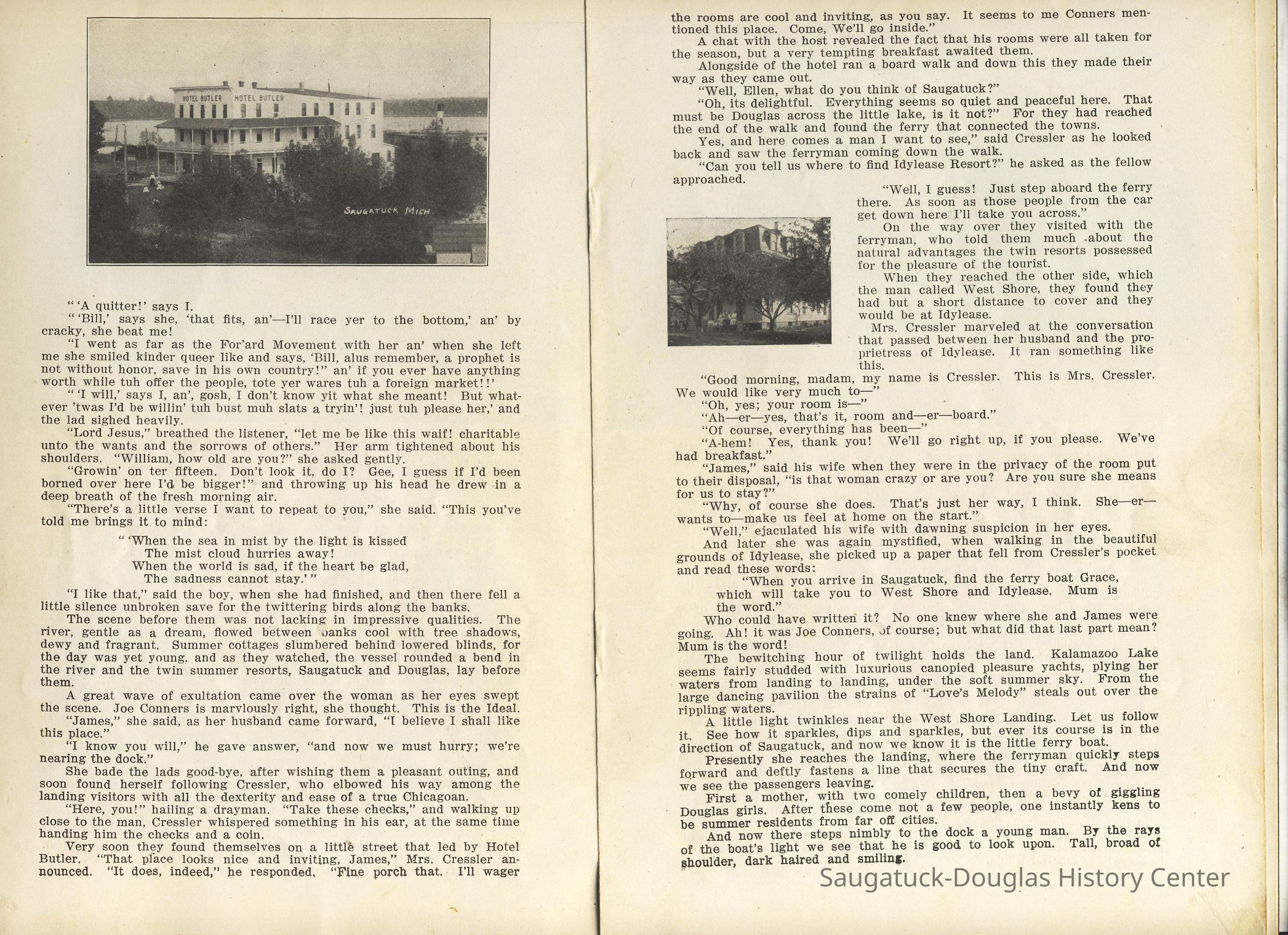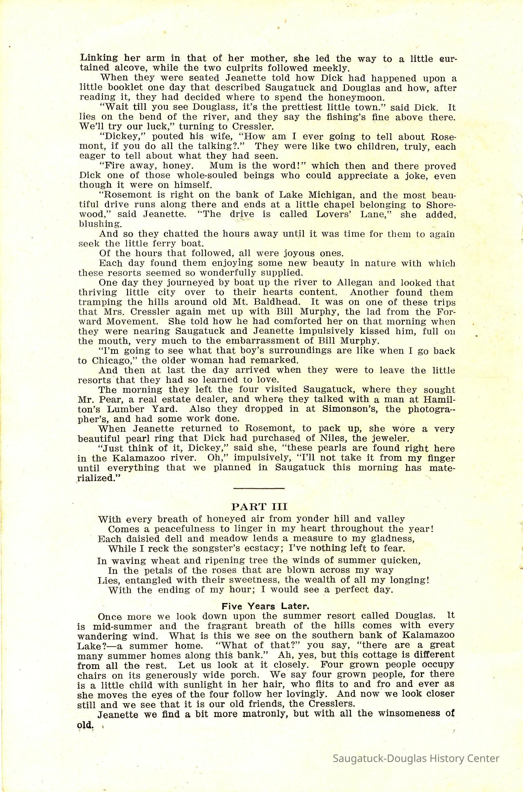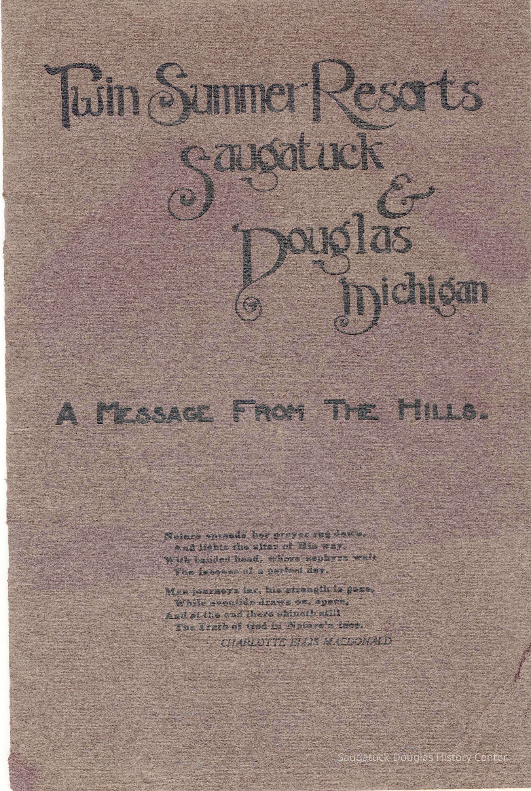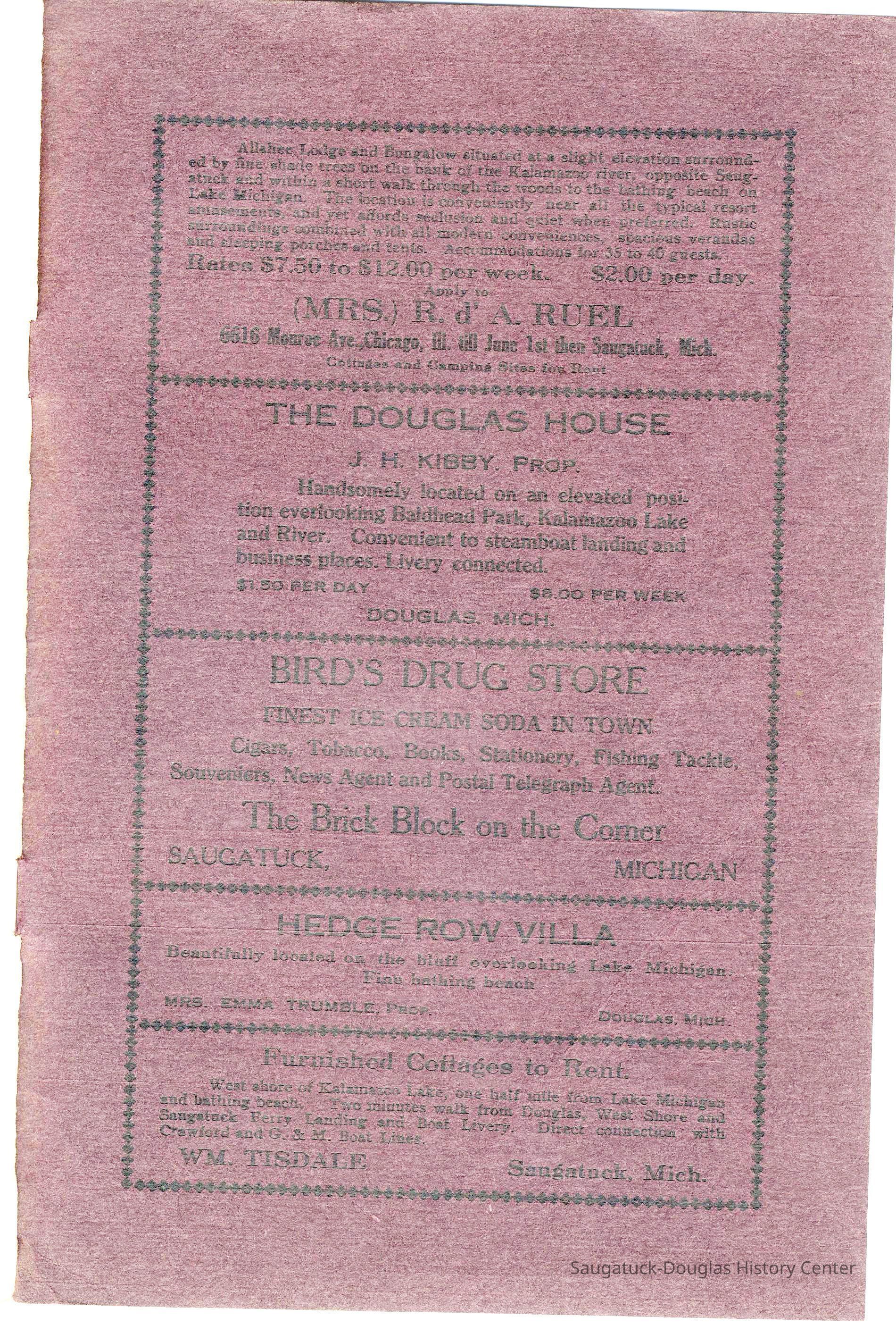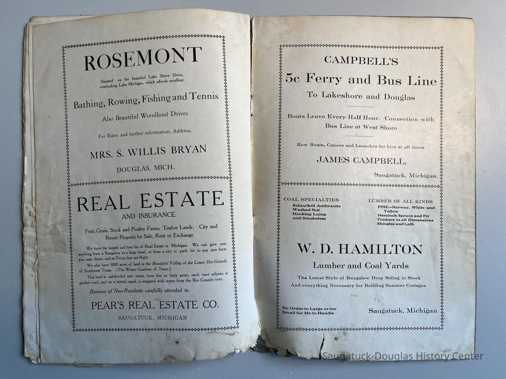 Booklet is loaded with ads from local tourist-trade businesses and Simonson postcard images. "Then there was a Mrs. McDonald in Douglas, mother of Claude and sister-in-law of Mrs. McDonald of the funeral home. She wrote short novelettes that were printed in folders advertising Saugatuck as a resort. They were all romantic in theme." -Jeanette Barr of Port Washington, Wisconsin, the daughter of Dr. R. J. Walker, in a 1976 letter to Kit Lane reprinted in SDHS newsletter insert pg 284.