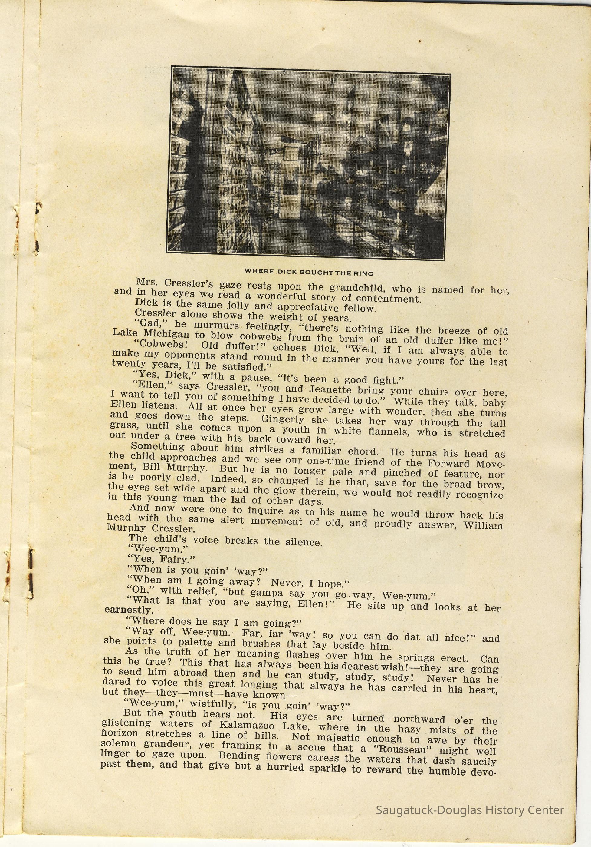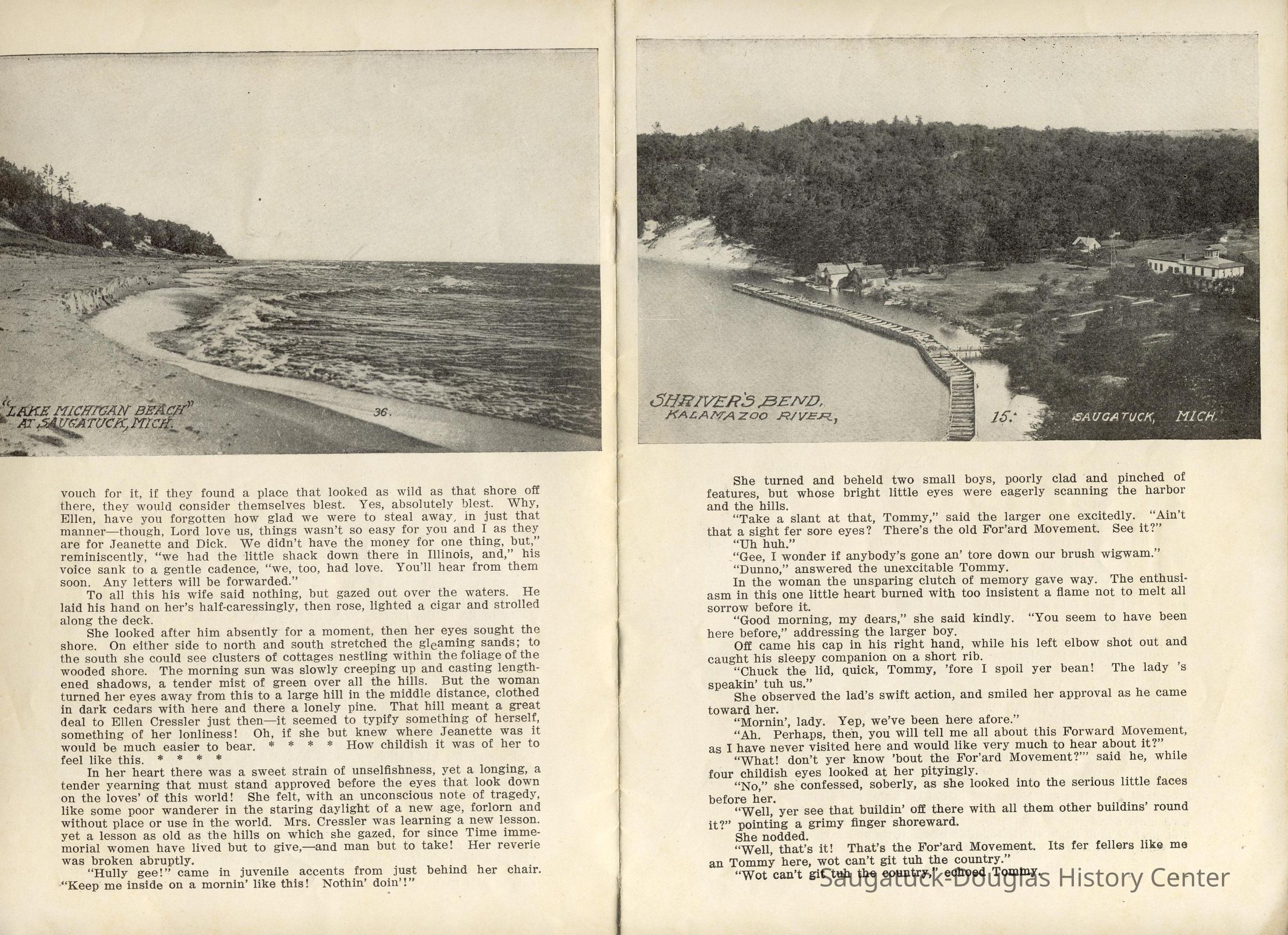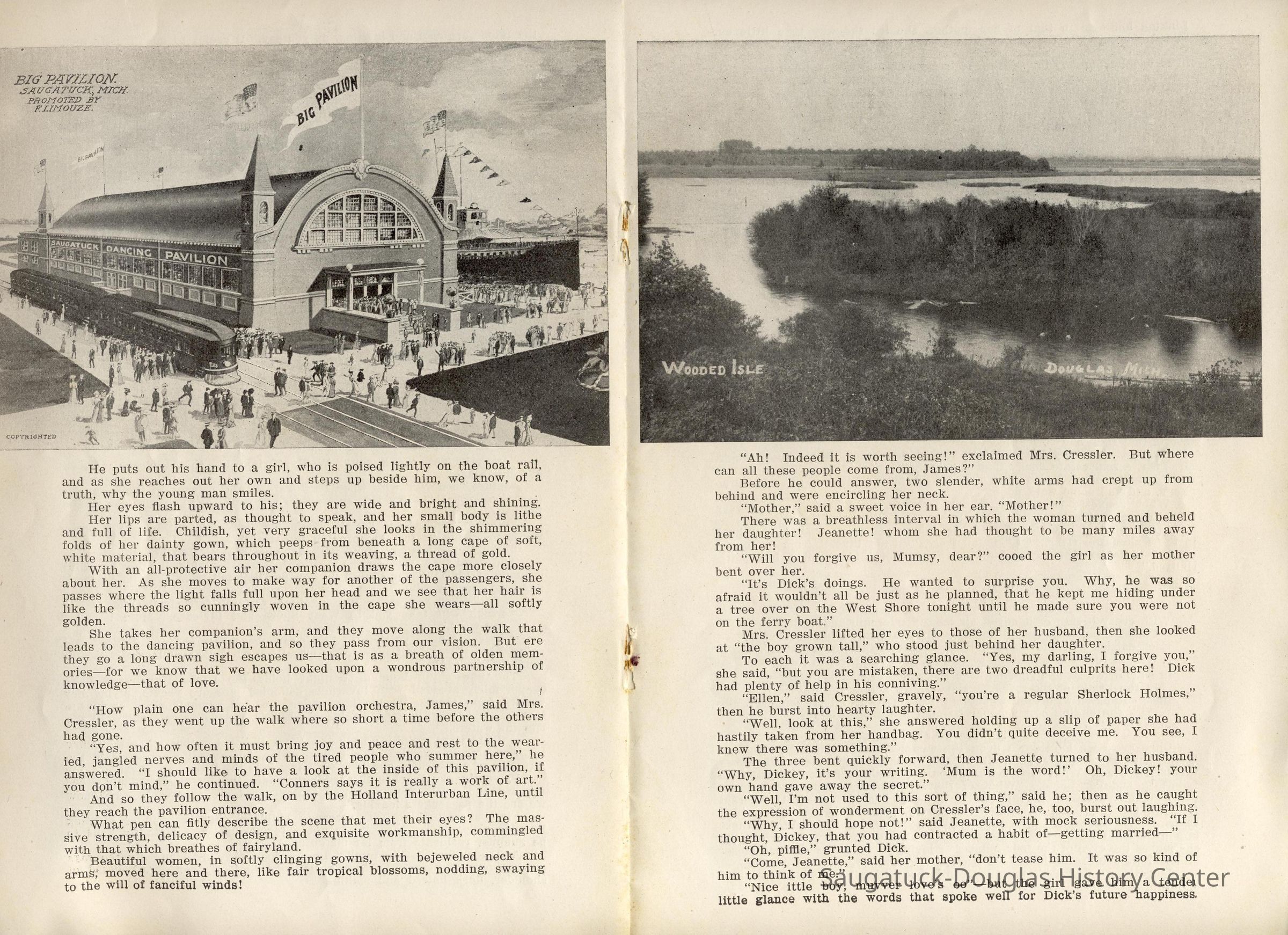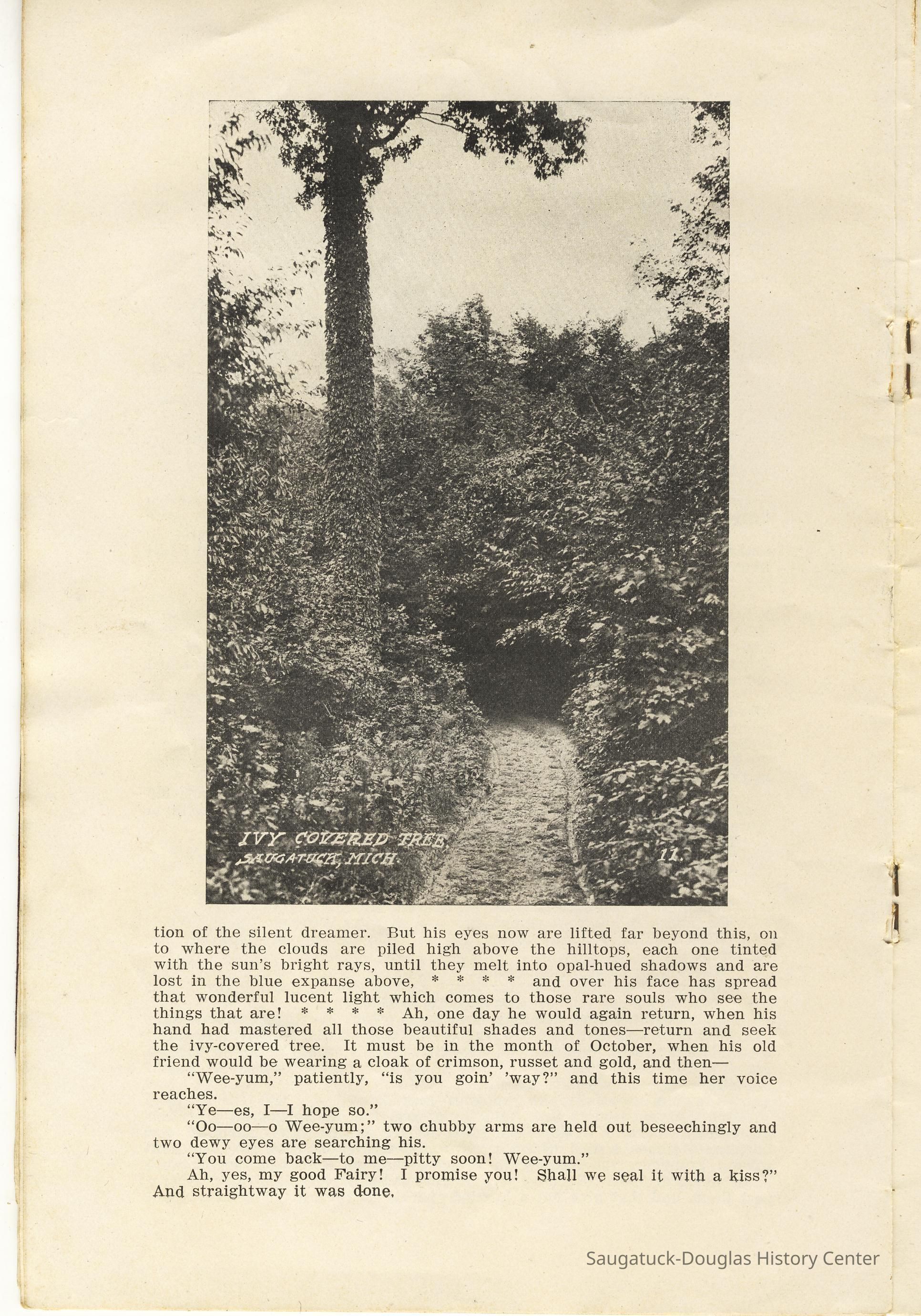 Booklet is loaded with ads from local tourist-trade businesses and Simonson postcard images. "Then there was a Mrs. McDonald in Douglas, mother of Claude and sister-in-law of Mrs. McDonald of the funeral home. She wrote short novelettes that were printed in folders advertising Saugatuck as a resort. They were all romantic in theme." -Jeanette Barr of Port Washington, Wisconsin, the daughter of Dr. R. J. Walker, in a 1976 letter to Kit Lane reprinted in SDHS newsletter insert pg 284.
