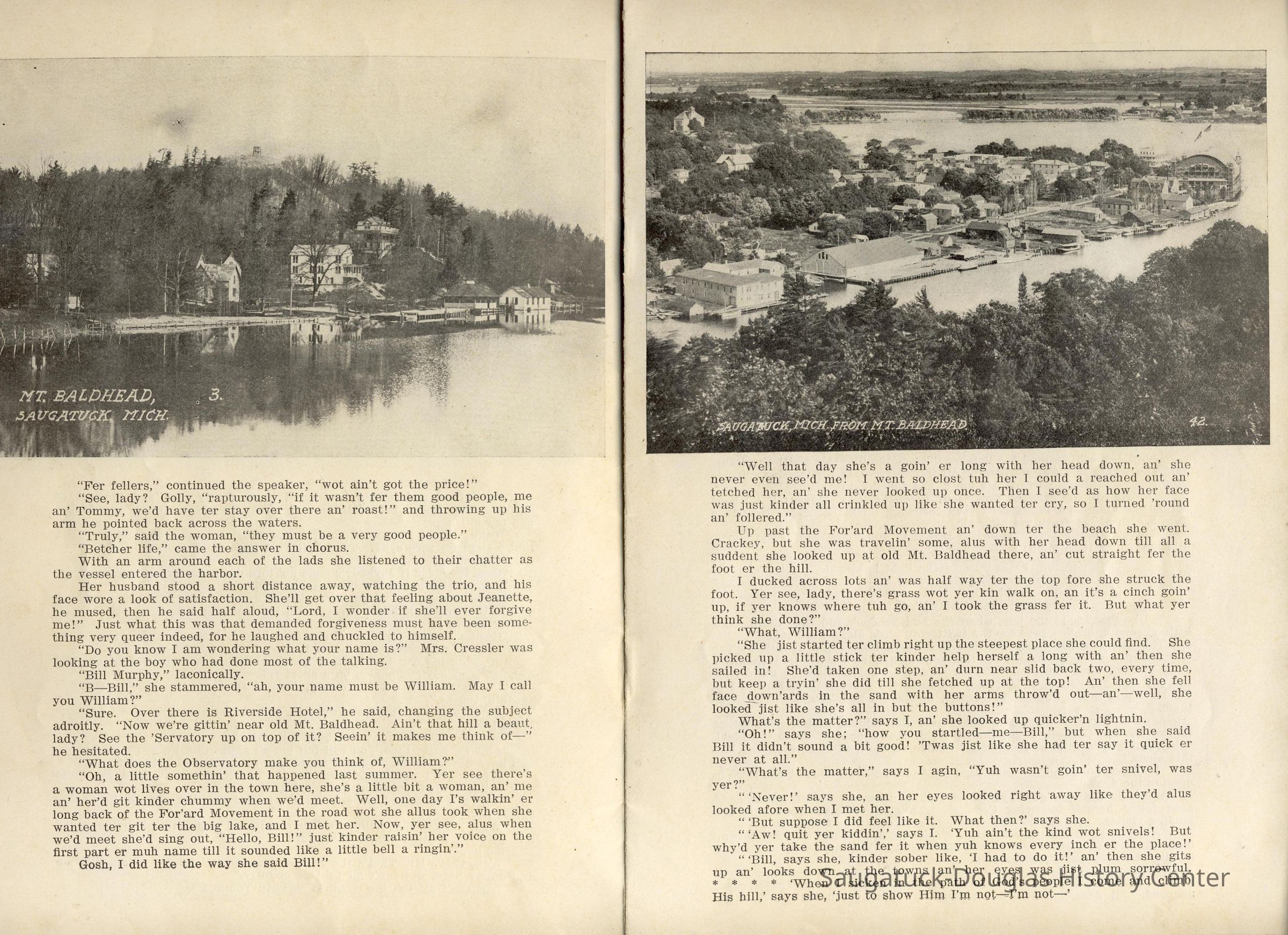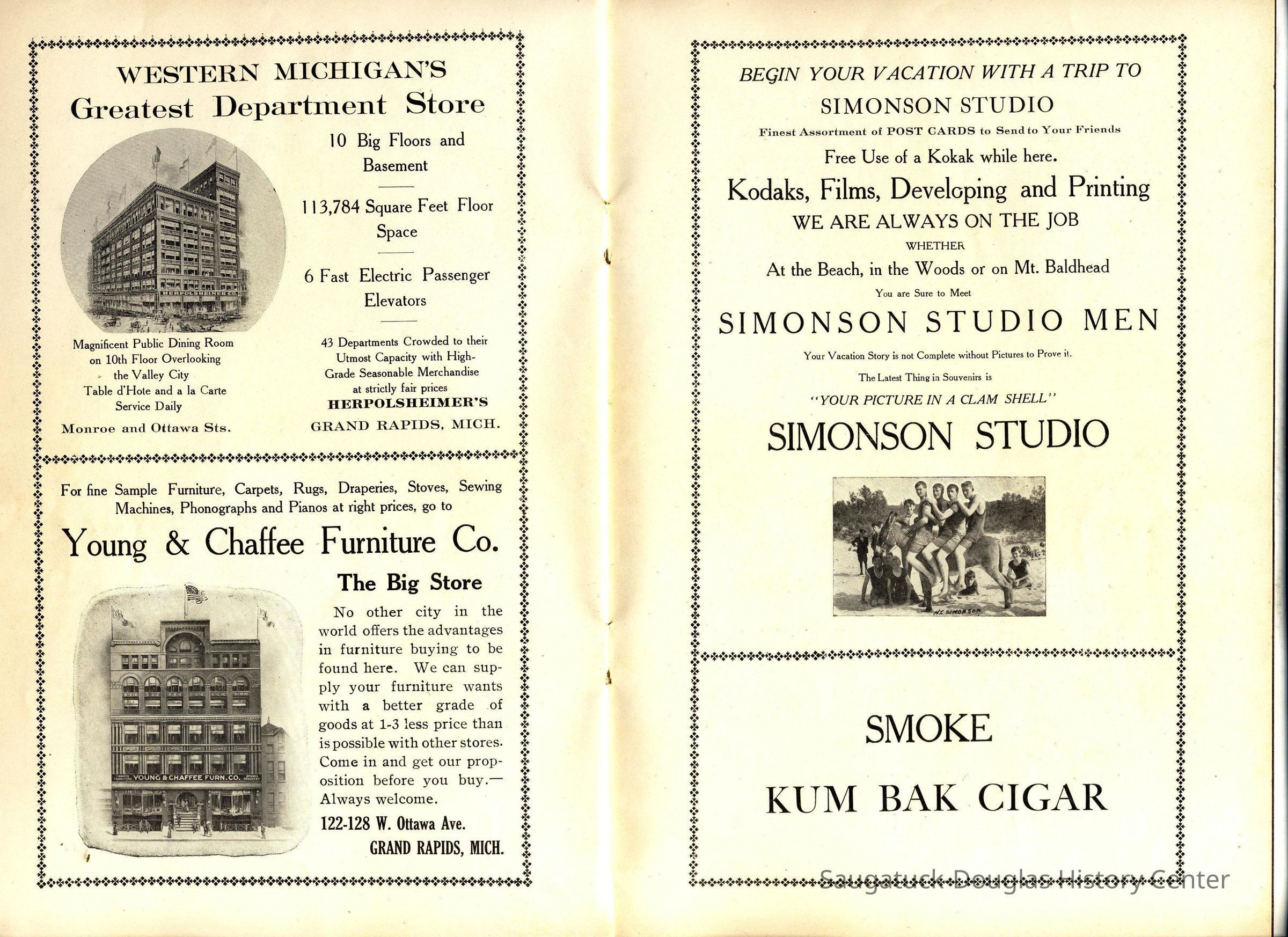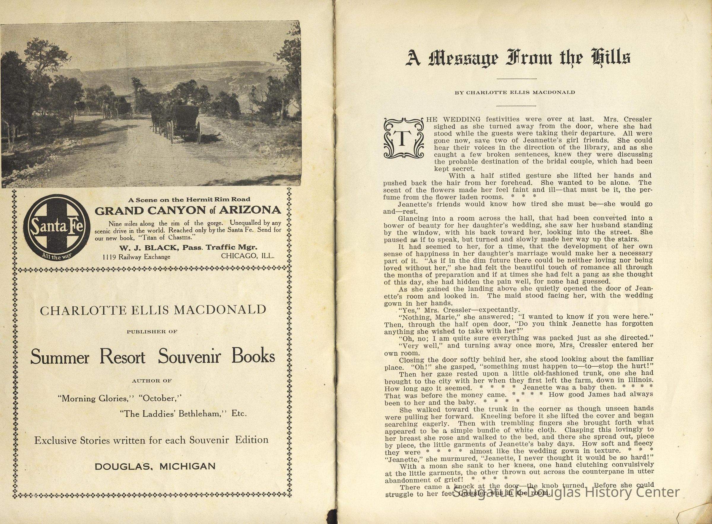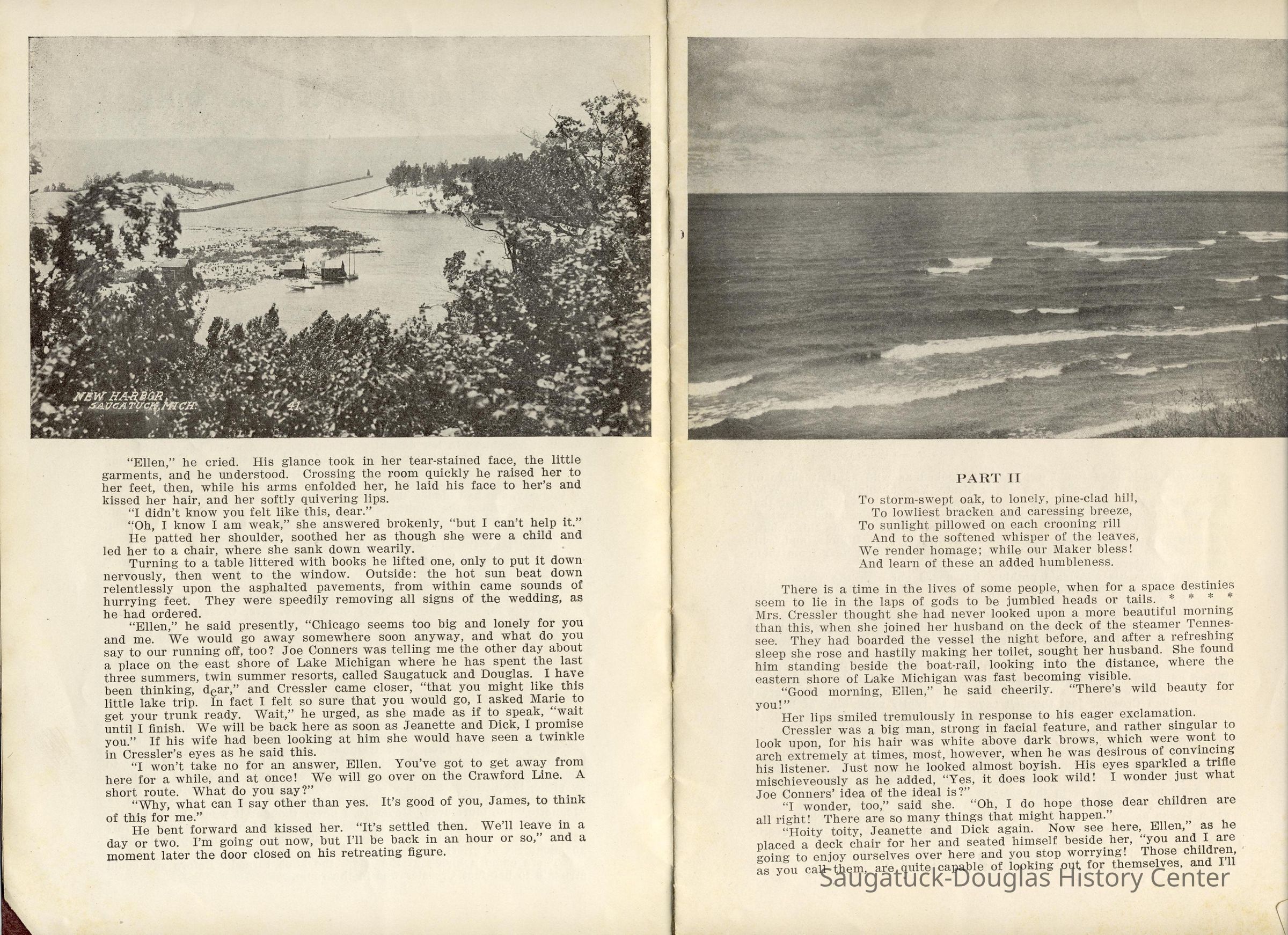 Booklet is loaded with ads from local tourist-trade businesses and Simonson postcard images. "Then there was a Mrs. McDonald in Douglas, mother of Claude and sister-in-law of Mrs. McDonald of the funeral home. She wrote short novelettes that were printed in folders advertising Saugatuck as a resort. They were all romantic in theme." -Jeanette Barr of Port Washington, Wisconsin, the daughter of Dr. R. J. Walker, in a 1976 letter to Kit Lane reprinted in SDHS newsletter insert pg 284.