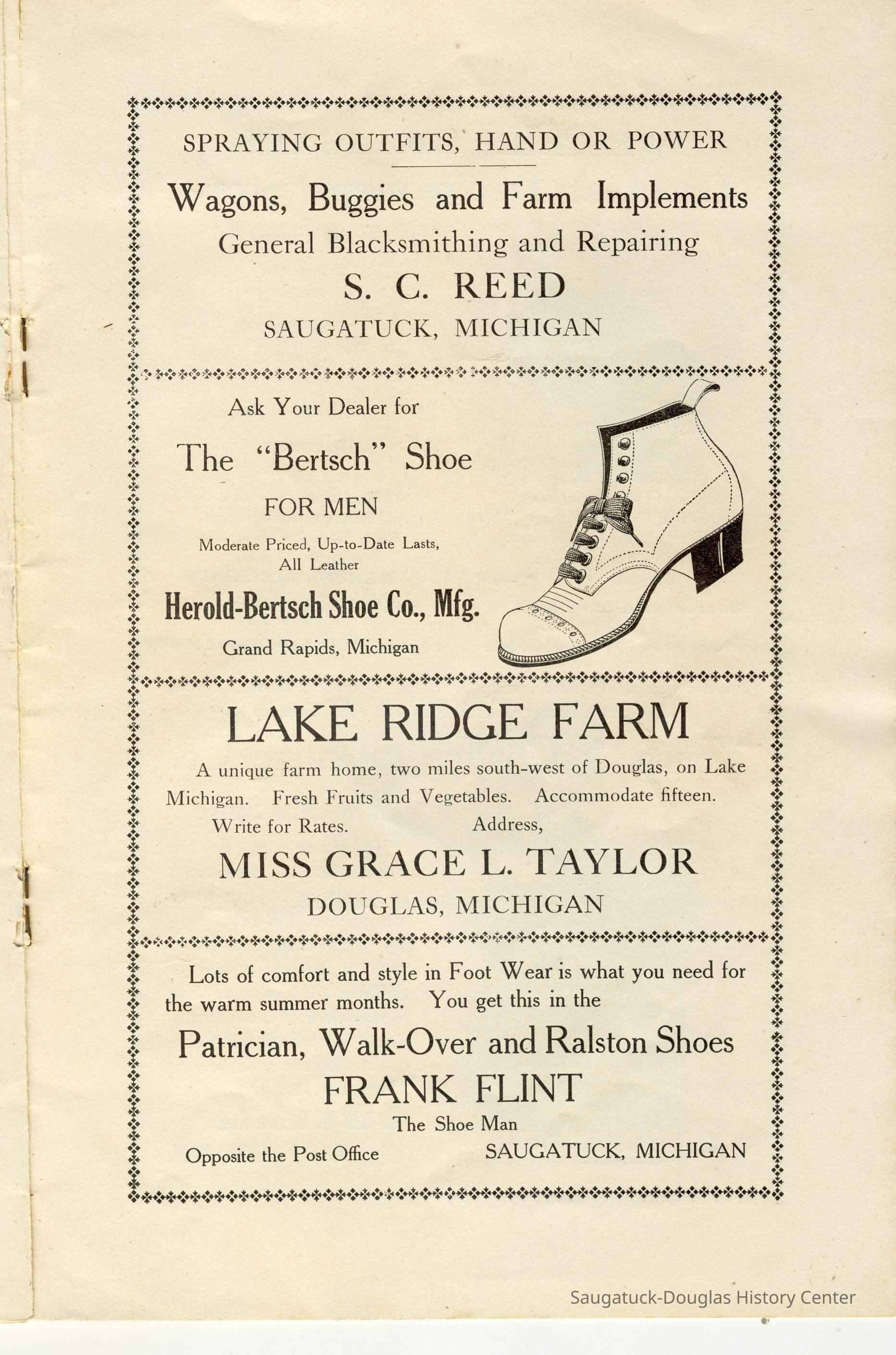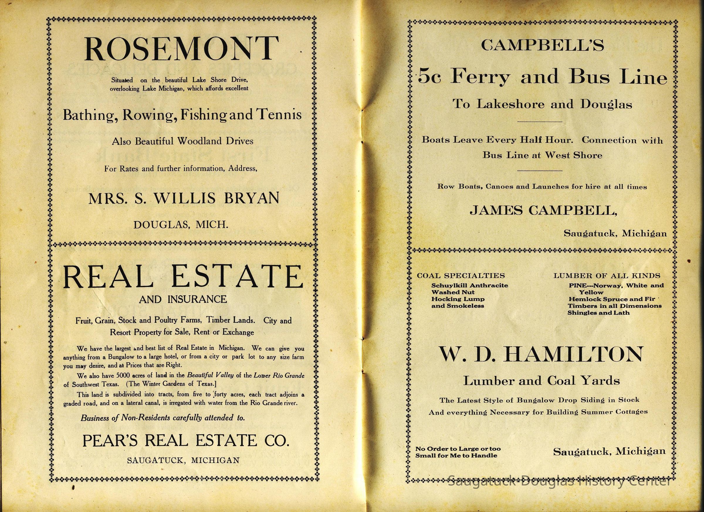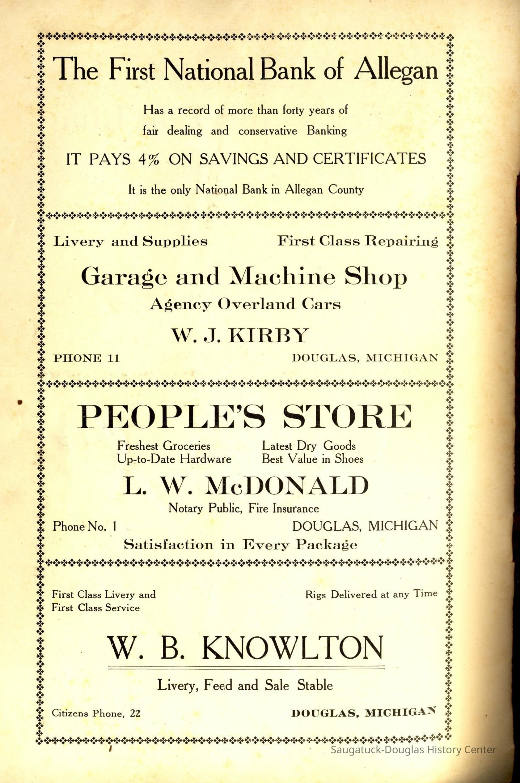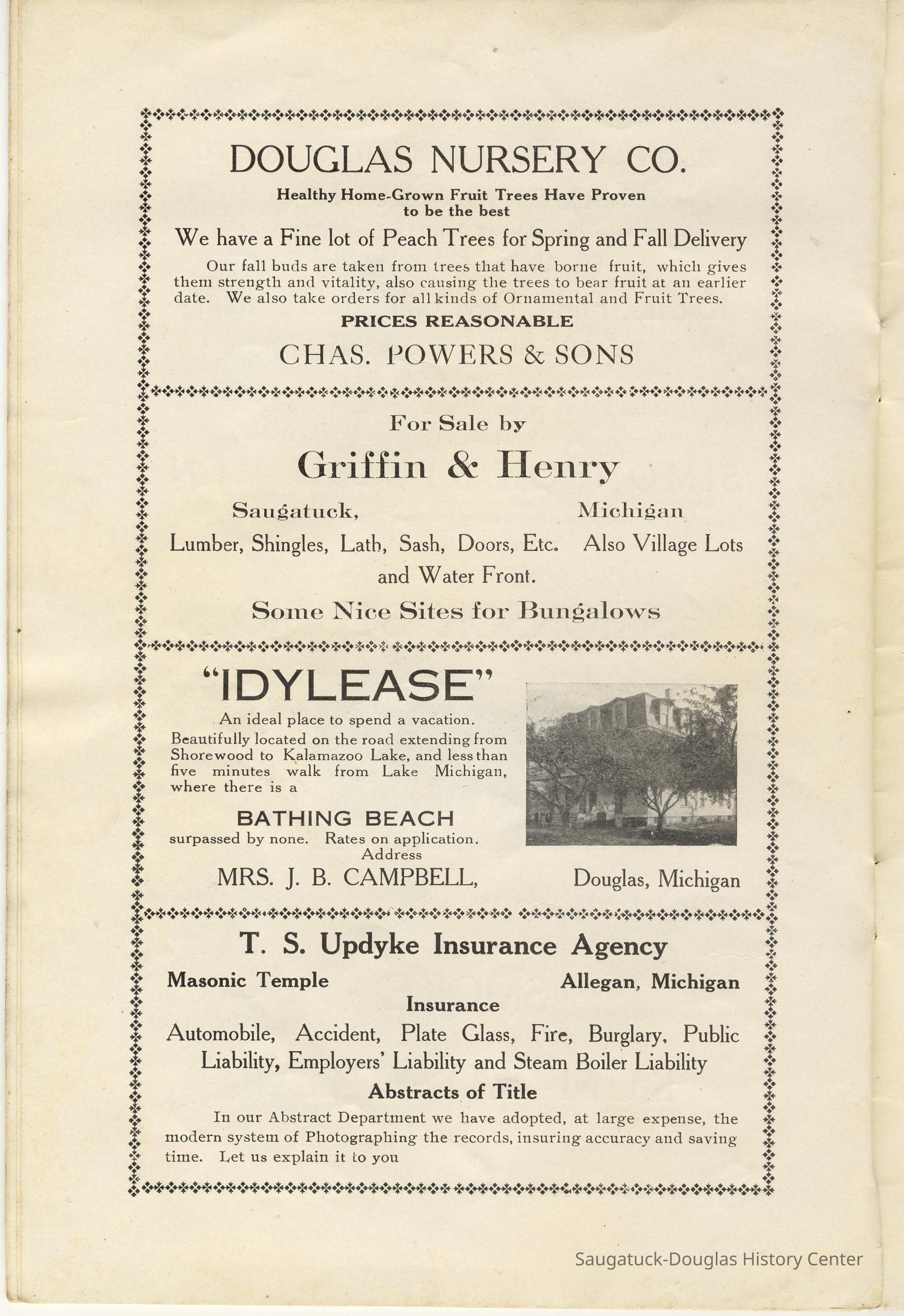 McDonald, Louis WinfredReed, Samuel Caleb 1848-1923442 Park/High Camp/Allahee LodgeSergeant Marine/Saugatuck Lumber and Coal Co./W.D. Hamilton Lumber and Coal Company653 Campbell Road/Valentine Lodge/IdyleaseKirby, John 1829-1882Hamilton, Walter D. 1862-1916Trumble, Mrs. E.Campbell, James M. 1862-1915Kibby, Jervis H. 1843-1933Flint, Frank W. 1882-1953306 Butler/Landsharks/Tripp's/Kruger's/C.E. Bird's/Ensign Drug Store/Wilcox Building19 S. Washington/Douglas House and Tavern/Eagle Hotel/Wades HotelH.A. McDonald Central Store, Douglas (not McDonald's People's Store)Lake Ridge FarmKnowlton, W.B.L.W. Mc Donald's People's Store/Gerber BuildingTaylor, Grace Lillian 1865-1931Rosemont Inn/Rosemont Lodge/Rose MontSimonson Studio businessMize Rose Garden north side/Fruit Growers State Bank/Clapp's Grocery/Flint's Shoes/Walz Meat Market/Griffin/TannerMcDonald, Henry Ambrose 1850-1925314 Butler/Olive Mill/Huff Antiques/Jarvis/Niles Jewelery StorePowers, Charles c1847-1929Bryan, Ellen Sirena (Olsen) 1861-1938Crawford Transportation CompanyCampbell's 5 Cent Ferry and Bus LineGriffin & Henry Lumber Yard/Griffin & Henry Sawmill/Griffin & Williams/Stockbridge & Johnson/Wells & Johnson/M.B. Spencer MillPear's Real Estate CompanyClapp, Ralph W. 1874-195340 Butler/Hotel Butler/Grist Mill/Haymarket/Dutch windmillTisdale, William Graham Sr. 1838-1907