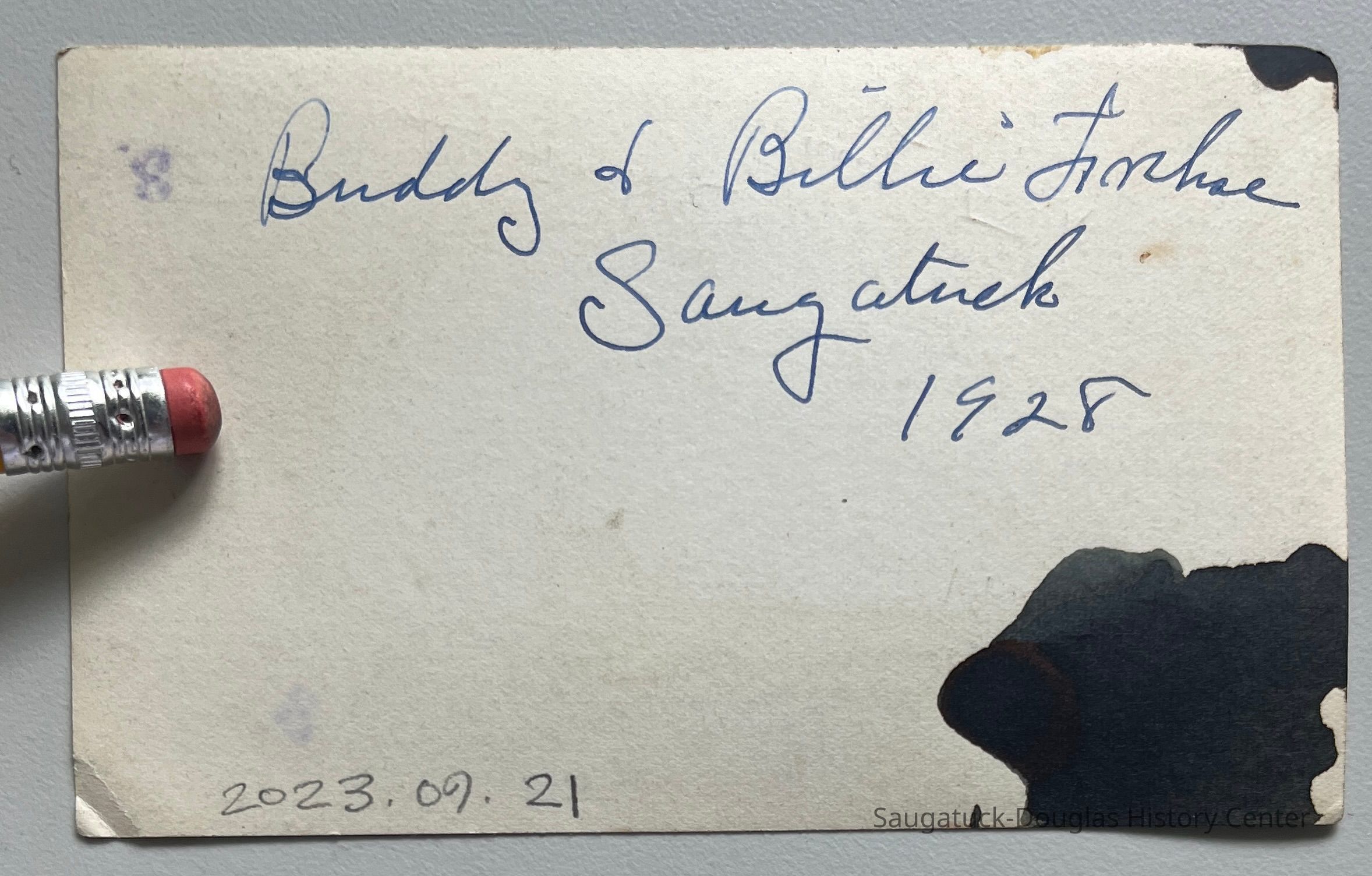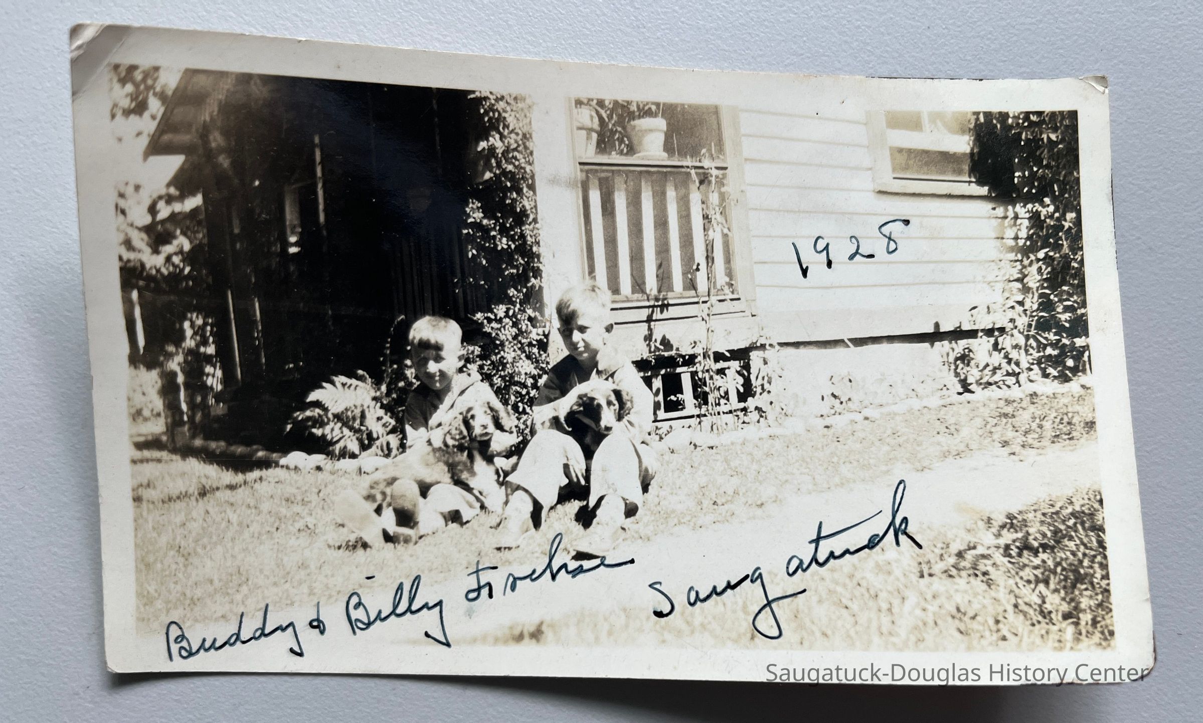 Buddy (Charles R. Frehse 1917-?) and Billy Frehse as boys, seated on a lawn and holding puppies. Marked "Saugatuck 1928"