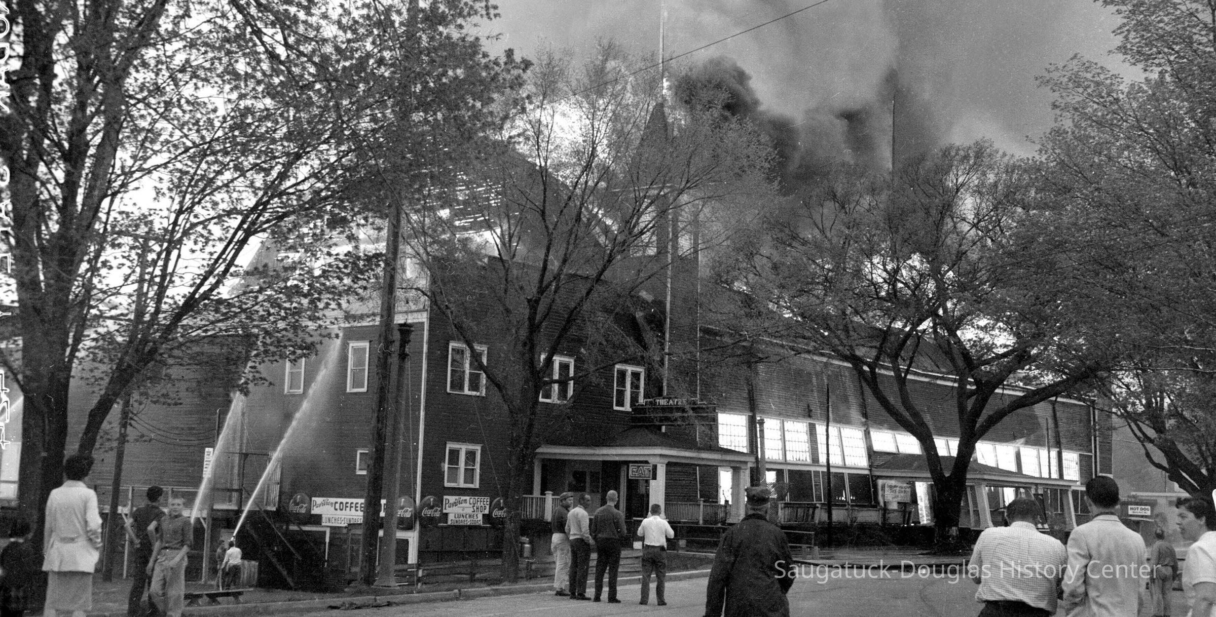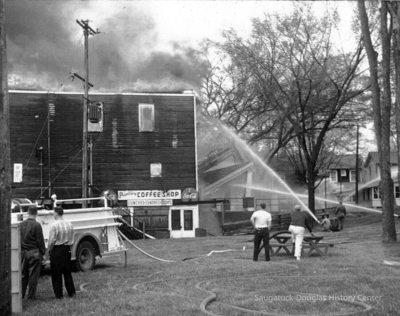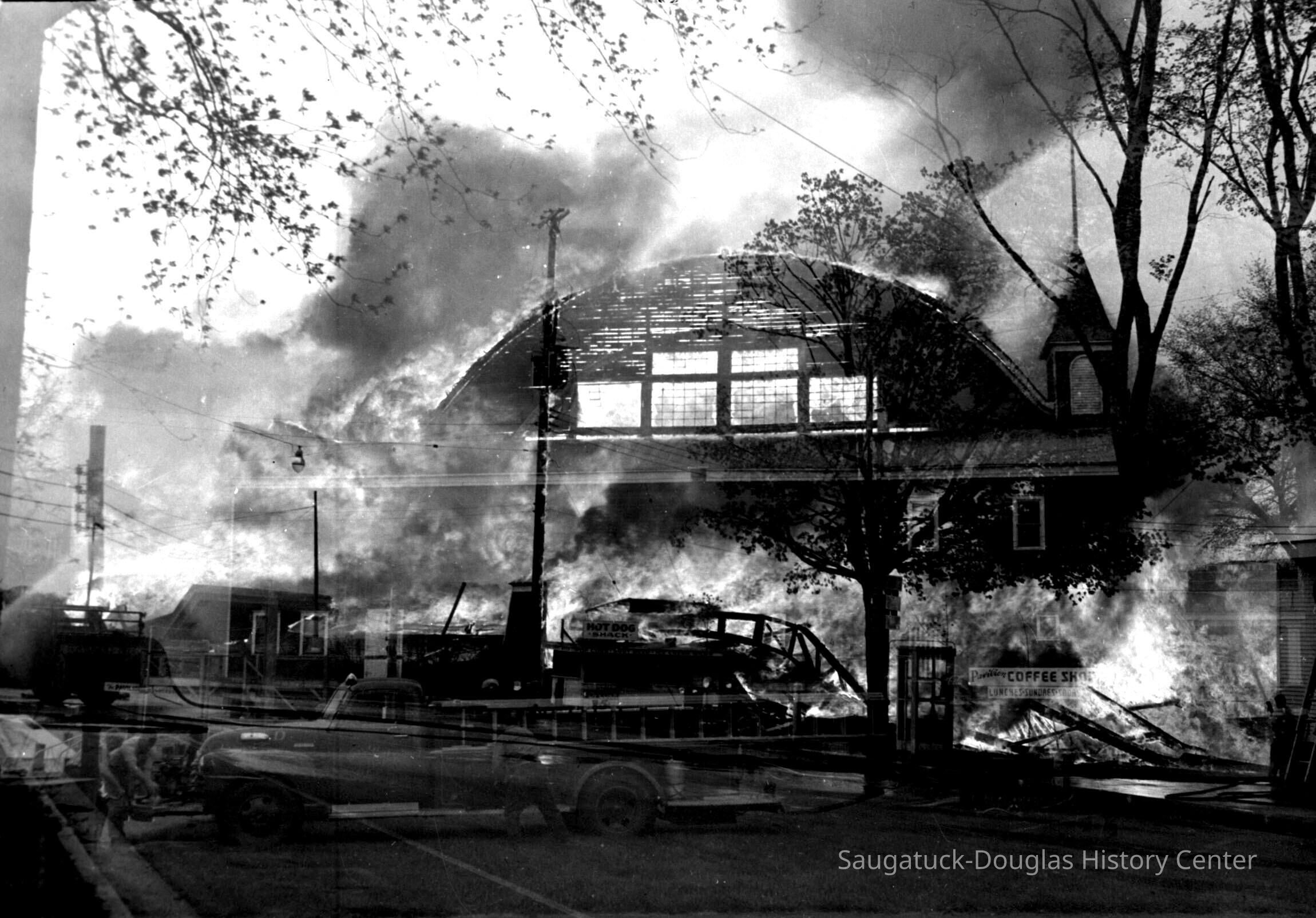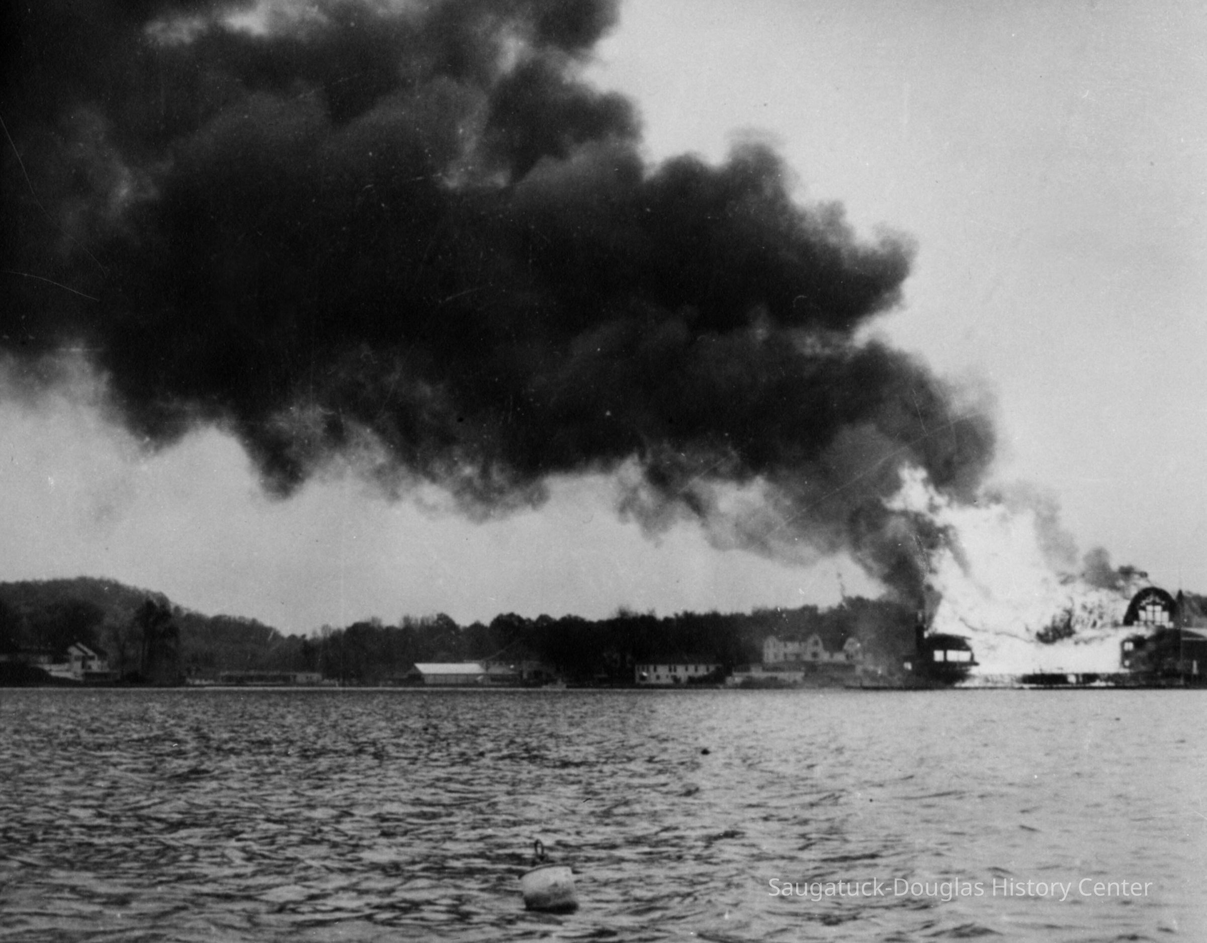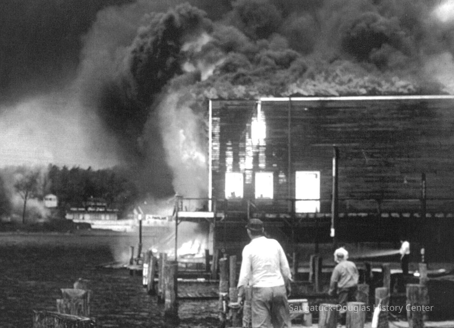 THE BIG PAVILION – DEATH BY FIRE Friday morning, May 6, 1960, a persistent breeze waltzed briskly from the west, then turned to the southeast. The Big Pavilion’s fifty-first season opening loomed three weeks away. Manager Jack Repp was out to tell village maintenance boss Newnham to turn on the water and then negotiated the summer advertising rates with the Commercial Record. From his Chicago office, owner Herb Shutter ordered red paint for the summer paint job. Somewhere among the thousands of light sockets and miles of 1909 wiring, a cancerous short had sparked…. maybe. The Big Pavilion had minutes to live. In the Hotel Saugatuck next door, Viola Fox tallying last nights receipts answered the phone. From across the river, the caller could see smoke coming from the building. Vi punched the in-house direct-line alarm button to the Village fire hall. But it was already too late, as fire chief Bill Wilson smashed through the Dock Bar door, flames churned skyward and inky smoke boiled over the eaves of the towering dock-side wall. The beloved barn was already a funeral pyre. The only doubt was how much of Saugatuck would survive. Luck of the draw wind swept blast furnace heat and burning embers westward, out over the river and ten fire departments, hoses streaming river water, were able to contain the conflagration. So in mere hours, a Saugatuck legend, “the brightest spot on the great lakes” was distilled to blackened rubble. Symbolically, like her birth, death of the red dance hall was bigger than life, a brilliant burst of light and excitement, followed by the wonder of it all. By Jack Sheridan