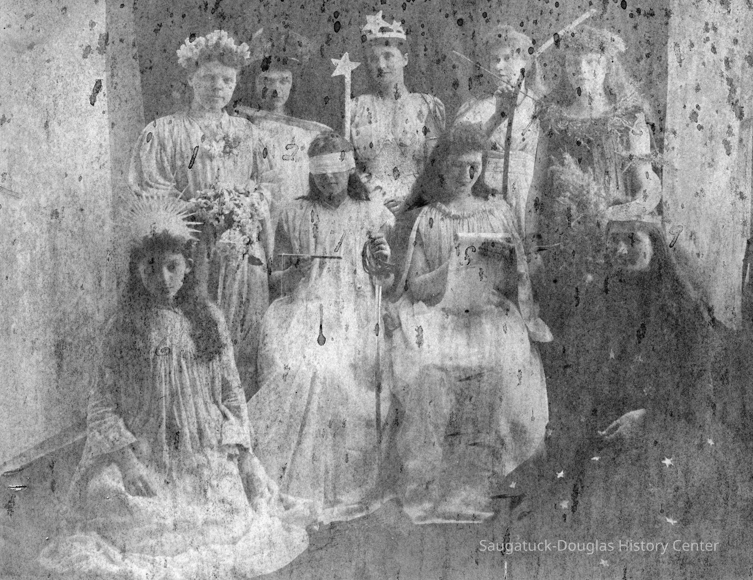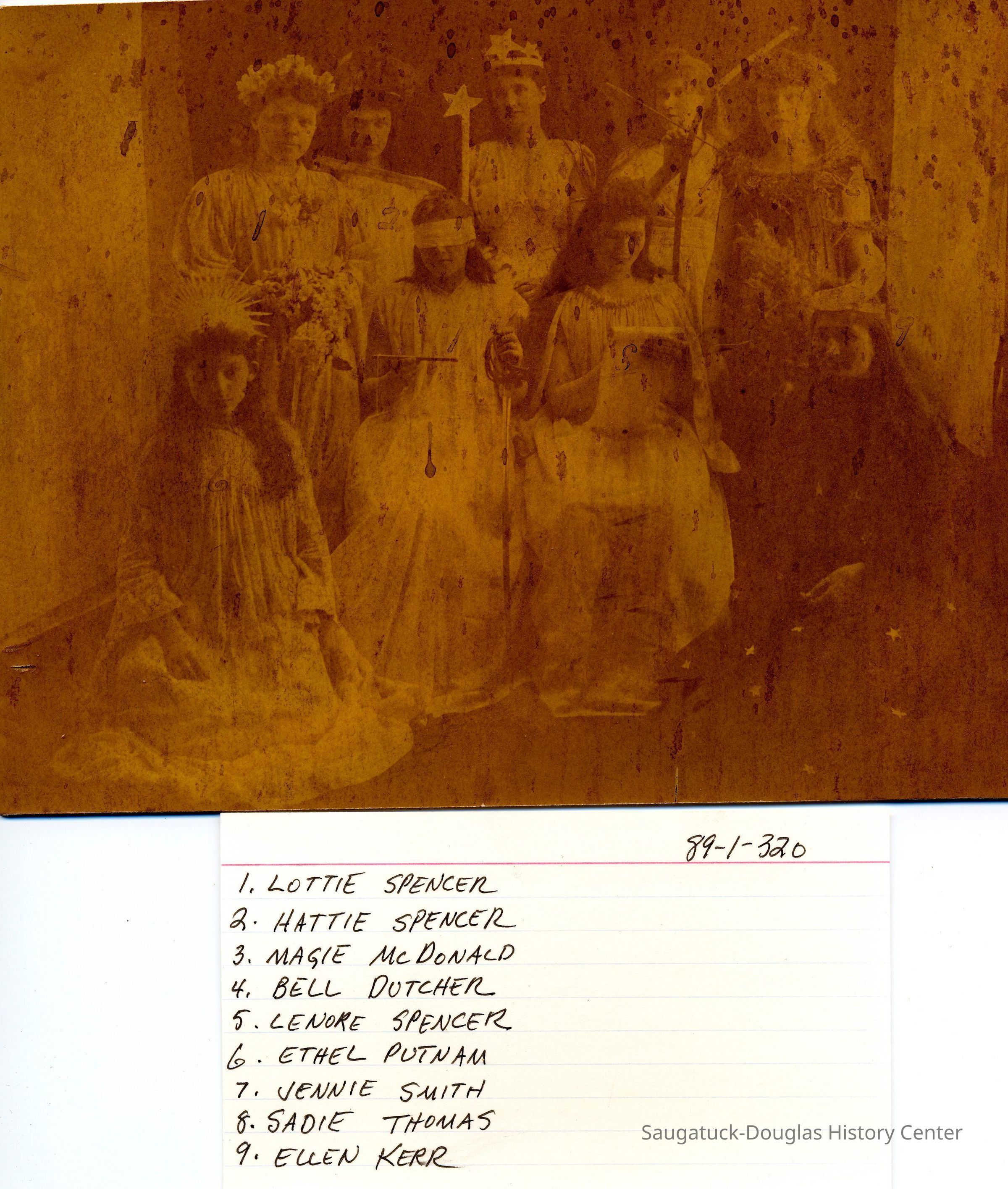 Notation indicated the sitters are Lottie Spencer, Hattie Spencer, Magie McDonald, Bell Dutcher, Lenore Spencer, Ethel Putnam, Jennie Smith, Saide Thomas and Ellen Kerr.