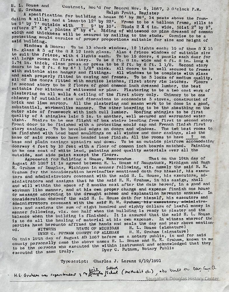 Copy of typescript of 1867 agreement to build the House house, typescript by Charles L. Lorenz