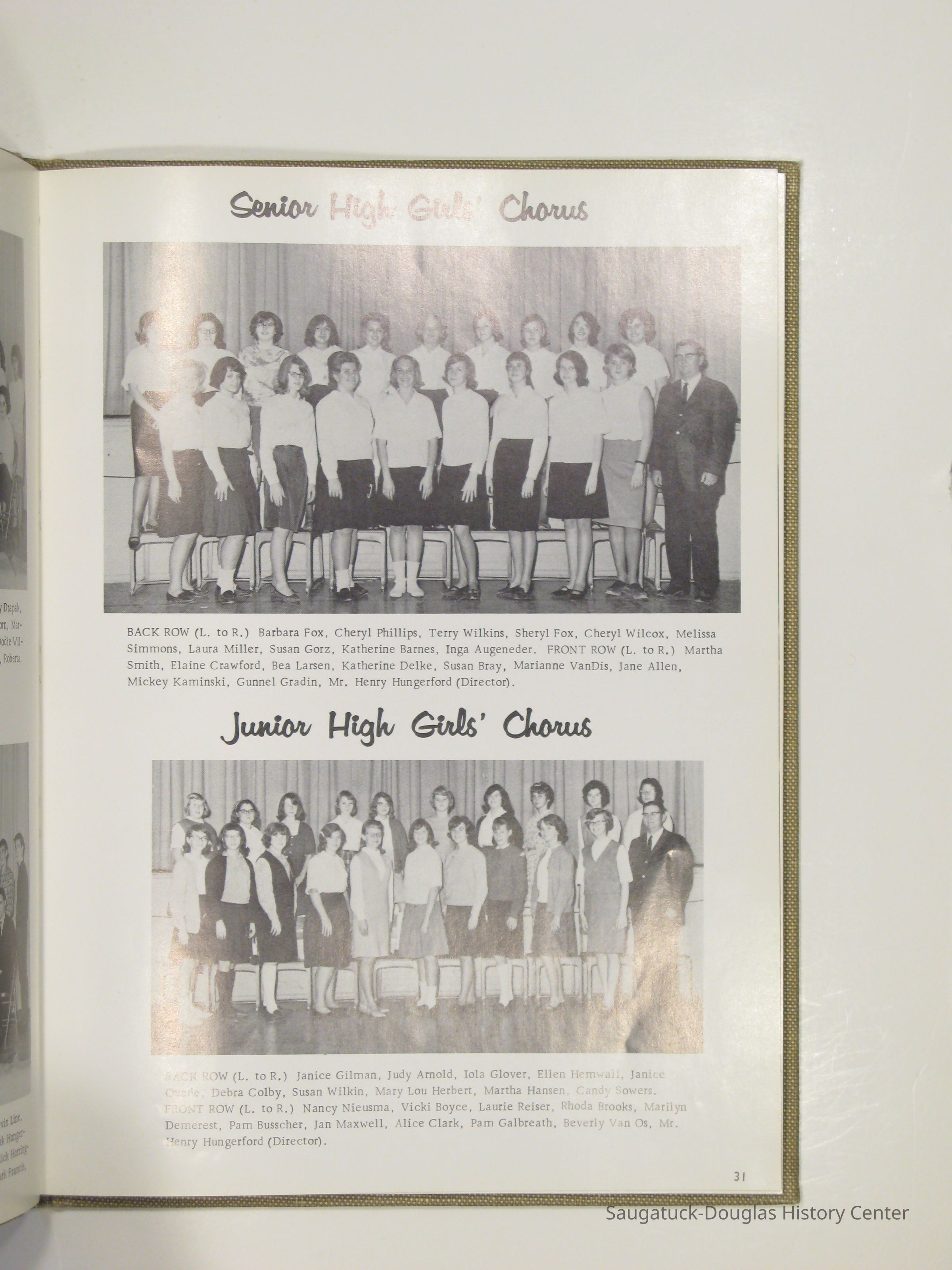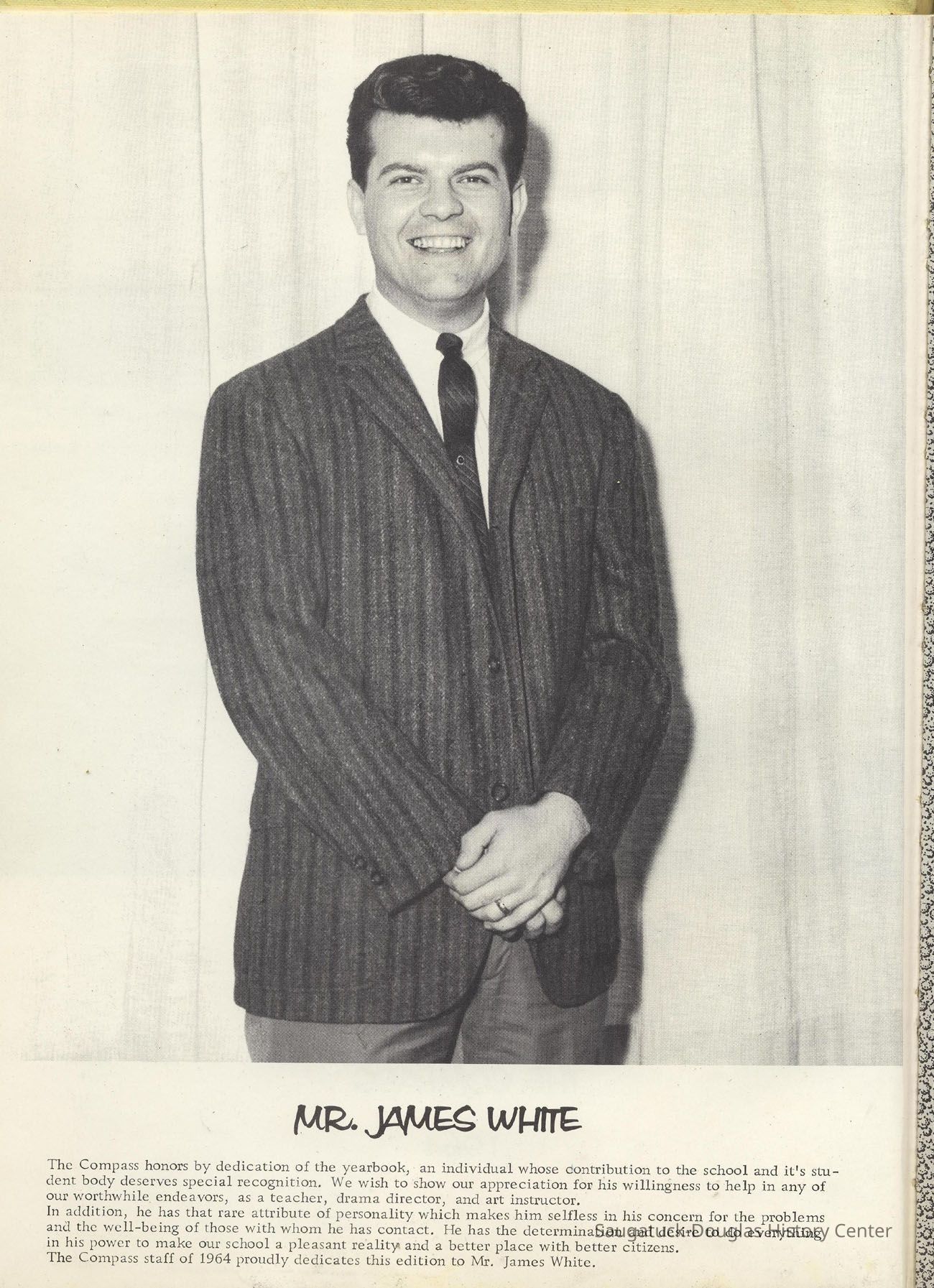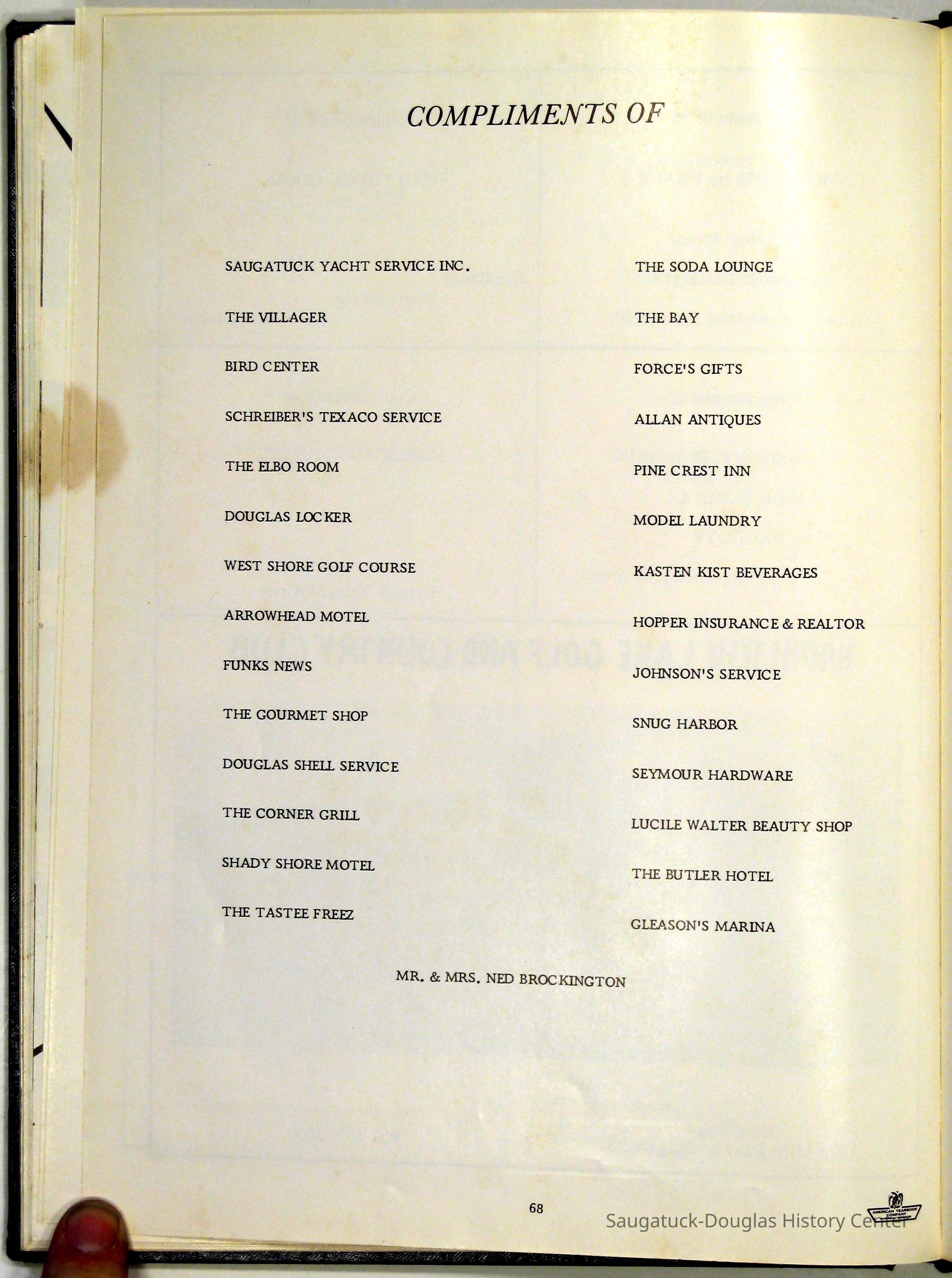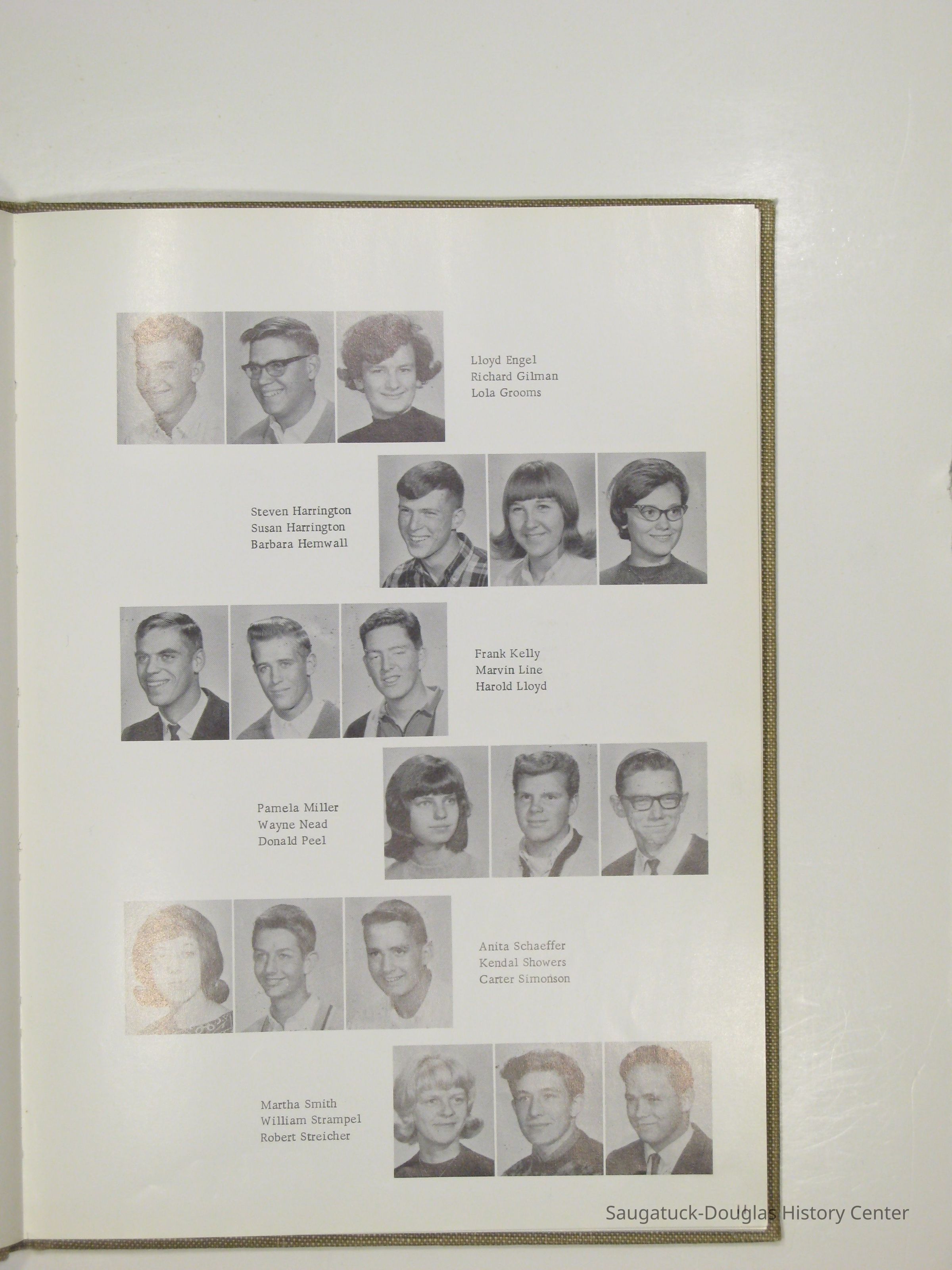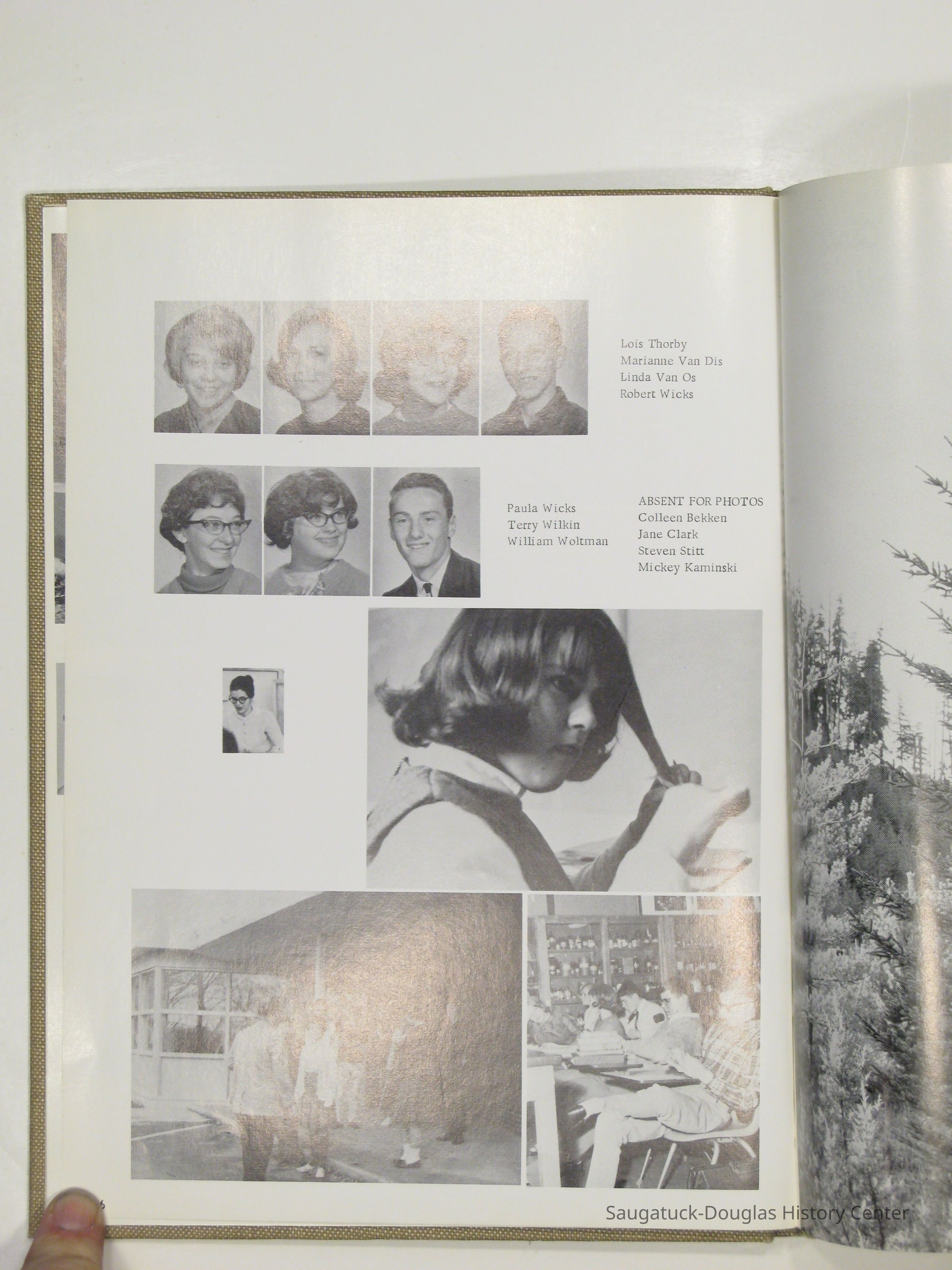 Three "Compass" Saugatuck High School yearbooks from 1963 (blue cover), 1964 (beige cover) and 1965 (brown cover). Also images of the yearbook's pages photographed by Chris Yoder in 2008.