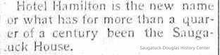 Built in 1852, the Saugatuck House is believed to be the first purpose-built lodging establishment in the village. It later was renamed the Hotel Hamilton. The structure was disassembled in 1913 to make way for the Parrish Drug Store at 201 Butler Street. According to Jim Schmiechen in "Raising the Roof" 2nd ed., page 6, "The staff lines up for public inspection — from the cleaning lady on the right to the hotel barber (or barman) on the left. Is that Mrs. Cordelia Keltner, the proprietress seated near the entrance? The village's first hotel, stage stop, and virtual village center, was built on land donated by a local resident who wished to relieve village residents of the burden of boarding visitors. Its motto was "feed the hungry and rest the weary." Saugatuck House was often a beehive of political and social activity and controversy — including some heated exchanges over the merits of serving whiskey. In 1884 it was the location of a battle between supporters and opponents of the newly elected Democratic presidential candidate, Grover Cleveland, resulting in the hotel's landlady chopping down a flag which had been hung on the hotel roof in Cleveland's honor. "Not for Cleveland in this house" she said [Commercial Record, November 14, 1884.] It had a ballroom and "sample" rooms where traveling salesman displayed their goods. The builder was George Hames, a ship carpenter. Later called the "Hotel Hamilton," was used until it was razed in 1913 to make room for a new drug store. Now the site of Saugatuck Drug Store."