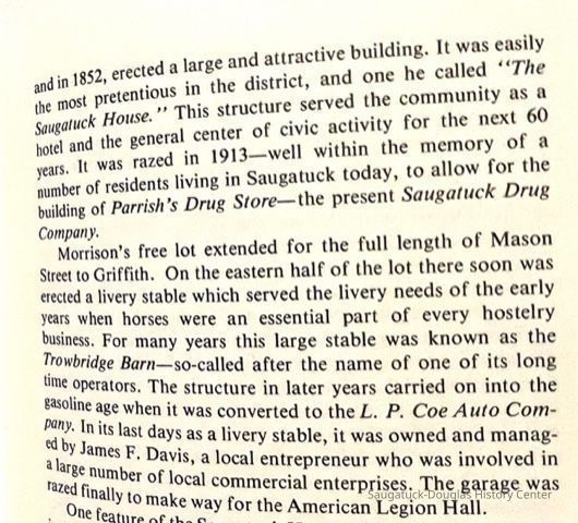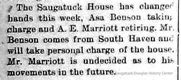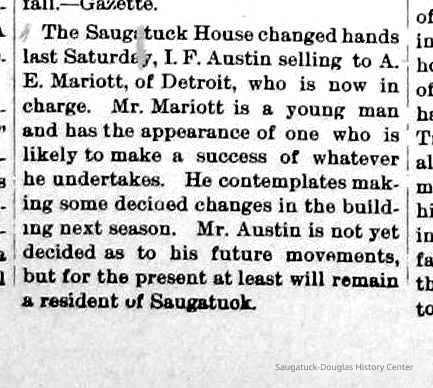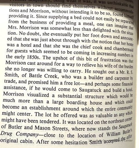 From "Early Memories of Saugatuck" by May Francis Heath: Stephen Nichols kept a boarding house at Singapore but the only place at "The Flats" where travelers could stop was the Morrison home, and they kept open house until 1852 when by donating a lot to R. S. Smith, a carpenter from Battle Creek, Mr. Morrison persuaded him to build the old Saugatuck House. Mr. Smith was drowned at New Richmond. Whitney and Strong were the next landlords and the slogan in their Ad was "Feed the hungry and rest the Weary." (This hotel was wrecked in 1913 and replaced by Parrish's drug store). The old Union House was built in 1865 and stood for many years when it too was torn down. It was at the corner of Culver and Griffith streets. George Hames was the carpenter who built the Saugatuck House for R. Smith.