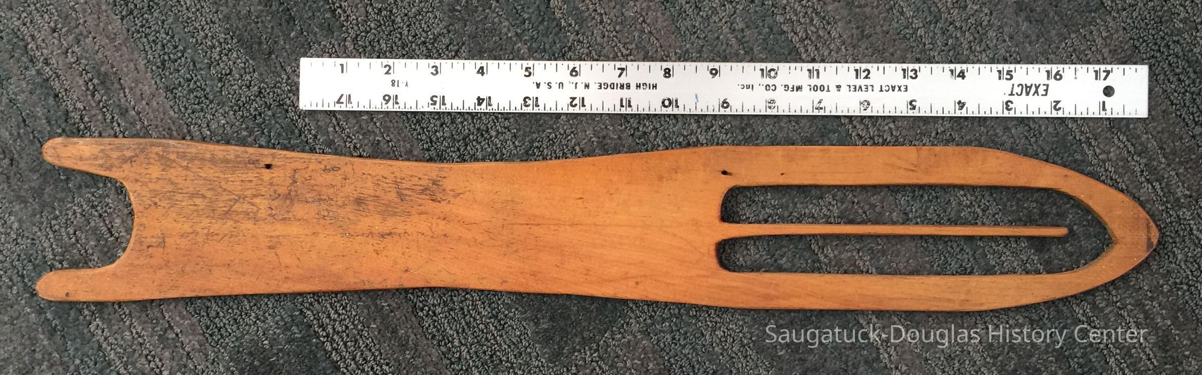 This item was given as a gift to local commercial fishermen Demmy Demerest. It is too large to be used to build a usable net for the great lakes fishery. It is hand crafted from solid wood, glossy varnish, with wobbly edges.