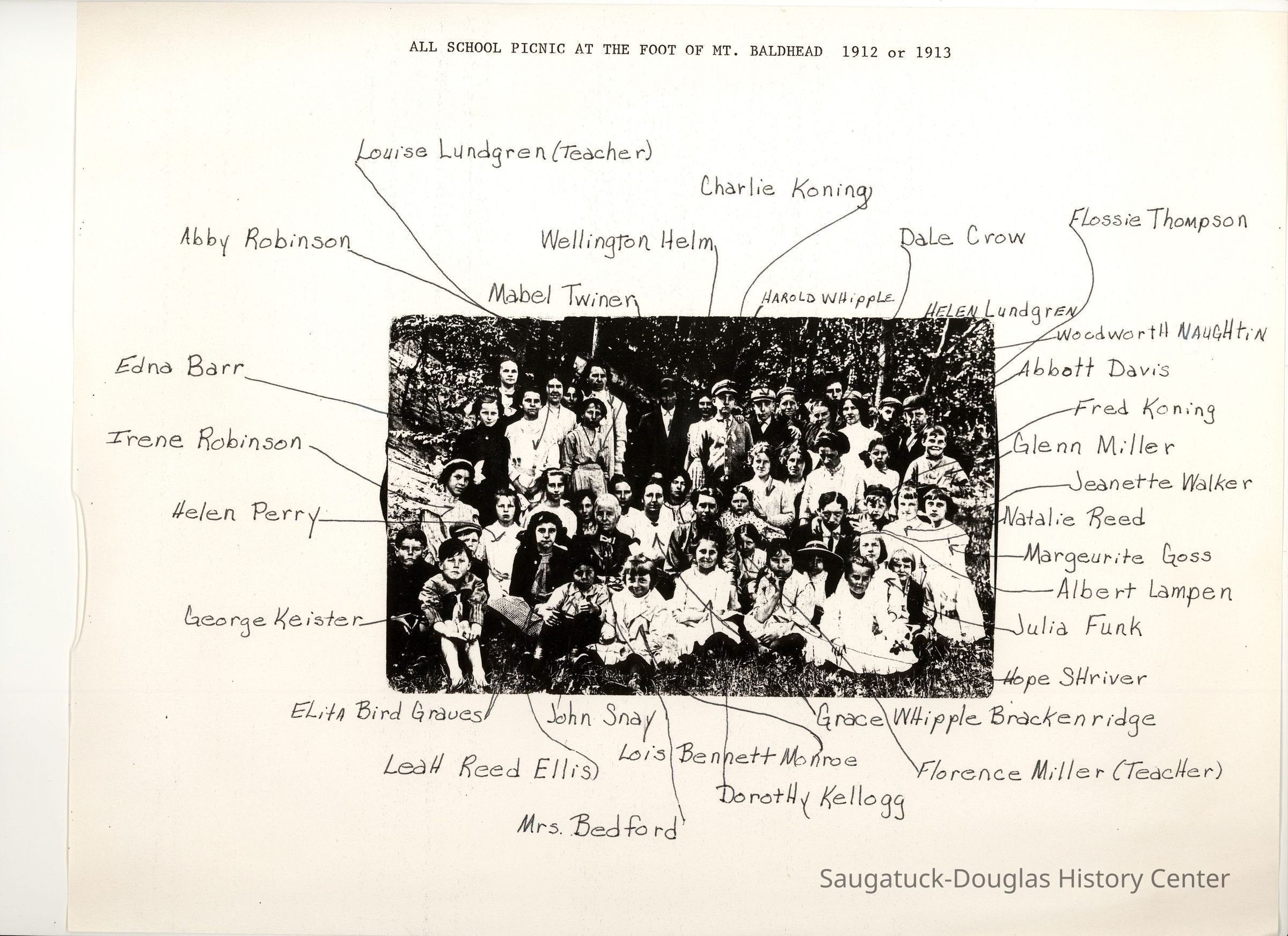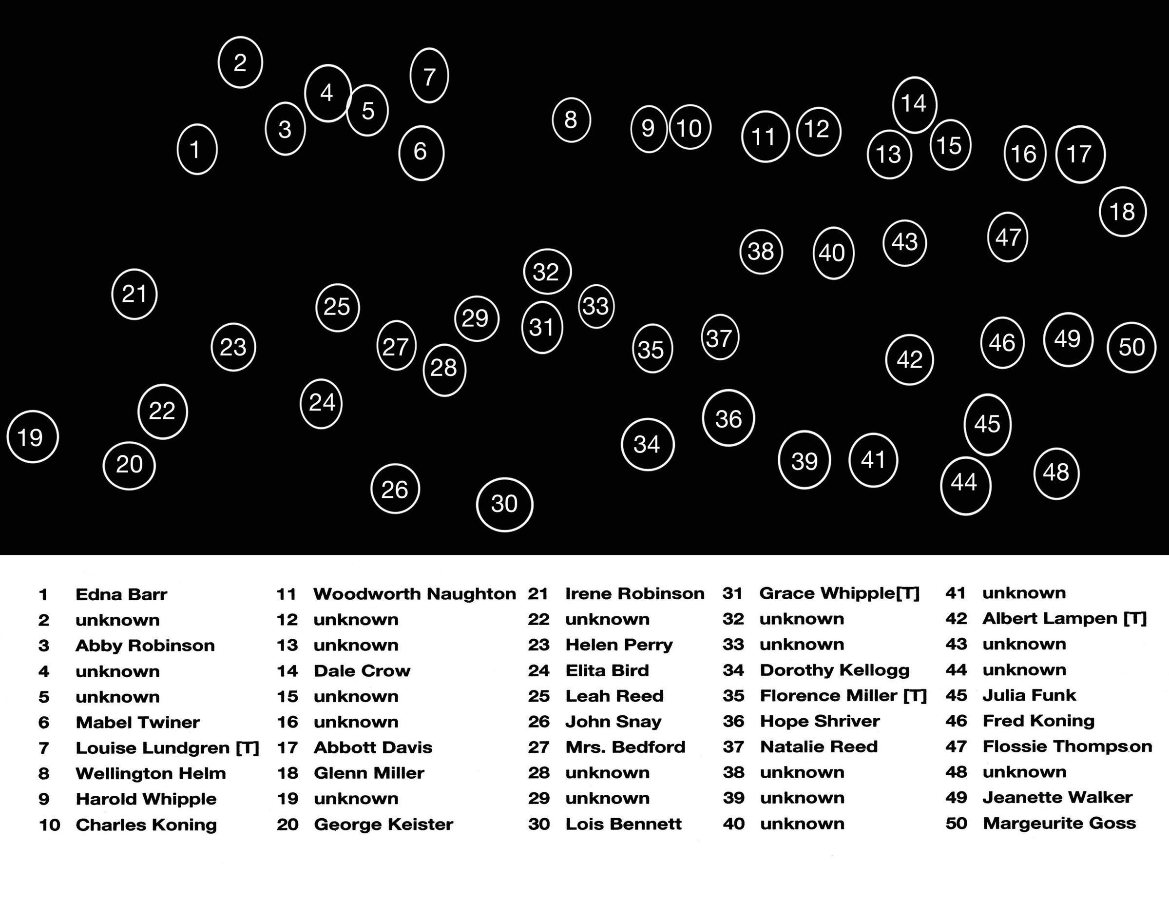 Lundgren, LouiseKoning, Charles William 1897-1972Whipple, Harold Clifford "Bud" 1897-1974Crow, Dale John 1899-1935Naughtin, William Woodworth 1894-1957Davis, Abbott B. Sr. 1896-1971Barr, Jeanette (Walker) 1902-1979Reed, Natalie "Billie" or "Bill"Funk, Julia (Whipple) 1903-1998Brackenridge, Grace (Whipple) 1895-1970Miller, Florence ElizabethReed, LeahGraves, Elita (Bird) 1897-1991Keister, GeorgeWebster, Irene (Robinson) 1898-1991Barr, Edna PaulaRobinson, Abbie (Wheeler) 1865-1903Mount Baldhead Dune/Park