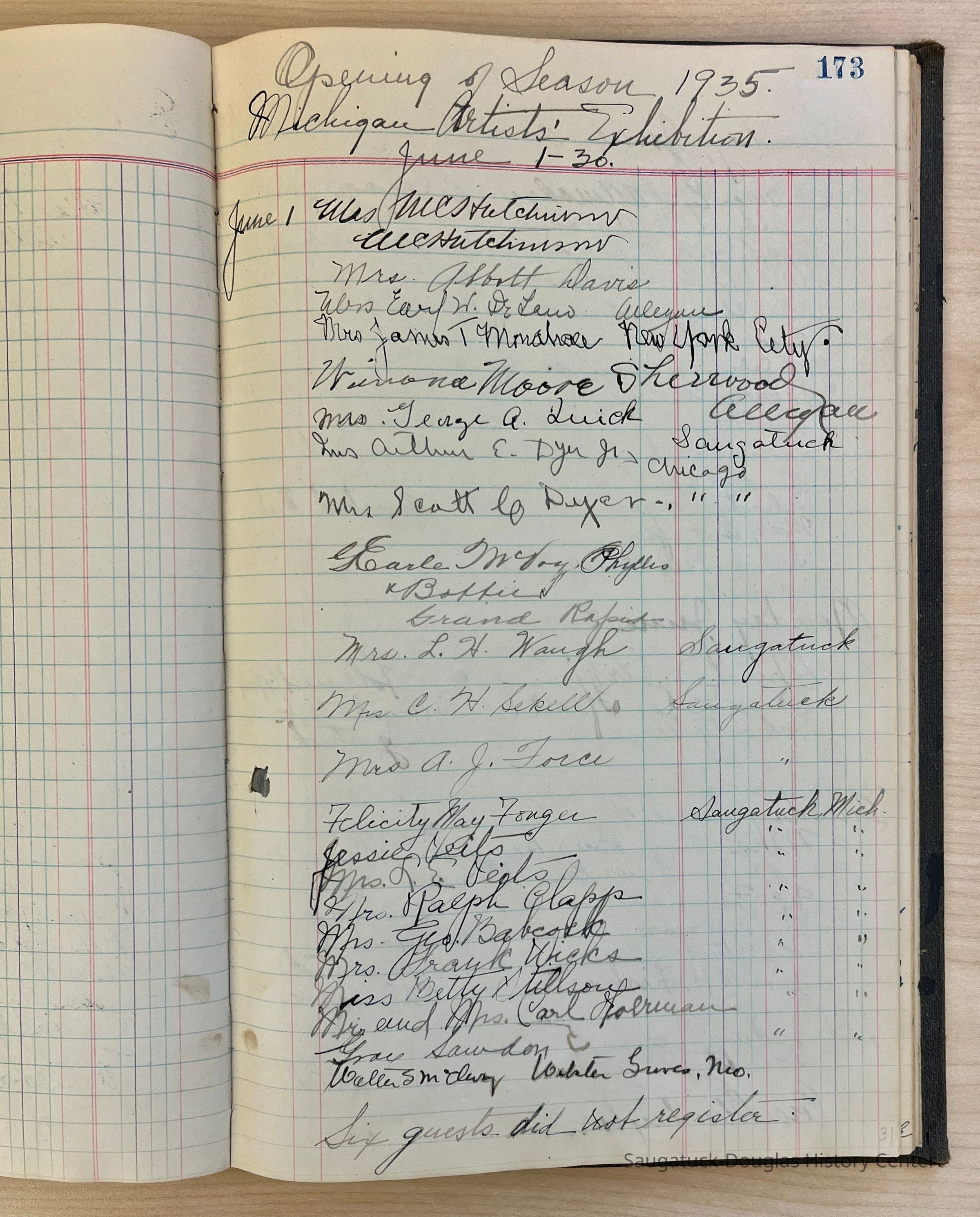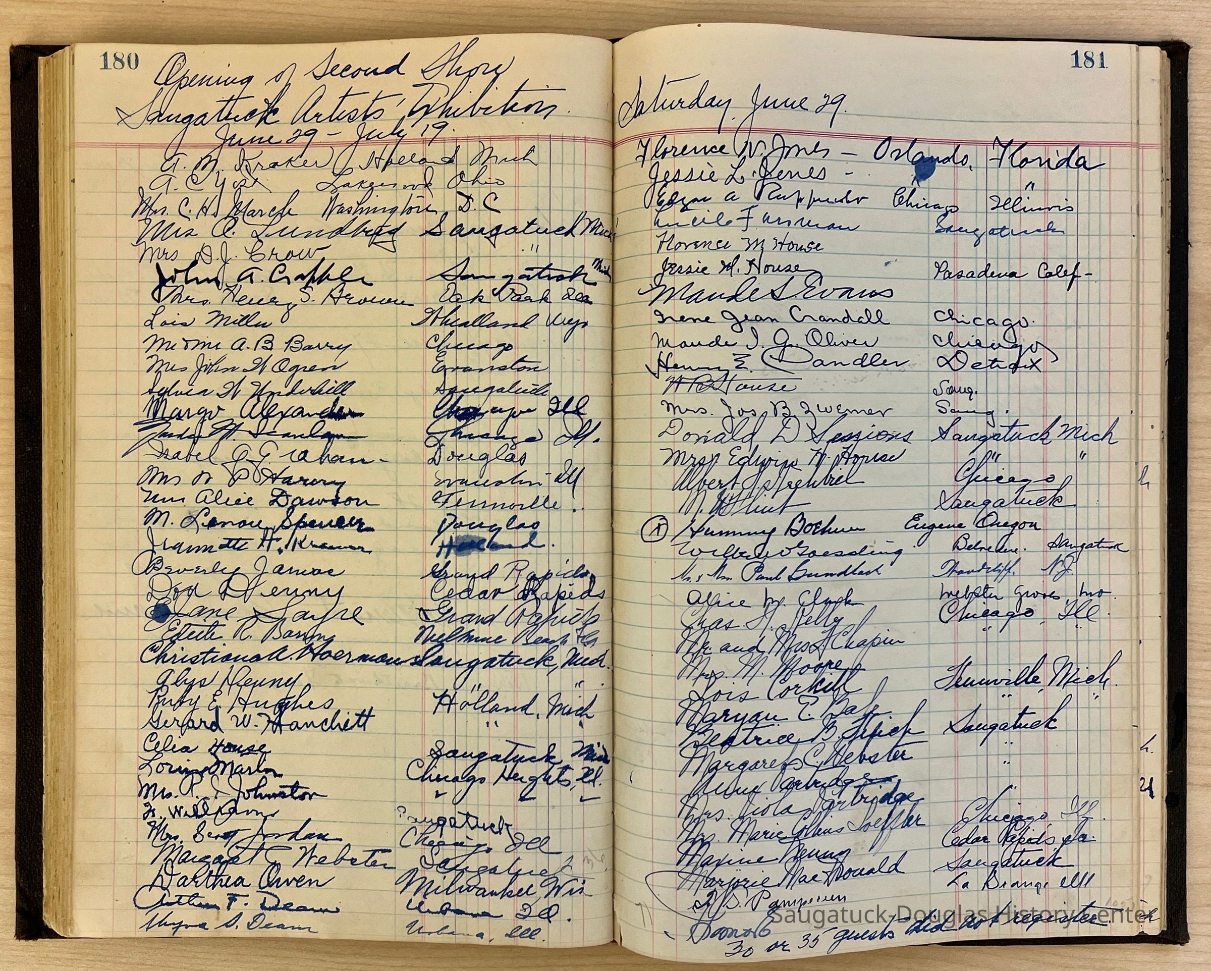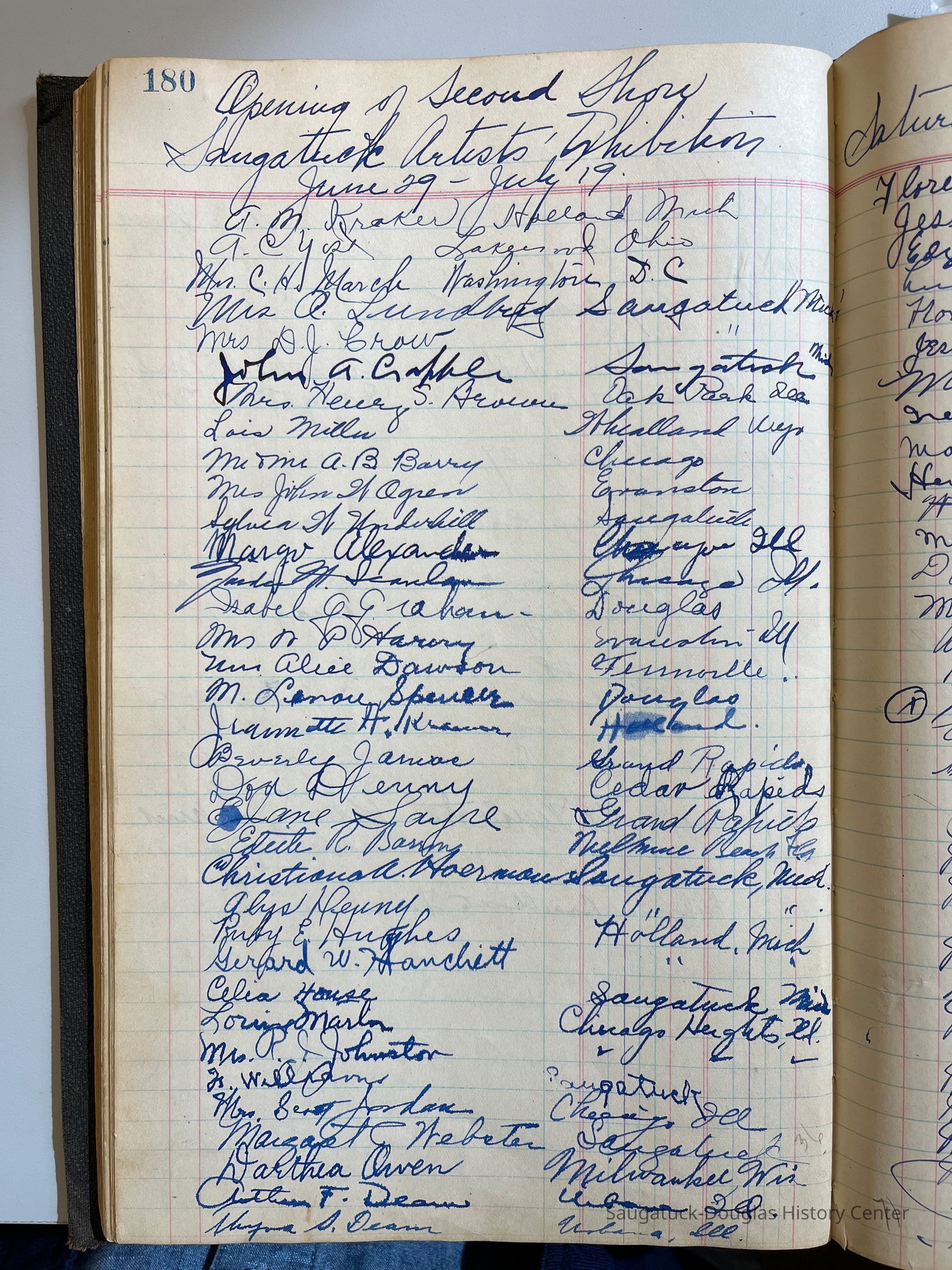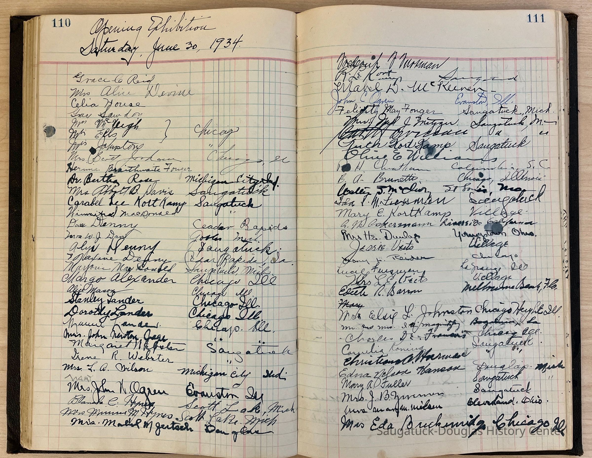 Documentation of the artists who were in town in the 1930s and the townspeople who supported the arts. The Saugatuck Art Association sought to support the arts during the Depression. The exhibitions were originally at the Saugatuck Art Gallery in the Saugatuck Village Hall and later at the AK Studio. Although this ledger came to the SDHC archive from the Saugatuck-Douglas Art Club, the book is not associated with the Art Club, an organization that was founded in 1953.