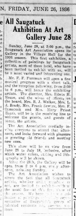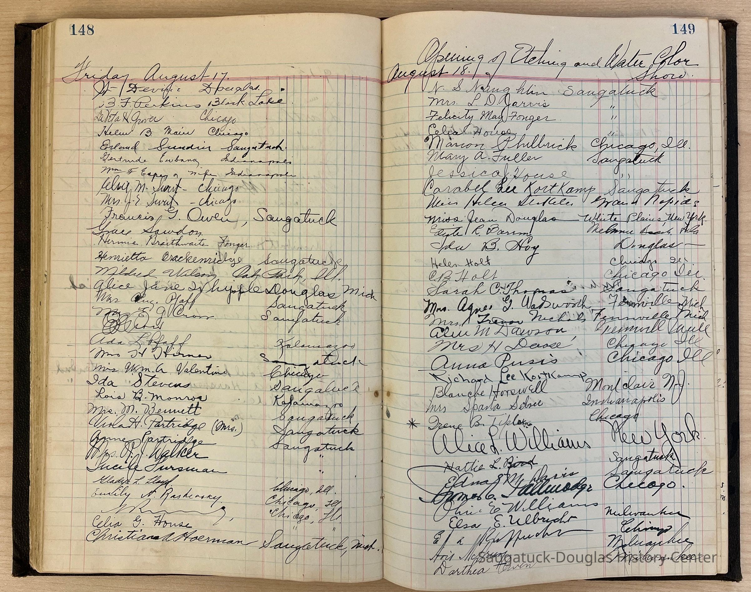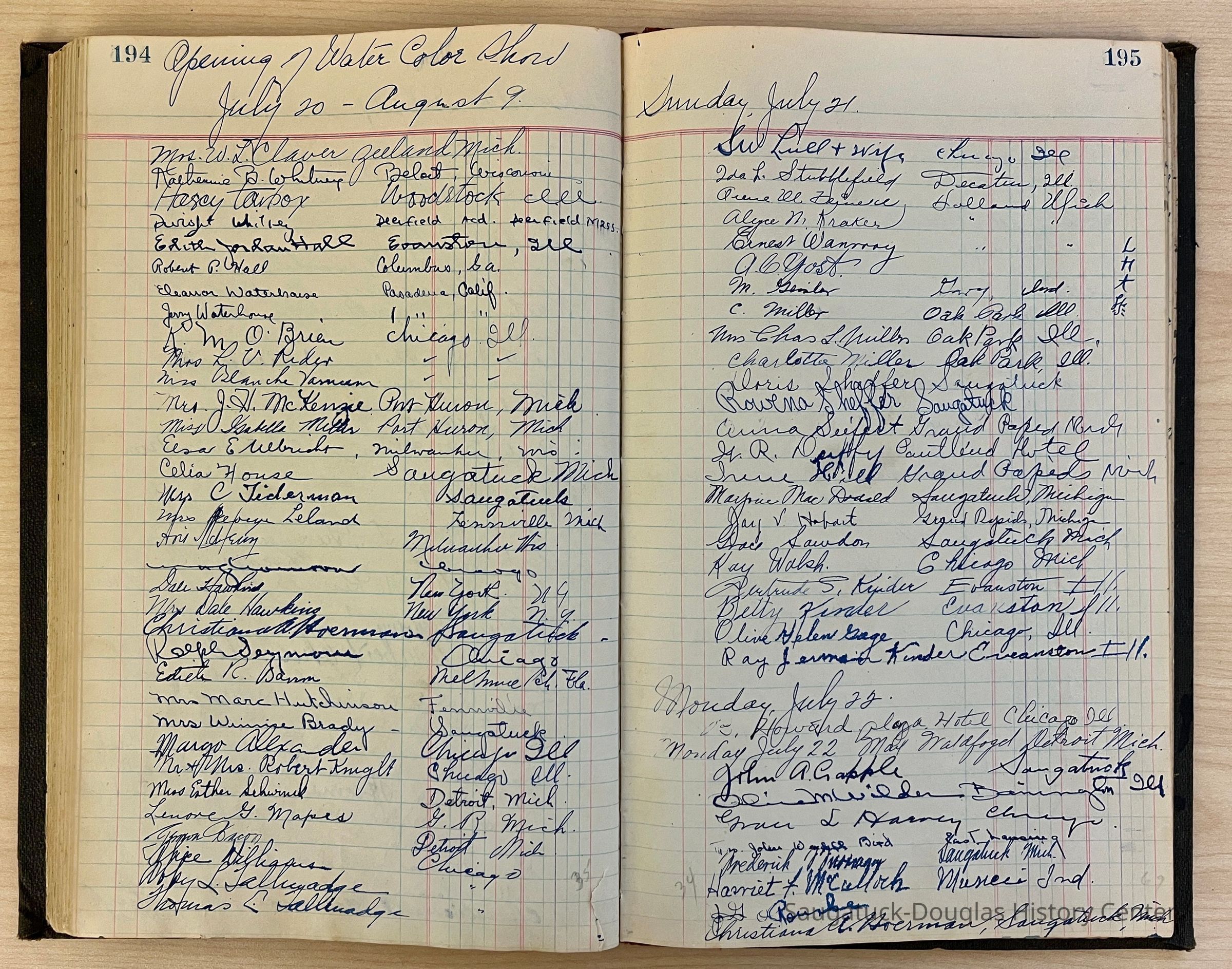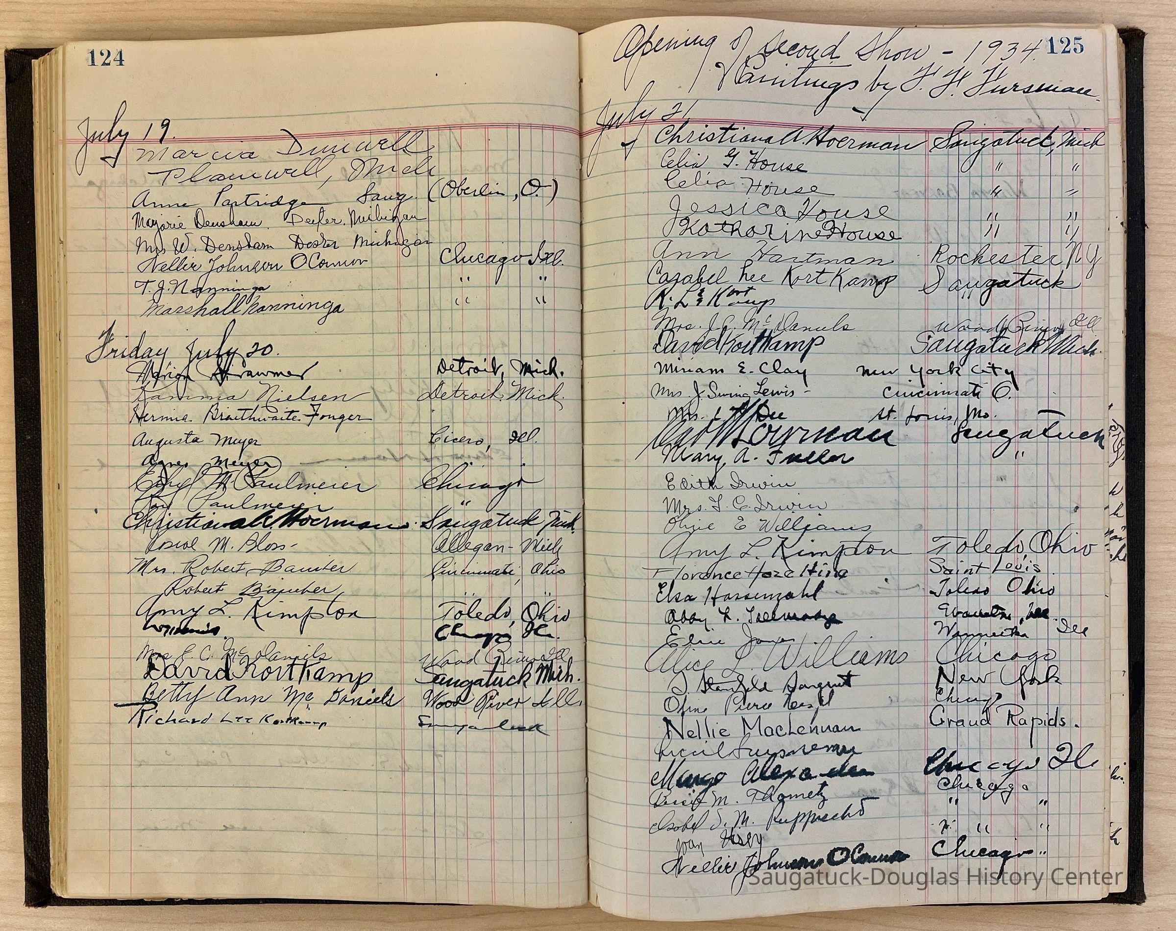 Documentation of the artists who were in town in the 1930s and the townspeople who supported the arts. The Saugatuck Art Association sought to support the arts during the Depression. The exhibitions were originally at the Saugatuck Art Gallery in the Saugatuck Village Hall and later at the AK Studio. Although this ledger came to the SDHC archive from the Saugatuck-Douglas Art Club, the book is not associated with the Art Club, an organization that was founded in 1953.