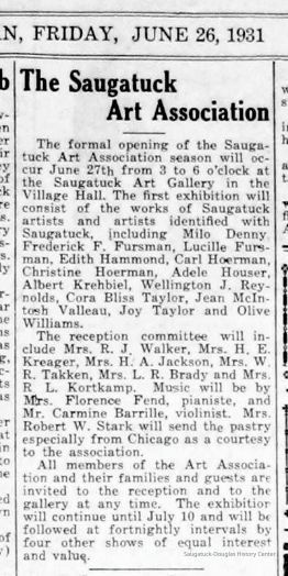 Hoerman, Christiana A.Fursman, Laurens Lucile ?-1948House, CeceliaDeam, Arthur "Art" Francis 1895-1974Graham, Isabel Gladys 1870/1-1954Fursman, Frederick Frary 1874-1943Krehbiel, Albert Henry 1873-1945DeSoto, Helen (Gage)Hoerman, Carl 1885-1955Reynolds, Wellington Jarad 1865-1949Taylor, Cora Bliss 1889-1986Taylor, JoyWilliams, Olive E. (Phelps) 1875-1972Saugatuck Art Association 1931-