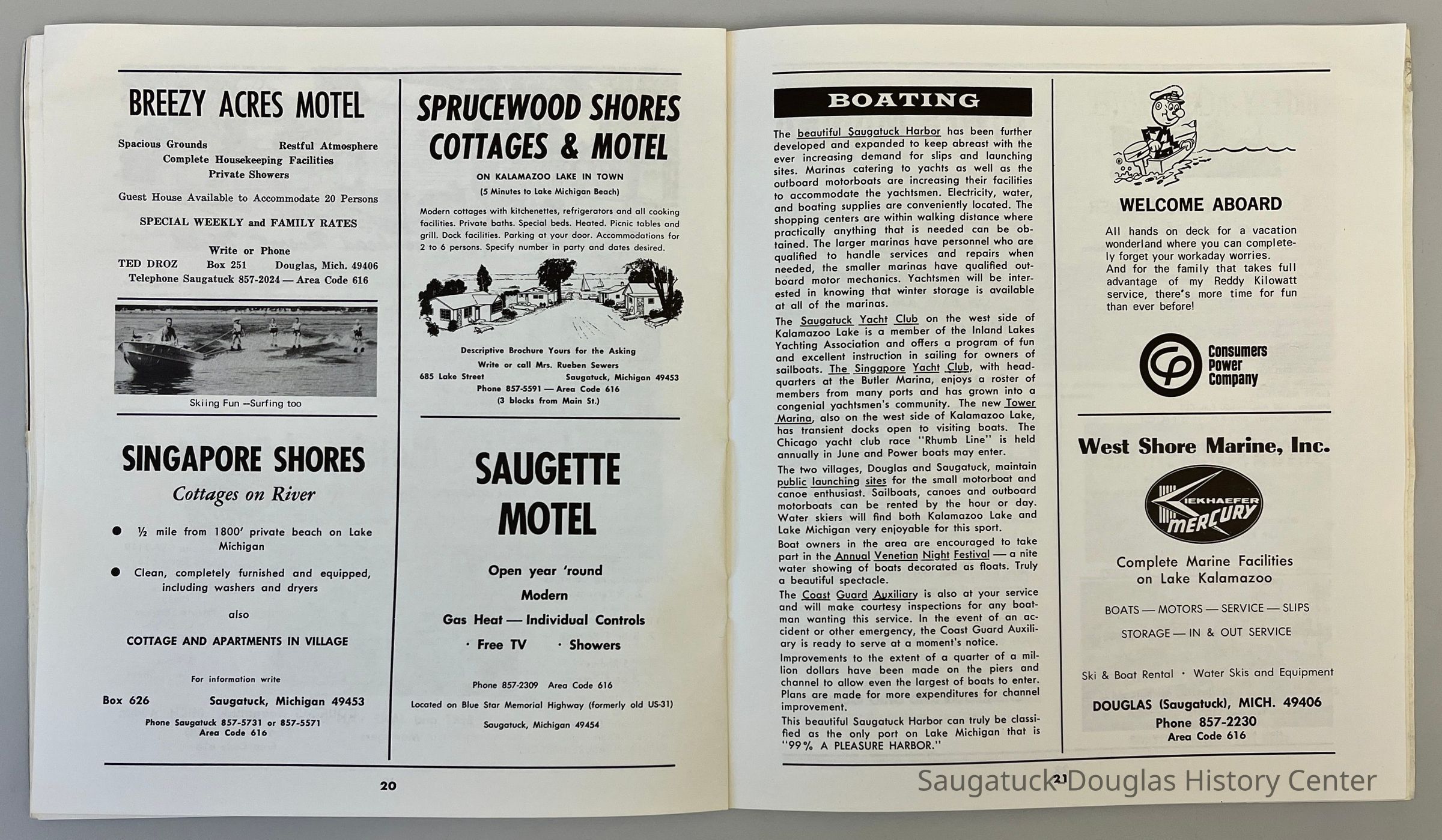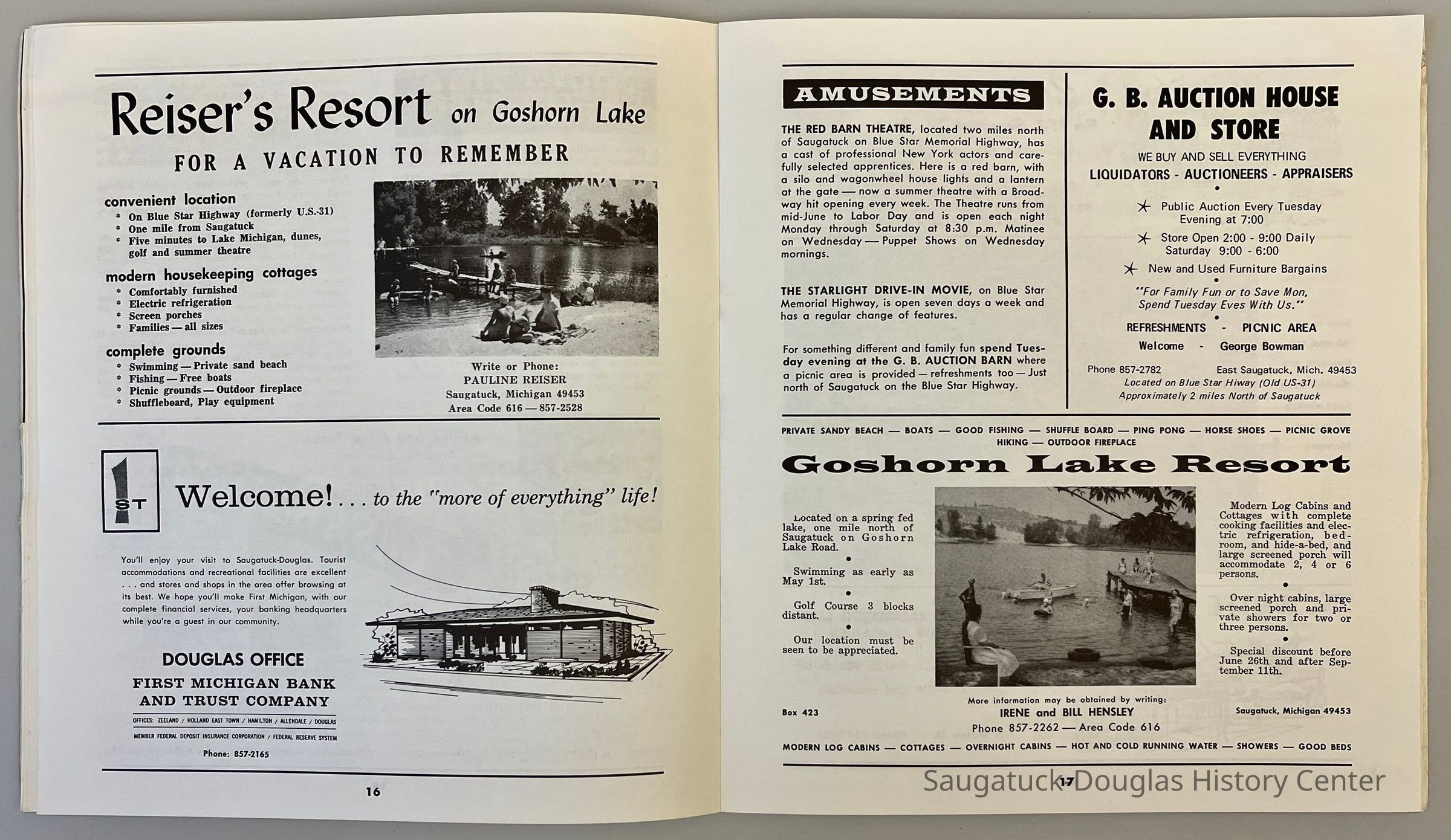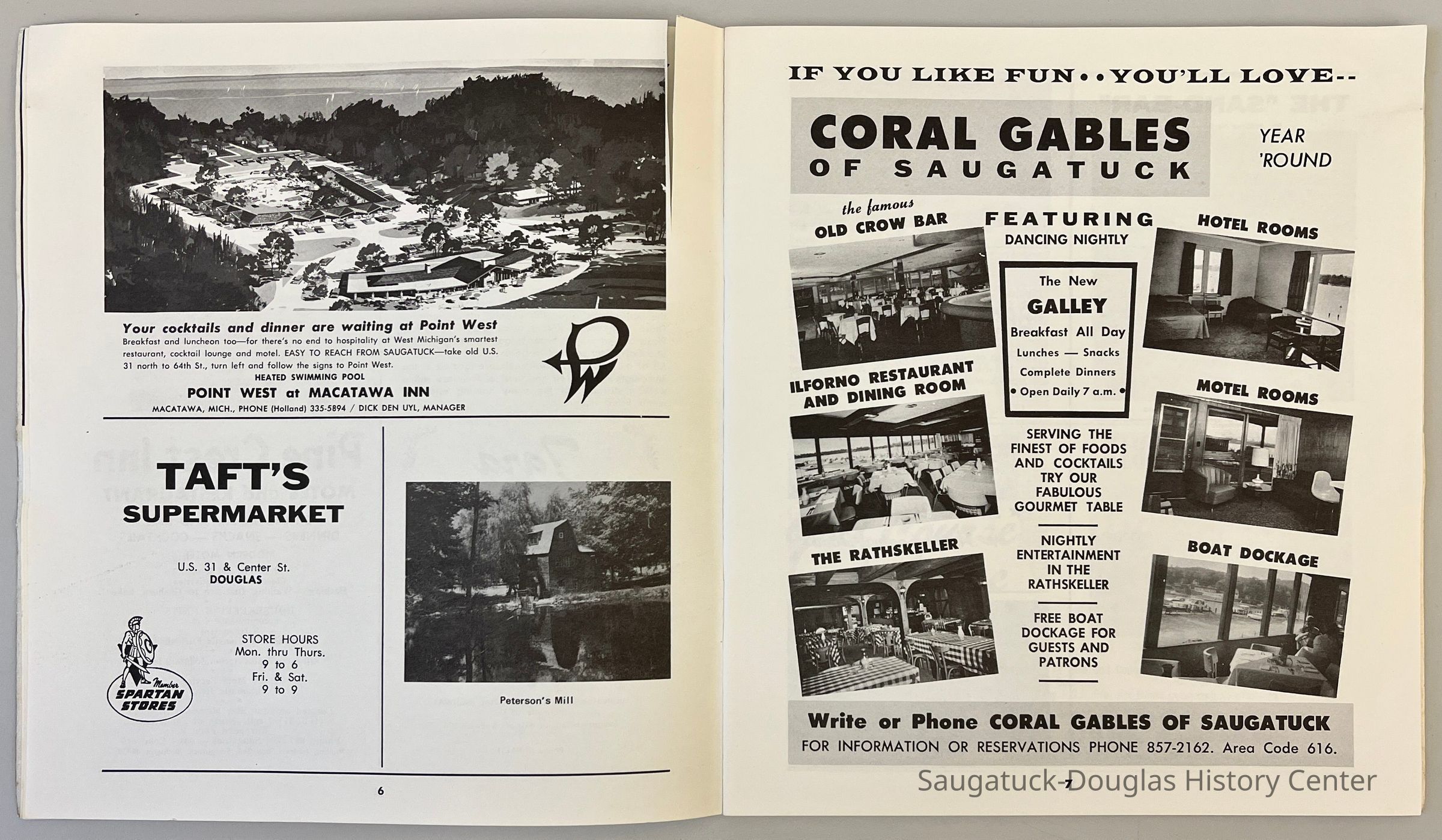 840 Lake/Arrowhead ResortBeachway Inn/Ferry Inn c1905-Berry Cove MotelBird Center ResortBreezy Acres Motel40 Butler/Hotel Butler/Grist Mill/Haymarket/Dutch windmillHotel Casablanca/Grace Hotel/Roamers Inn 1904-1969405 Park/Unsalted Boat Rentals/Casa LomaClearbrook Golf Club/Hamilton Lake Club/Saugatuck Golf Club220 Water/Coral Gables/Hotel Saugatuck/Columbia Hotel/Leiendecker's Inn612 Park/Holiday HillPoint West at Macatawa InnWhite Dog Inn/Jocko's/Pine Crest Inn 1938-201256 Blue Star Hwy/Pines Motor Lodge/Plaza MotelReiser's ResortRosemont Inn/Rosemont Lodge/Rose MontSaugette MotelMotel Shangrai La c1950-Singapore Shores685 Lake/Sprucewood Lakeshore Cottages/Rube SewersTimberline MotelWest Shore Golf Course 1920-Good Goods/White House/James Dole house/106 MasonBoat House TavernEveryday People Cafe/11W Center/Douglas Dinette/Walz or Waltz Meat Market215 Butler/Phil's/The Walton/The Embassy Bar & Grill/Cook /Metzger/Wallin Building141 Butler/Sand Bar Saloon/Edson Crow Barbershop & Billiard ParlorSaugatuck Beach HouseTara Restaurant/Spencer House/200 CenterAnchor Park Amusement Center 1951-1975Chalet Studio and Art GalleryButton Gallery & Home/Tews' Gardens650 Water/Saugataco/River Market/Gleason's Party StoreDune RidesIsland Queen I and II Paddlewheelers844 Holland/Peterson Grist MillPottawattamie Beach ClubEmerson Lounge/Guardian Brewery/Red Barn Theater/PlayhouseWise Residence/515 Park/Ferry Store/Heath Shop 1917-1980s?Saugatuck Yacht ServiceSS Milwaukee ClipperSilver Spur RanchStarlight Drive-in Theatre 1947-1987Ox-Bow/Summer School of Art216 St Peter's Dr./Safe Harbor/Tower Marina/Capt. Hamilton HouseAmerican Twisting Company 1923-1998110 Butler St./Urban Found/Bay Building/Redebaugh homeBlok, John 1942-2021Brady/L.R. Brady Insurance CompanyHaworth site/Haworth Plant/Chase ManufacturingMize Rose Garden north side/Fruit Growers State Bank/Clapp's Grocery/Flint's Shoes/Walz Meat Market/Griffin/TannerCommercial Record newspaper, The310 Butler/Fenn Valley Tasting Room/Consumers Power/Village News & Tobacco237 Butler/Puddingstone/Sinbad/Carl Walter's/Community Cleaners/Roche buildingCook, Dan520 Lake/Dykstra Funeral Home241 Butler/Momentum/BrigadoonHoffman, Richard "Dick"Hopper, Henry B.Douglas Building Center/Hutchins Lumber and Supply Co.10 Blue Star Hwy/Keller Building/Johnson's Standard Service439 Butler/Butler Pantry/Wilkins/Koning/Nies Hardware229-233 Butler/Oosting Appliance Shop East/Green Kandle/Busy Bee125 Mason/Laughing Glass/Port O' Call/Davis' Chicken As U Like ItPresbyterian Camp/Camp Gray/Forward Movement Park 1899-2014Rivulet Hurst Dairy201 Butler/Saugatuck Drug/Rexall/Parrish's Drug/Hotel Hamilton/Saugatuck House 1852-1913Schock, William H. 1933-2011Saugatuck Public School District247 Butler/Hidden Garden-Renaur-Wine Sellers/John Noonan home/Surry/Summer Home/Corner House/Capt. Rogers homeLake Vista Supervalu/237 W Center/Demond's/Taft's SupermarketThayer Paper Co.Village FairWest Shore Marine/West Shore Ferry landing/Tisdale Boat LiveryWolbrink Insurance AgencyWyngarden Print ShopHays, James D.