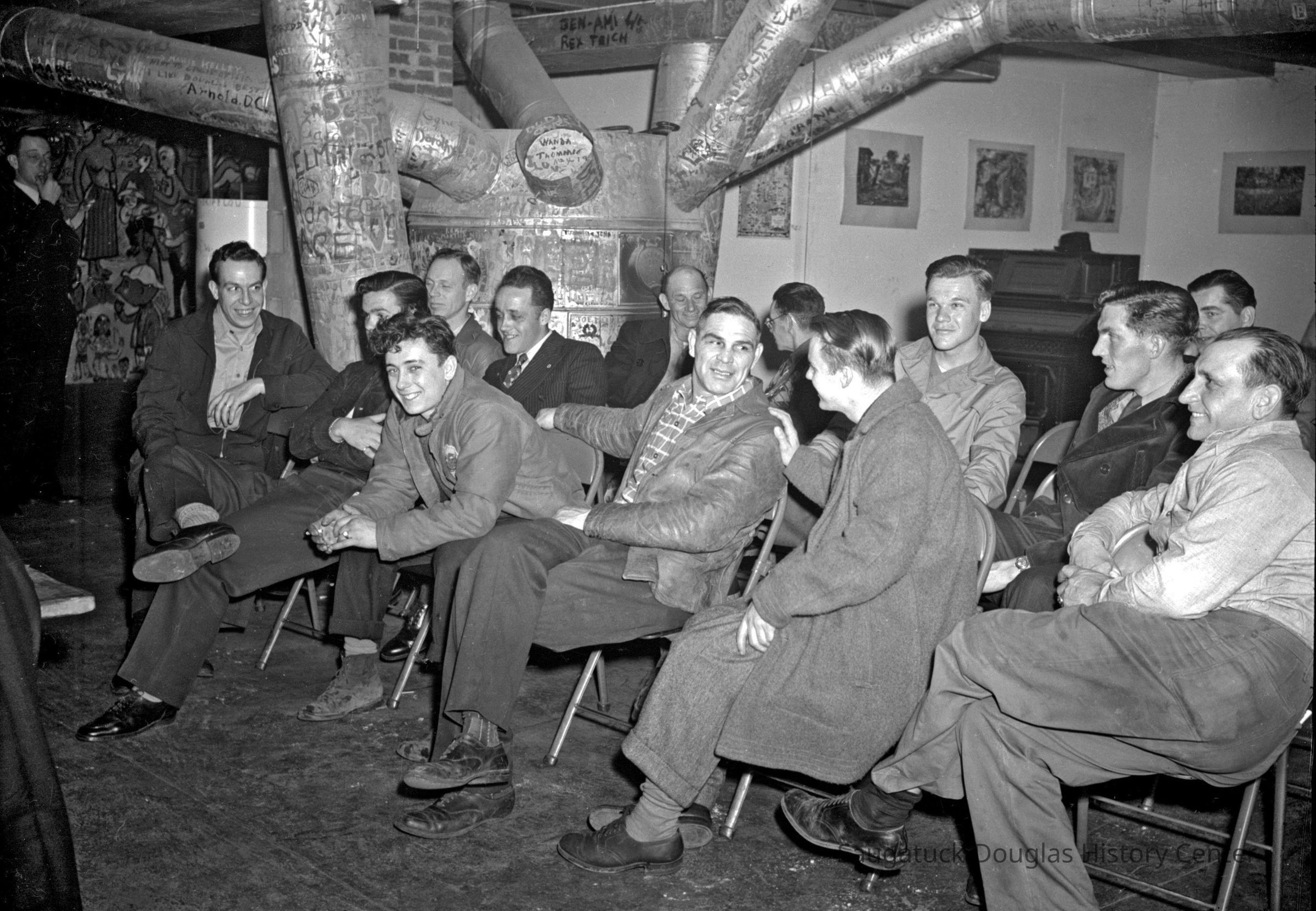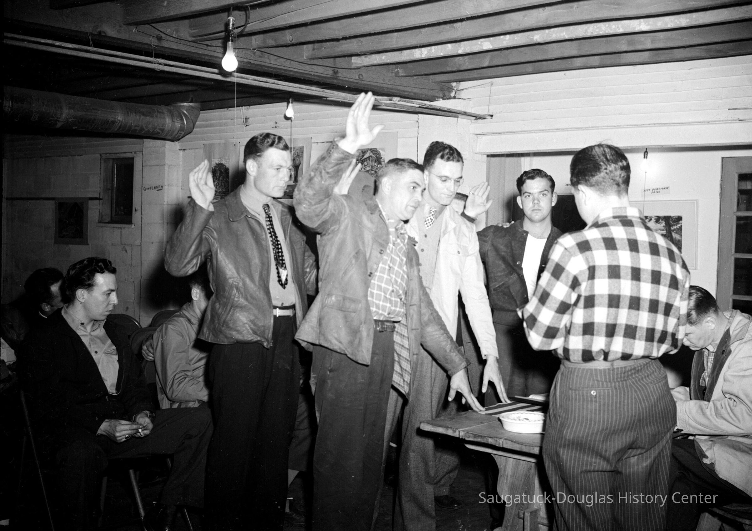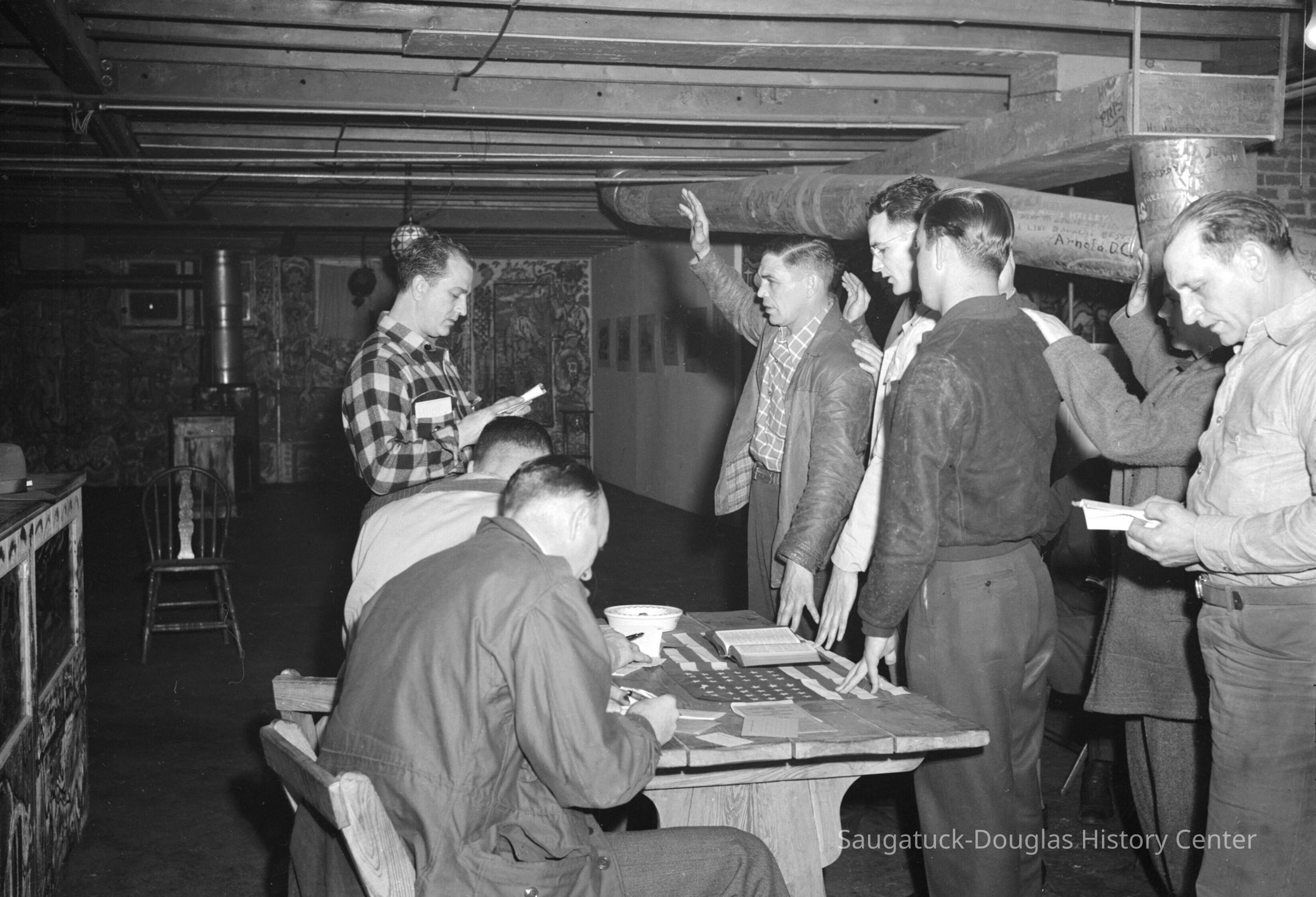 Veterans meeting in the mural-bedecked basement of the River Guild building. Swearing an oath on a flag of the United States.