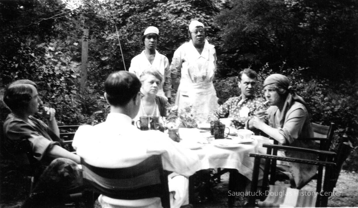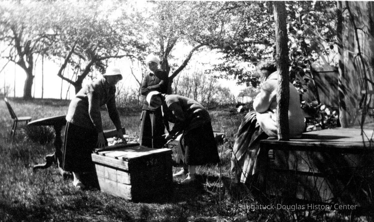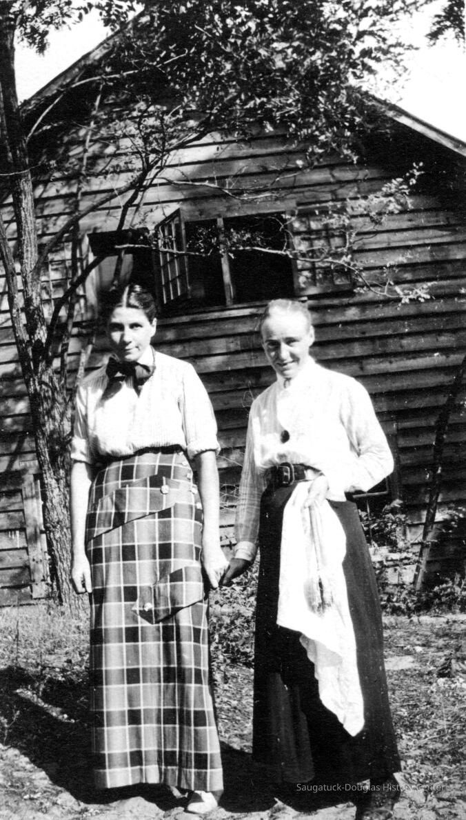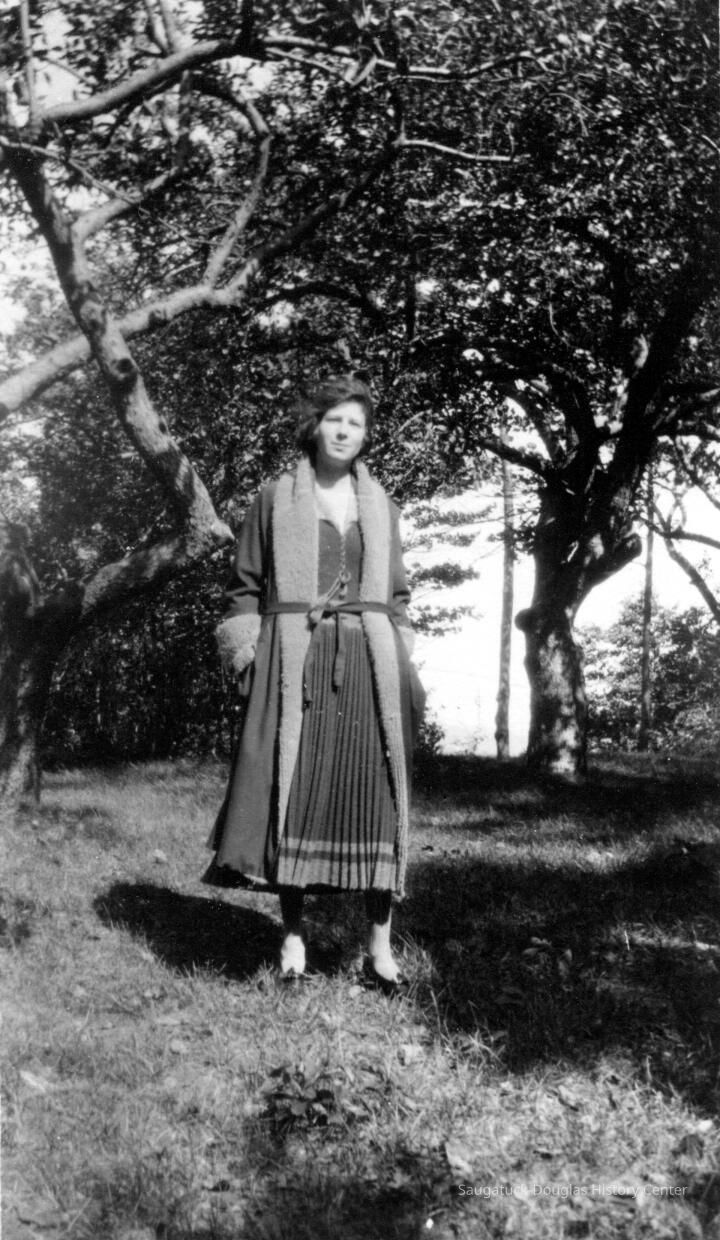 Florence "Dannie" Ely Hunn A Pier Cove Designer and Architect Re-discovered. Text from "Tuesdays at Noon" talk at Museum, July 25, 2000, by James Schmiechen Florence Ely Hunn (born Aug. 24, 1887, died March 24, 1984, age 98) described herself as "a plain mid-west gal" but in life she was far from plain and ordinary. In fact, she was a very unconventional woman who found the Saugatuck-Pier Cove area the perfect place for the expression of much of her personal and professional life. She was born into a farm family in Des Moines, Iowa in 1887. Her mother was Lucinda Bonine (died 1930). Her father was Ely Simonds Hunn (died 1927), making her cousin to O. C. Simonds, the well-known Chicago landscape designer and summer resident of Pier Cove. She was, through her father, a tenth generation descendant of the Mayflower settler Jonathan Brewster. Soon after 1940 her parents purchased a small cottage in Pier Cove, just to the east of the Simonds cousin's Orchard House. A photograph of her in her early twenties shows her on her horse"Bob" dressed in a cowboy outfit, with her proud father standing nearby. At the age of 20, at her father's urging, she traveled west and became a horsewoman and a worker in mines and oil drilling fields. At 22 and 23 in 1909-1910 she attended school in Germany and France and traveled in Greece--having studied the Greek language in her Iowa school. She graduated from the University of Chicago at 24 and then continued her studies at the Chicago Academy of Fine Arts and the Art Institute of Chicago. When America entered World War I in 1917 she wanted to join the American cause overseas but instead contributed her services to Uncle Sam by managing one of her father's purebred stock farms for the production of food for the Army. At the age of 28 she began designing building exteriors -- a passion pursued for the next 60 years. When the war was over she sought to fulfill her dream of the formal study of architecture but because architecture schools were not admitting women, she did what many other women in the same predicament did, she became an interior designer. At first she became apprenticed with one of the best known interior decorators in Chicago, and then in 1925 she opened her own shop. Her Chicago studio and home was at 101 East Oak. She later moved the studio to 920 N. Michigan Avenue. In March of 1934 she and Frances Crumb opened a design store known as "Contemporary" at 49 Cedar Street which featured avant-garde furniture and wall coverings. The success of this store led to the opening of branches in New York and Philadelphia. She was a frequent lecturer on interior design at the Chicago Art Institute, wrote articles for the Chicago Tribune and other magazines, and in the 1930s presided over a weekly interior design talk show on Chicago radio WMAQ. She was a founder of American Institute of Decorators -- of which she was vice-president in the 1930s. Her early interior design centered on 18th Century English and American hand 1920s "Colonial Revival") period work. Most of her clients had large apartments on Chicago's Gold Coast and homes in the hunt country of nearby Barrington, Illinois. She did some East Coast work, including the Price-Waterhouse partners' houses, in Rye, New York. By the 1930s Florence Hunn had become one of the leading American designers. Her portrait by Wellington Reynolds of the Art Institute of Chicago, in the American impressionist manner, hung at the Art Institute of Chicago for one year. It is now in the possession of the Saugatuck-Douglas Historical Society. What kind of work did she do and what makes an interior designer famous? With regard to interior design philosophy, her bread and butter, then, centered on creation of high class 18thcentury English and French interiors and hence she fit well into the traditional side of her time. She worked for the moneyed class, which had long dictated that the only good interior design was that which copied the 18th century. Like a good designer she hated the 19th century (she once said, "the 19th Century might readily be wiped from our memory ...") and at first appears to have had little to do with the 20th Century. But things were changing, and Hunn took up the modernist cause in a city known in the 1920s for its design conservatism. Although keeping with the traditional world of conservative interiors was goad far her pocket book,she also went off in a different direction, advertising her work as "new designs in furniture in the modern spirit." Here we see her mimicking the anti-establishment and chic Art Deco and Art Moderne styles of New York.The New York Sun described her as "bitten with the modern desire to create entire rooms with geometric designs" in white, and in glass and mirrors. One of her new furniture designs was that of futuristic looking dining table with mirrored edges and white and gray painted chairs. One of her specialties was modem wallpaper and furniture design, and she was a pioneer in introducing Art Deco style glass molding (in green) and mirrors into room decoration, modernist tile, painted furniture, and, by the 1940s, California-inspired architecture. Hunn's drift to the modern even showed up in Douglas in 1954, where she was commissioned to remodel the old Tara Restaurant-giving it a new entrance, iron railings, and interior murals (no record of the Tara images exists), as well as in the design of two ranch-style lake shore cottages. After World War II, responding to new needs far new housing formats, Hunn was one of the organizers and designers of the influential "At Home In America" show in Chicago in 1954, a trade show that pioneered in the introduction of modern house design in the United States (she used Baker furniture in the living room). Like her professional life, Hunn's private life was far from ordinary, and she appears to have been able to play to both the traditional social world and a more bohemian and non-conformist world at the same time. Most importa