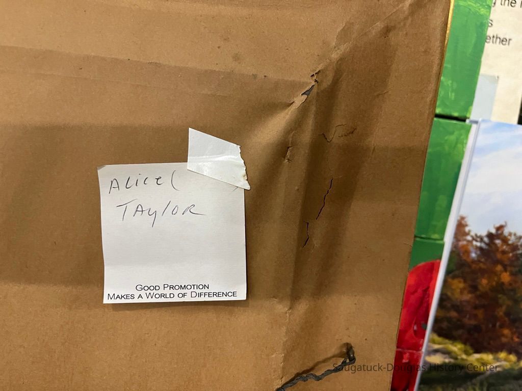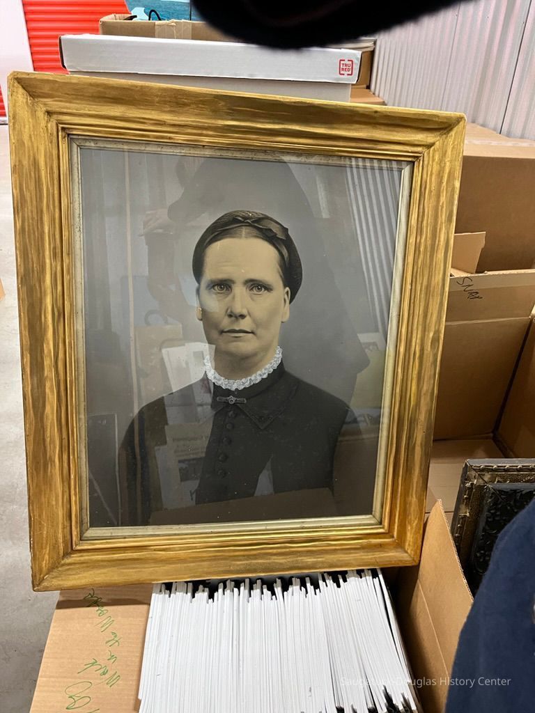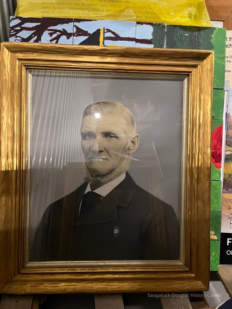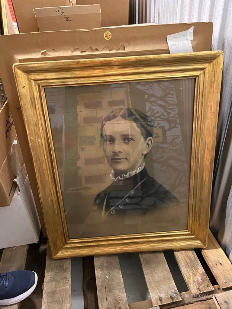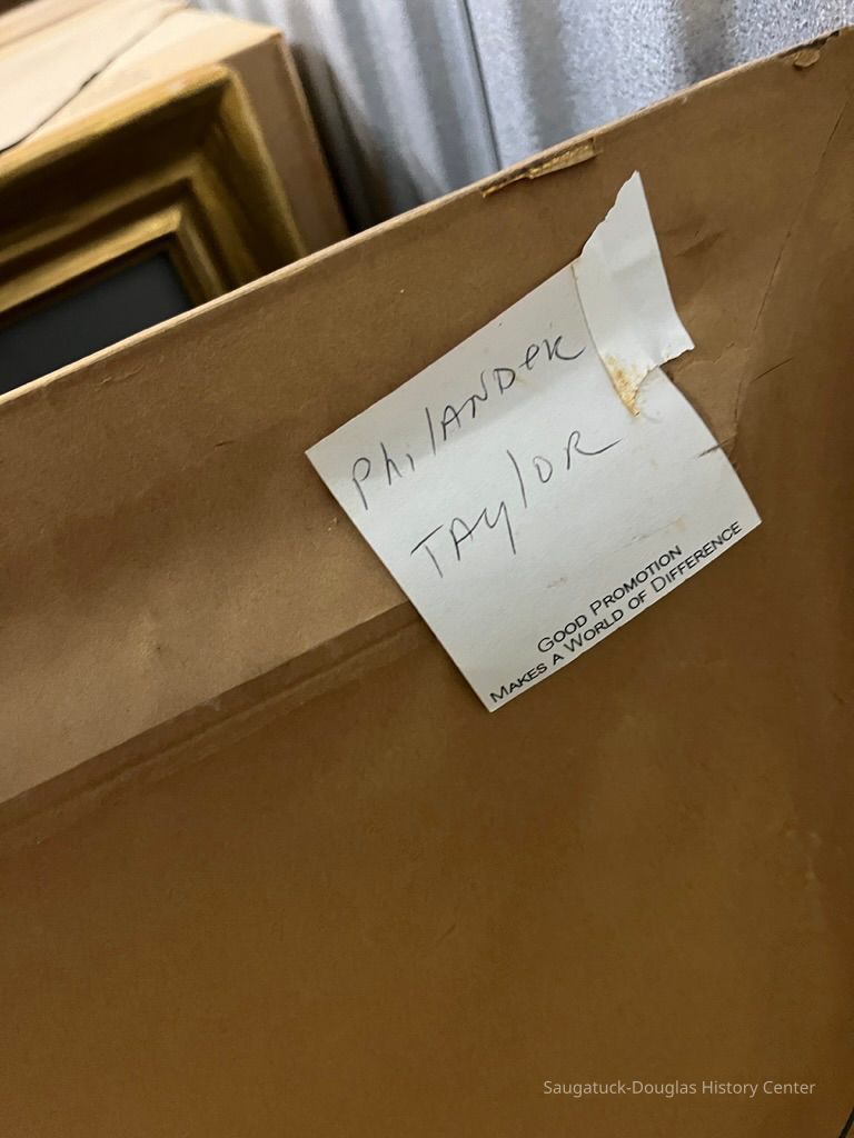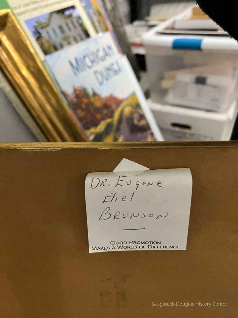 Four tinted photo portraits in gold-tone frames: two men and two women. The younger man's portrait has a post-it note on the back labeling it as of "Dr. Eugene Eliel Brunson." The older man's portrait is labeled Philander Taylor ( Dr. Brunson's father in law). The younger woman is labeled Alice Taylor (spouse of Dr. Brunson). The older woman is likely Nancy A. (Collins) Taylor, spouse of Philander and mother of Alice.