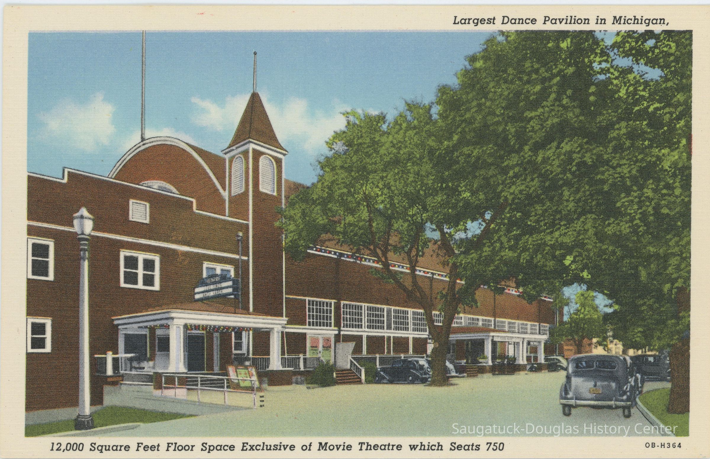 A color postcard showing the Big Pavilion from the street. Two trees stretching over the street compose the right side of the postcard with the Big Pavilion on the right. Cars are parked along the road and in front of the building.