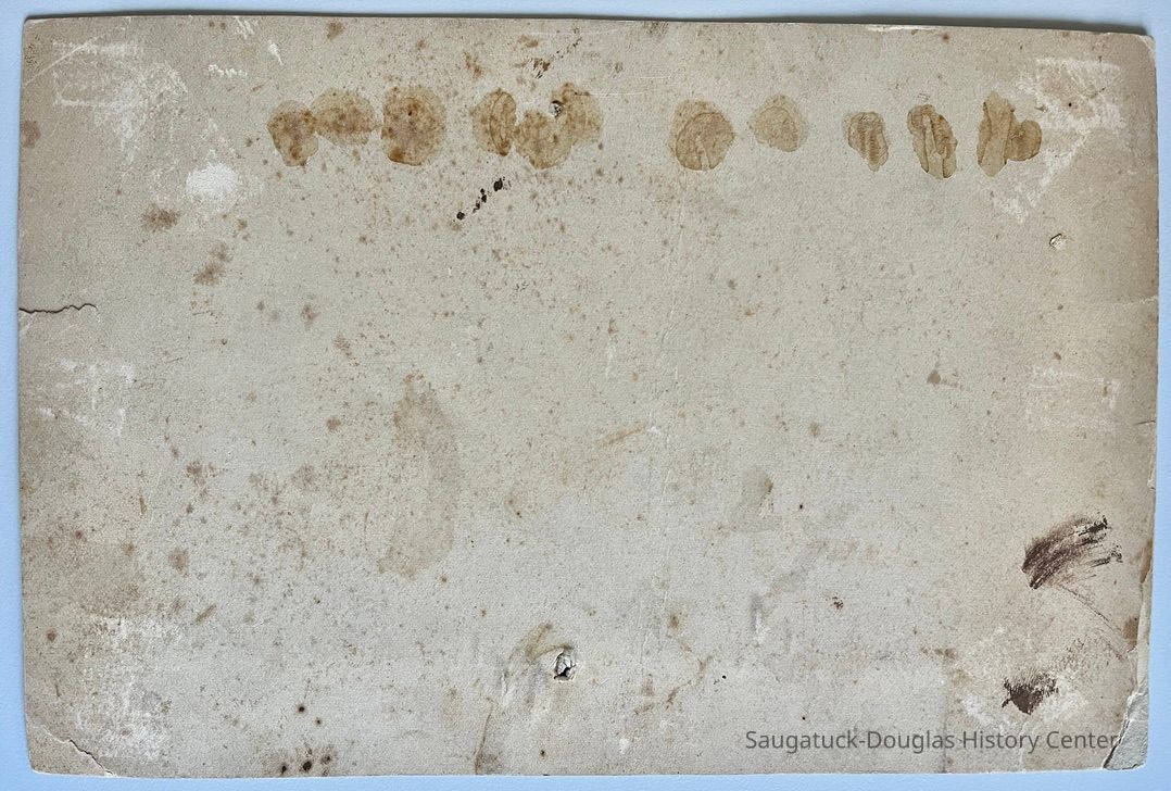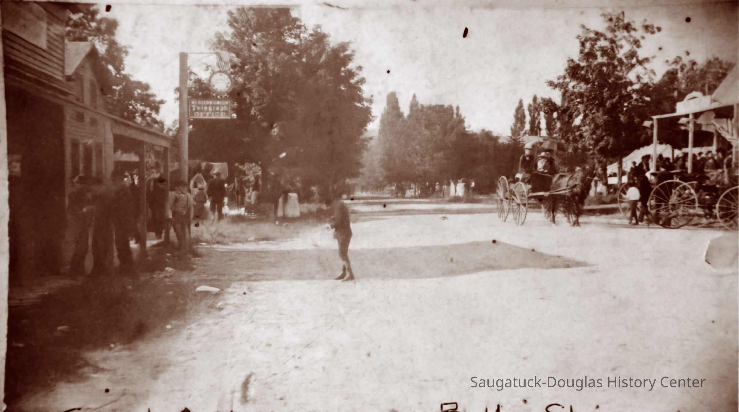 Street view of Butler at the Public Square circa 1888 This photo is of Butler Street looking north towards the Public Square. Two buildings on the west side of Butler Street that are not shown in the 1873 Atlas map or the 1895 Sanborn map. However, that sign above the Telegraph office sign is Miller Robinson’s. Later, in that more common photo circa 1902 of his shop, he used his clock or watch sign when he was at the exact location only in the Turrell building. That Kit Lane account that he operated the first telegraph office in Saugatuck is in error. Saugatuck had a Western Union telegraph by 1873, and Miller Robinson was its operator at least by 1891. My best guess is that the photo was taken in July 1888 or whenever that large GAR reunion happened in Saugatuck and the veterans camped in the Public Square. In 1887, Postmaster Frank A. Winston ran the telegraph office. The 1888 date is a good guess. Schaberg moved into the S. Goshorn building [at right with arched detail over sign, also called Schaberg bakery] in 1882, so there's no conflict. I wish the sign on the left could be read so we knew who was there and what building this was, as it’s not shown on the 1895 Sanborn map. I'm just trying to backtrack Miller Robinson to get a handle on that street scene photo in the Lorenz collection. In 1882, he was with Civilian M. Cook in the Tanner building, i.e., the Griffin building, and advertising; he was in the post office building. In 1883, Robinson’s ads state on Butler Street, but no address or reference to other shops is mentioned, So that’s where I am now. My working theory is that the photo shows the Robinson Building, which may be different from his residence behind it. Newspaper accounts say Robinson was a door north of Bird’s drug store in 1887, which should be the building the Commercial Record was in later. From March 1894 to 1897, he was in the new Stimson building. However, accounts by his granddaughter state he opened his shop at that corner in 1894. I did find an ad for his shop in the telegraph office in 1893, but no address. That photo shows a large tent set up on the east side of Public Square between D. L. Barber’s general store (roof line seen) and Schaberg’s bakery. The Mat Wixon Circus was in town in September 1891, and Robinson was the Telegraph operator that year, so maybe that dates the photo. Again, that's just a guess that I’m trying to prove or disprove. LATER ADDITION I'm now thinking that photo was taken after April 1895 and before 1897 when Robinson moved to Dr. Stinson's new building. The building looks the same as seen in the circa 1874 and 1895 photos, so something changed. Darius Baker bought the place in 1896 and was a carpenter. He may have changed it before Turrell bought it in 1899
