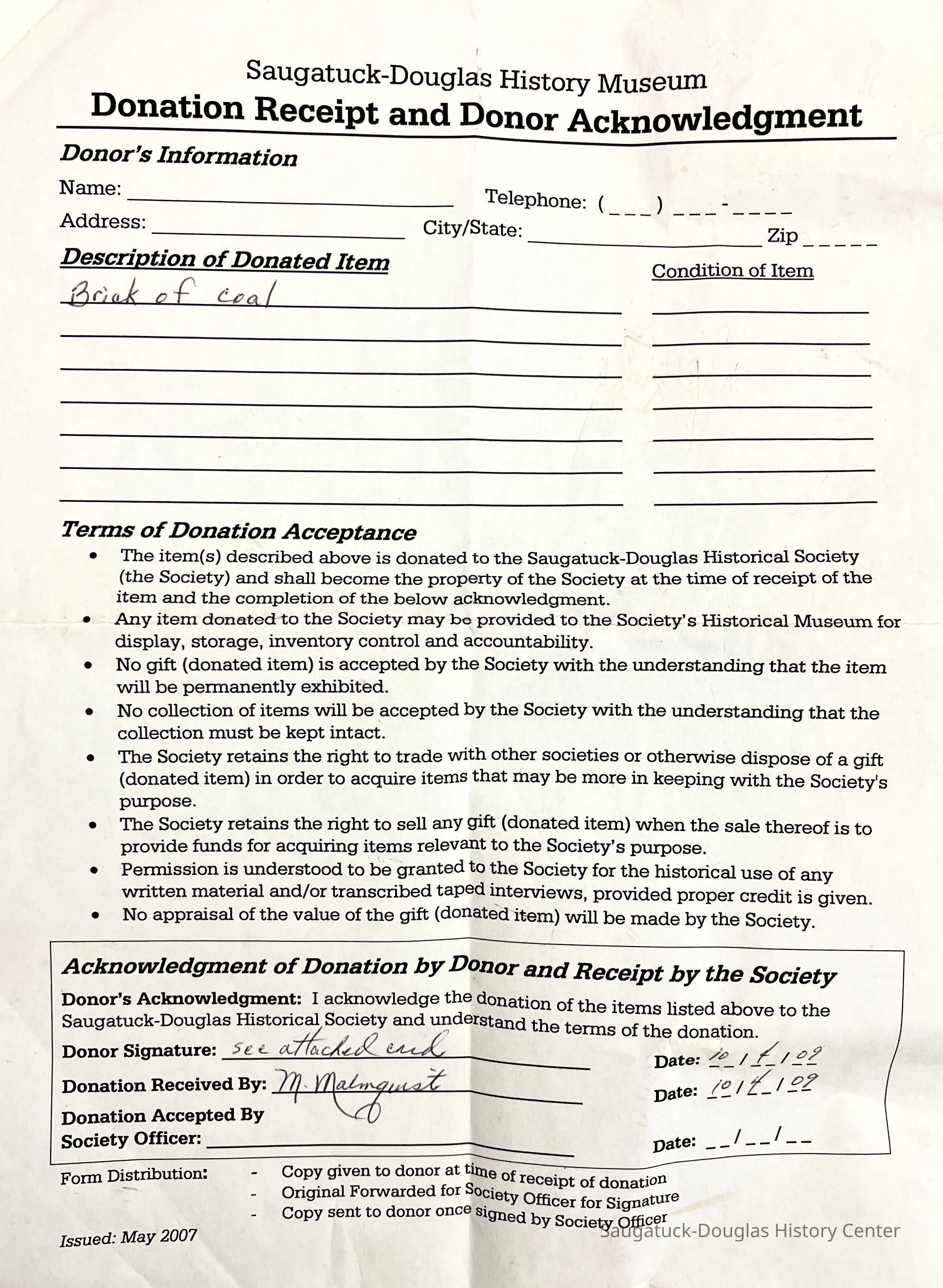 B. Brick-shaped piece of coal donated to the museum on 10/4/2009 with note "Loretta brought in this brick of coal, a neighbor of hers found along Lake MI shore in the 1980s." Loretta is Loretta Waunetta Gauthier of Fennville. 5x3x3 inches