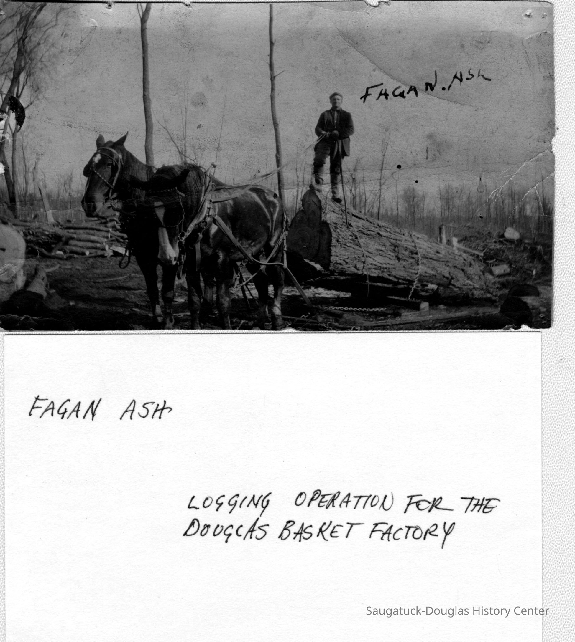 Fagan Ash standing on top of a log that is being hauled by two horses or mules. The logging operation supplied wood for the Douglas Basket Factory.