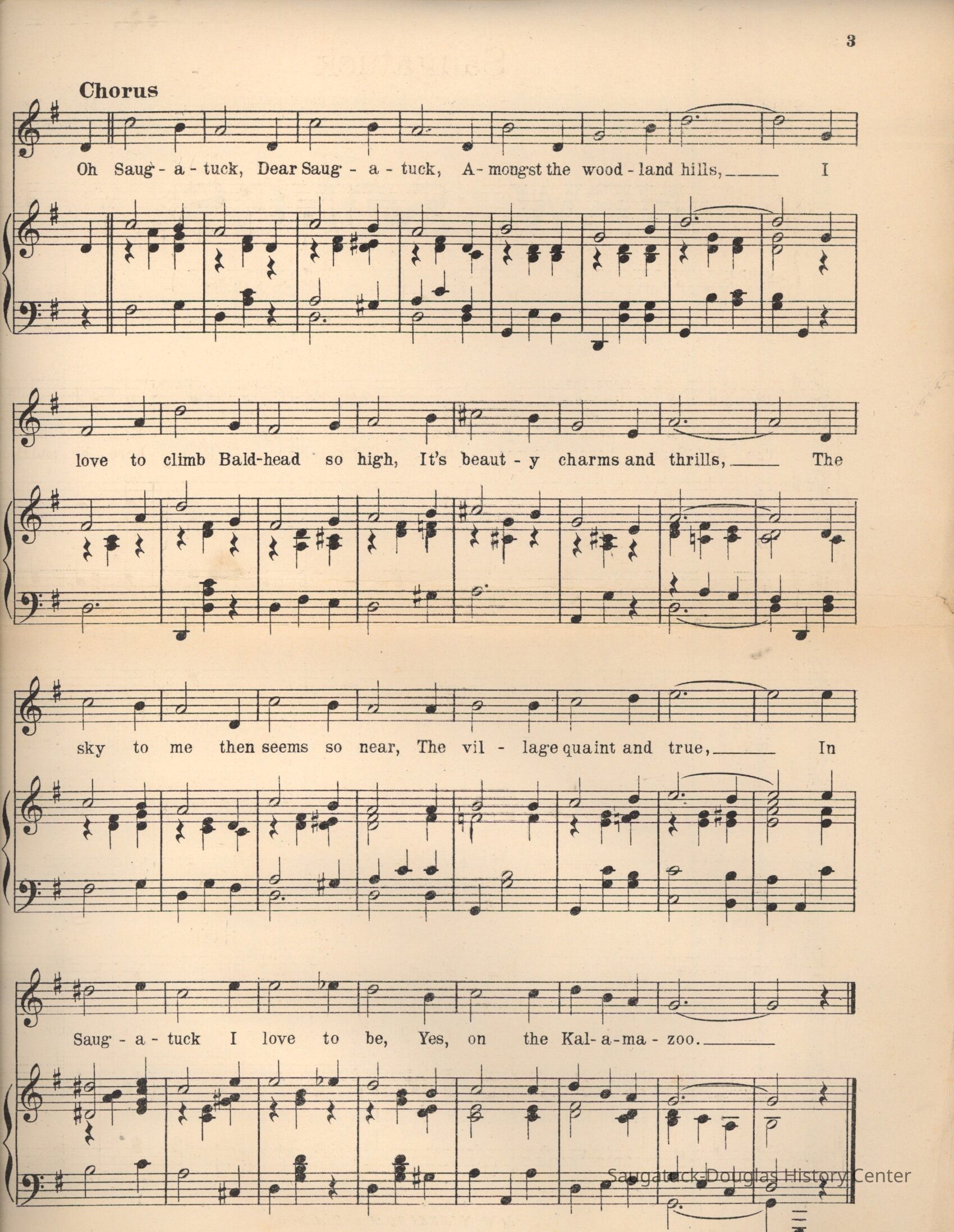 There is a pretty town I know, Where Kalamazoo's bright waters flow, Where rest and peace await each one, Who from the city's crowd may run. Chorus: Oh Saugatuck, Dear Saugatuck, Amongst the woodland hills, I love to climb Baldhead so high, It's beauty charms and thrills, The sky to me then seems so near, The village quaint and true, In Saugatuck I love to be, Yes, on the Kalamazoo. The Red Man here gave his Boo-shoo, Right here he paddled his canoe, Where now we're fishing, swimming too, So merrily on the Kalamazoo.