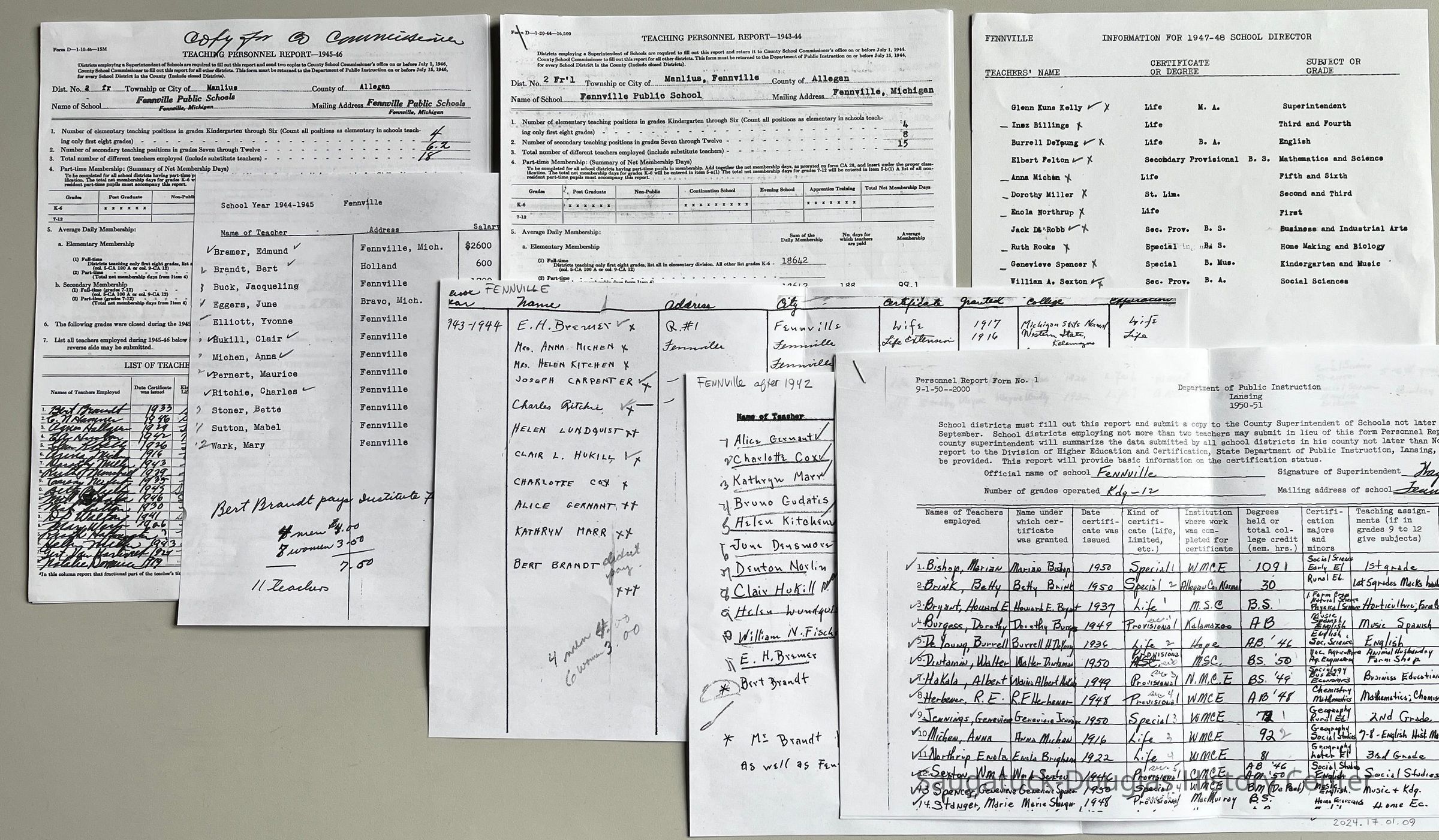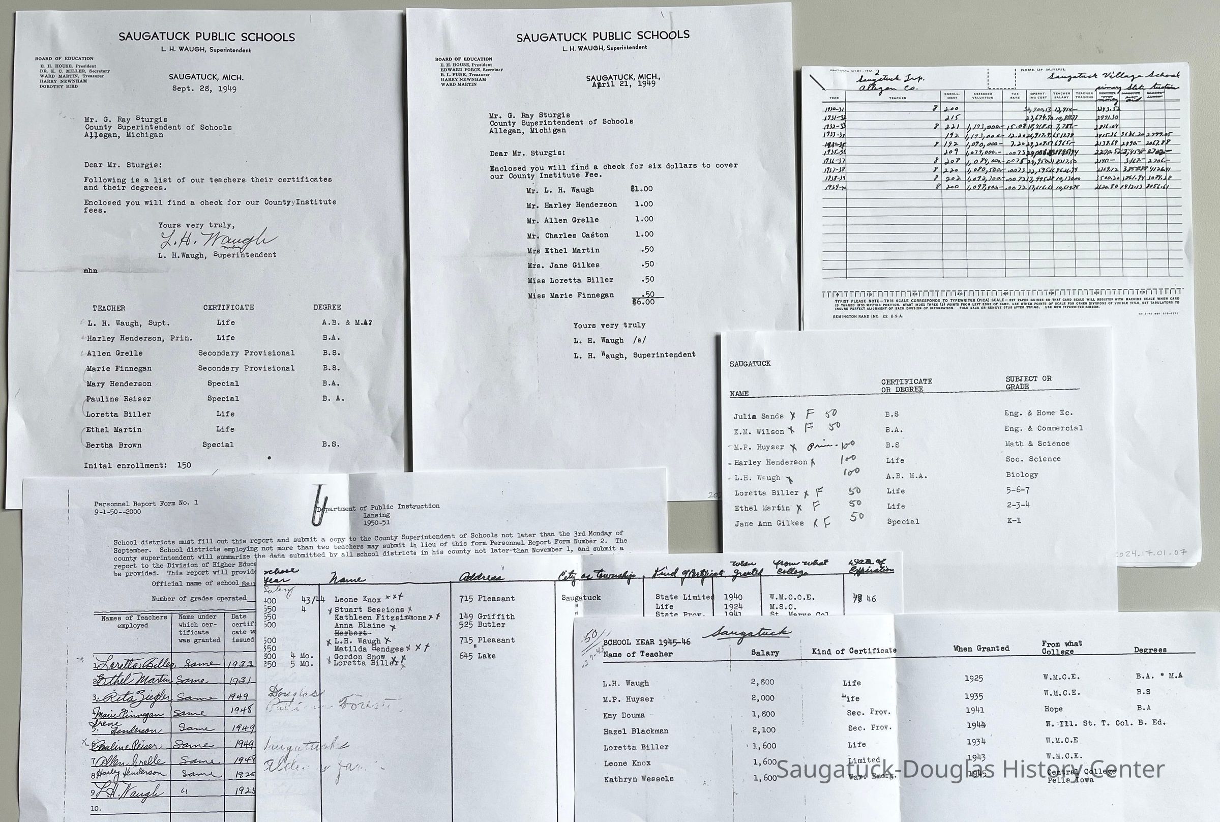 Contains names, addresses, salaries and credentials of local teaching staff. Documents 1-7 pertain to Saugatuck schools, 8-17 to Fennville schools.