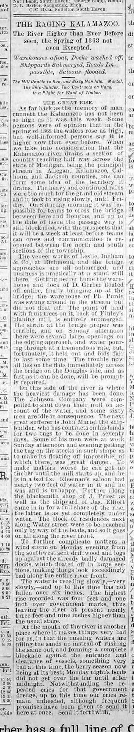 Nichols, Stephen D. 1806-1887Zwemer, Adrian Cornelius 1835-1909Purdy, Philetus "Fleet" 1835-1922Gerber, Daniel 1820-1890Griffin & Henry Lumber Yard/Griffin & Henry Sawmill/Griffin & Williams/Stockbridge & Johnson/Wells & Johnson/M.B. Spencer MillMartel, John Baptiste c1894-1909Kleeman, Theodore F. 1829-1906321 Water St./Saugatuck Tea Party/Tuscan Pot/Kleeman's TavernPriest, John 1836-1922Elliott, James 1830-1911Kingsley, Leonard 1824-1893Brown, John H.C. 1837-1910Wheeler, John 1824-1910Old Chain Ferry Scows c1836-1947Upham, Sherman D. 1858-1940Taylor, Alfred Blake Sr. 1846-1920Wade, Clarence W. 1855-1928Thew, Charles Nelson 1865-1927Dole, James Knox 1844-1910Metzger, Jacob "Jake" Friederich 1854-1928Bennett, ArtusClipson, Samuel 1826-1905