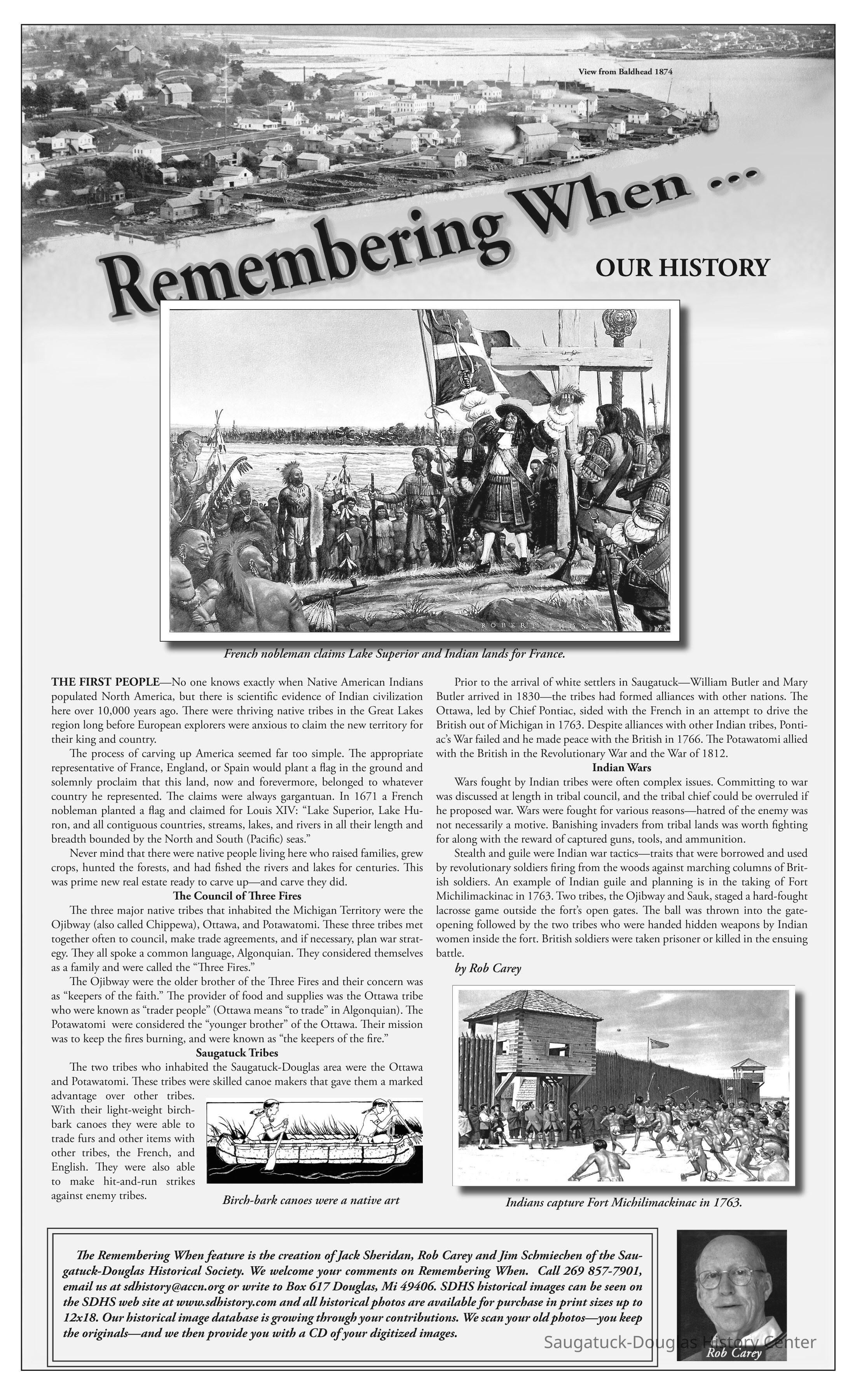 THE FIRST PEOPLE—No one knows exactly when Native American Indians populated North America, but there is scientific evidence of Indian civilization here over 10,000 years ago. There were thriving native tribes in the Great Lakes region long before European explorers were anxious to claim the new territory for their king and country. The process of carving up America seemed far too simple. The appropriate representative of France, England, or Spain would plant a flag in the ground and solemnly proclaim that this land, now and forevermore, belonged to whatever country he represented. The claims were always gargantuan. In 1671 a French nobleman planted a flag and claimed for Louis XIV: “Lake Superior, Lake Huron, and all contiguous countries, streams, lakes, and rivers in all their length and breadth bounded by the North and South (Pacific) seas.” Never mind that there were native people living here who raised families, grew crops, hunted the forests, and had fished the rivers and lakes for centuries. This was prime new real estate ready to carve up—and carve they did. The Council of Three Fires The three major native tribes that inhabited the Michigan Territory were the Ojibway (also called Chippewa), Ottawa, and Potawatomi. These three tribes met together often to council, make trade agreements, and if necessary, plan war strategy. They all spoke a common language, Algonquian. They considered themselves as a family and were called the “Three Fires.” The Ojibway were the older brother of the Three Fires and their concern was as “keepers of the faith.” The provider of food and supplies was the Ottawa tribe who were known as “trader people” (Ottawa means “to trade” in Algonquian). The Potawatomi were considered the “younger brother” of the Ottawa. Their mission was to keep the fires burning, and were known as “the keepers of the fire.” Saugatuck Tribes The two tribes who inhabited the Saugatuck-Douglas area were the Ottawa and Potawatomi. These tribes were skilled canoe makers that gave them a marked advantage over other tribes. With their light-weight birchbark canoes they were able to trade furs and other items with other tribes, the French, and English. They were also able to make hit-and-run strikes against enemy tribes. Prior to the arrival of white settlers in Saugatuck—William Butler and Mary Butler arrived in 1830—the tribes had formed alliances with other nations. The Ottawa, led by Chief Pontiac, sided with the French in an attempt to drive the British out of Michigan in 1763. Despite alliances with other Indian tribes, Pontiac’s War failed and he made peace with the British in 1766. The Potawatomi allied with the British in the Revolutionary War and the War of 1812. Indian Wars Wars fought by Indian tribes were often complex issues. Committing to war was discussed at length in tribal council, and the tribal chief could be overruled if he proposed war. Wars were fought for various reasons—hatred of the enemy was not necessarily a motive. Banishing invaders from tribal lands was worth fighting for along with the reward of captured guns, tools, and ammunition. Stealth and guile were Indian war tactics—traits that were borrowed and used by revolutionary soldiers firing from the woods against marching columns of British soldiers. An example of Indian guile and planning is in the taking of Fort Michilimackinac in 1763. Two tribes, the Ojibway and Sauk, staged a hard-fought lacrosse game outside the fort’s open gates. The ball was thrown into the gate-opening followed by the two tribes who were handed hidden weapons by Indian women inside the fort. British soldiers were taken prisoner or killed in the ensuing battle. by Rob Carey