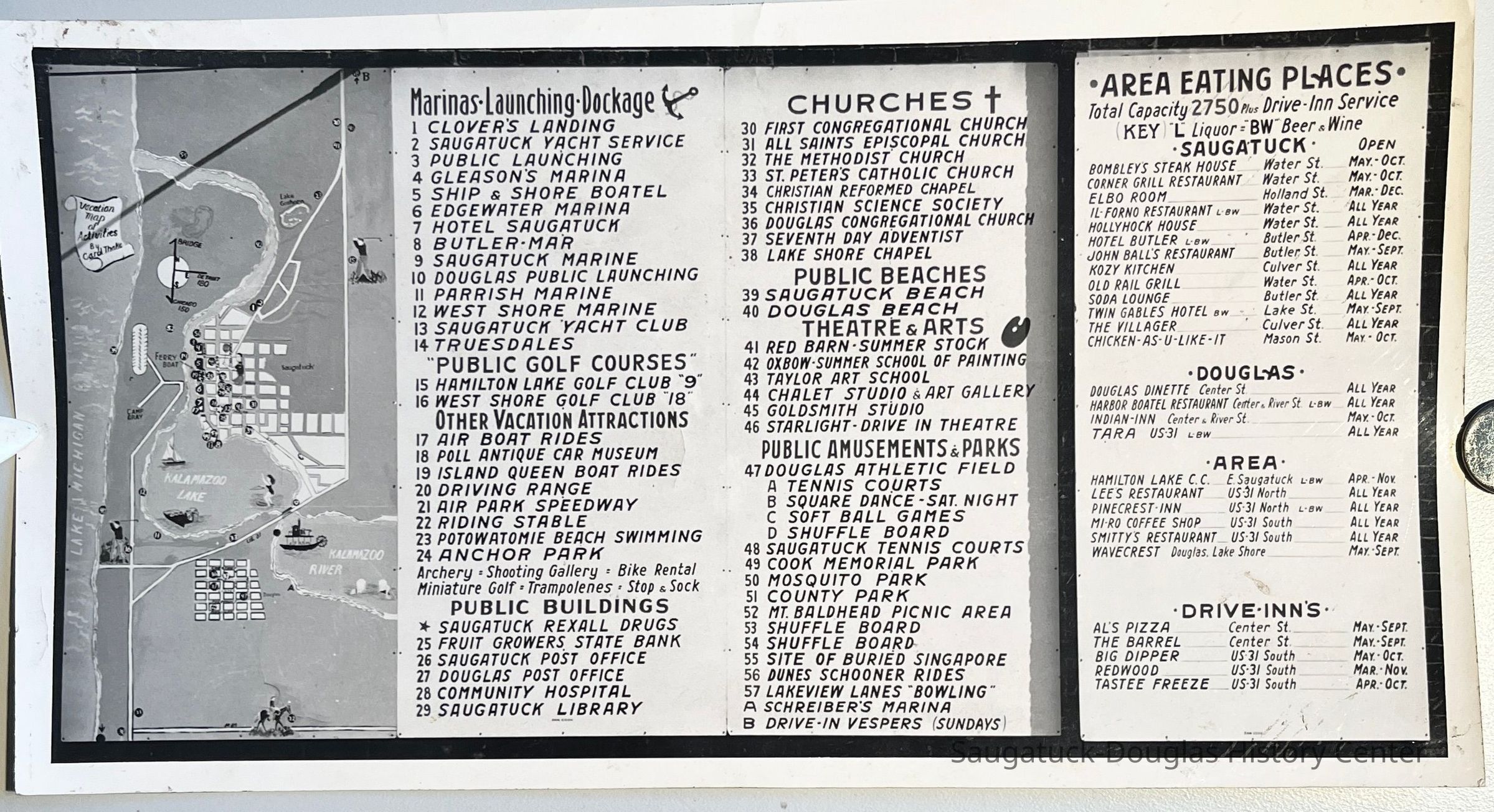 880 Holland/Southerner/Elbo Room/Clover's LandingSaugatuck Yacht ServiceSaugataco/River Market/Gleason's Party Store/Best Chance ChartersShip-N-Shore Hotel 1959-220 Water/Coral Gables/Hotel Saugatuck/Columbia Hotel/Leiendecker's InnWest Shore Marine/West Shore Ferry landing/Tisdale Boat LiverySaugatuck Yacht ClubClearbrook Golf Club/Hamilton Lake Club/Saugatuck Golf ClubWest Shore Golf Course 1920-Island Queen I and II PaddlewheelersCloverleaf Stadium/Airpark Speedway/AirPark AirportPottawattamie Beach ClubAnchor Park Amusement Center 1951-1975201 Butler/Saugatuck Drug/Rexall/Parrish's Drug/Hotel Hamilton/Saugatuck House 1852-1913Mize Rose Garden north side/Fruit Growers State Bank/Clapp's Grocery/Flint's Shoes/Walz Meat Market/Griffin/TannerOval Beach 1936-presentDouglas Beach, Stairs and ParkEmerson Lounge/Guardian Brewery/Red Barn Theater/PlayhouseOx-Bow/Summer School of ArtTaylor Art School 1931-Chalet Studio and Art Gallery546 Butler/Jean Goldsmith House/Camp Willow/das bauhausStarlight Drive-in Theatre 1947-1987Beery Field/Douglas Athletic FieldDune RidesAlley's Lakeview Lanes/Collins' Community Lanes BowlingRoot Beer Barrel 1950-Redwood InnBlue Star Cafe/141 BSHwy/M&M's/Tastee-TreetTruesdales MarinaOld Rail Garden Restaurant/505 or 500 Water/burned 1982Singapore Yacht Club 1959-present