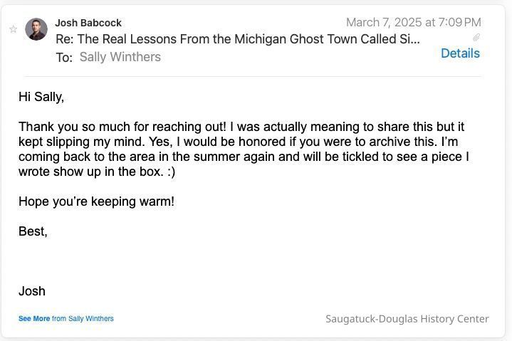 After the Republic of Singapore's Prime Minister Lawrence Wong mentioned Michigan's Singapore in a 2024 speech, awareness and curiosity about the "ghost town" has grown in the minds of the Republic of Singapore's people. After multiple visits to the area, and to the SDHC archives, anthropologist Joshua Babcock authored this essay.