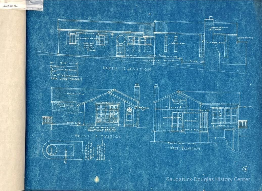This booklet of blueprints consists of five pages of drawings for the studio/residence being built in South Laguna. It includes detailed drawings of the exterior of the house as well as details and materials. A page also consists of interior details.