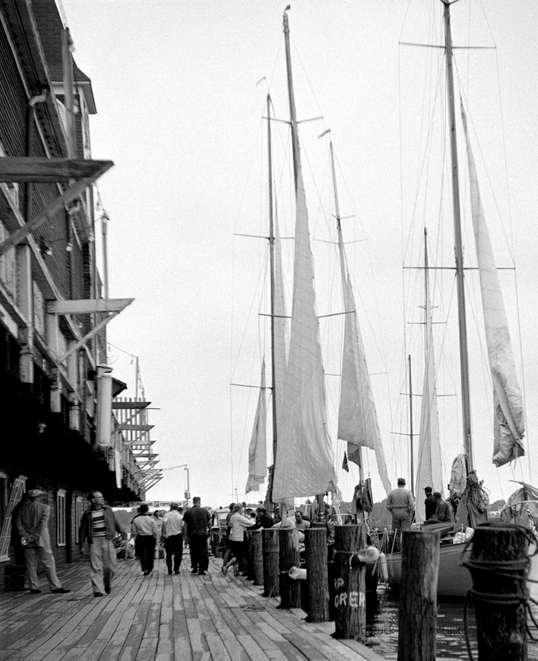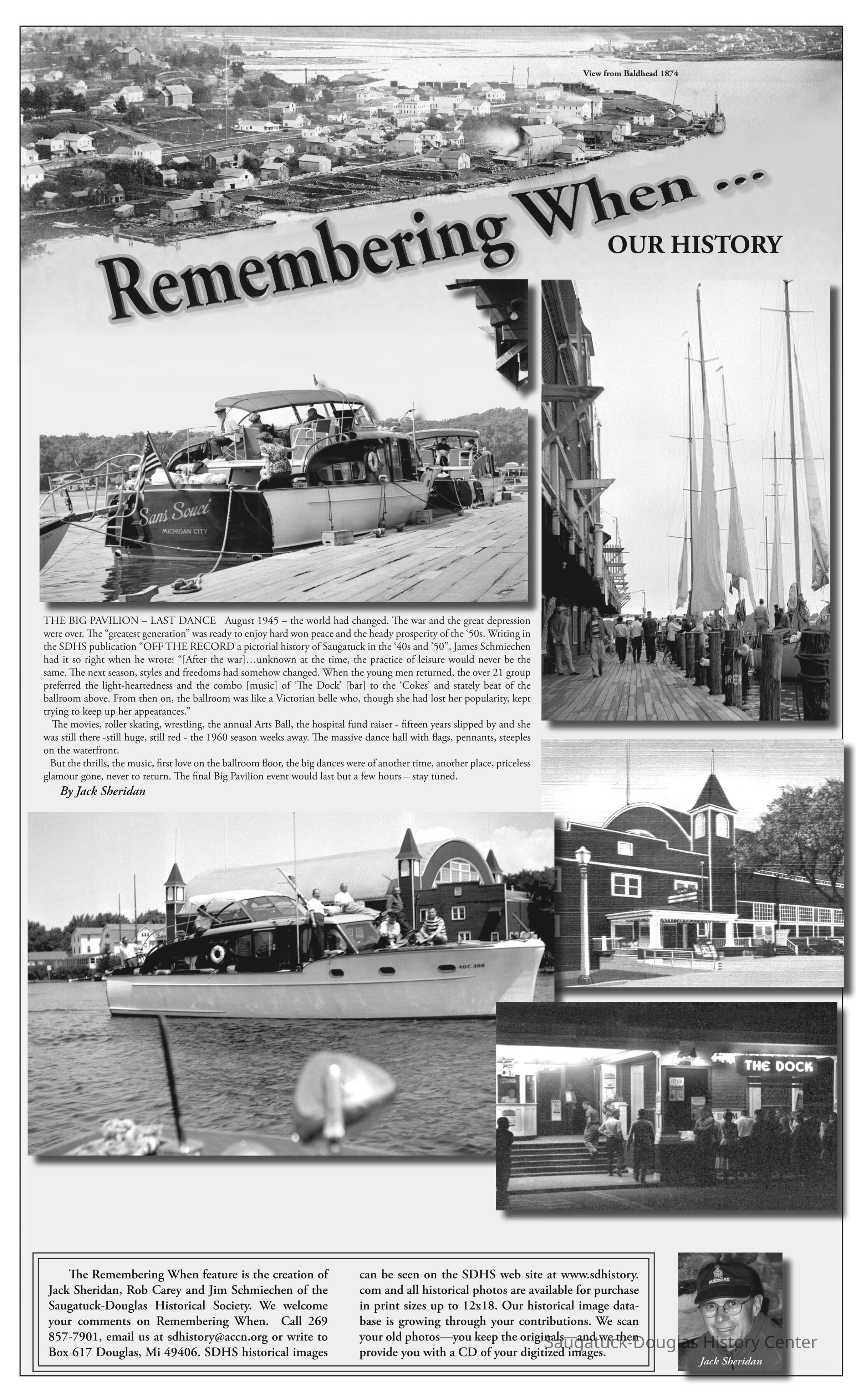 THE BIG PAVILION – LAST DANCE August 1945 – the world had changed. The war and the great depression were over. The “greatest generation” was ready to enjoy hard won peace and the heady prosperity of the ‘50s. Writing in the SDHS publication “OFF THE RECORD a pictorial history of Saugatuck in the ‘40s and ’50”, James Schmiechen had it so right when he wrote: “[After the war]…unknown at the time, the practice of leisure would never be the same. The next season, styles and freedoms had somehow changed. When the young men returned, the over 21 group preferred the light-heartedness and the combo [music] of ‘The Dock’ [bar] to the ‘Cokes’ and stately beat of the ballroom above. From then on, the ballroom was like a Victorian belle who, though she had lost her popularity, kept trying to keep up her appearances.” The movies, roller skating, wrestling, the annual Arts Ball, the hospital fund raiser - fifteen years slipped by and she was still there -still huge, still red - the 1960 season weeks away. The massive dance hall with flags, pennants, steeples on the waterfront. But the thrills, the music, first love on the ballroom floor, the big dances were of another time, another place, priceless glamour gone, never to return. The final Big Pavilion event would last but a few hours – stay tuned. By Jack Sheridan