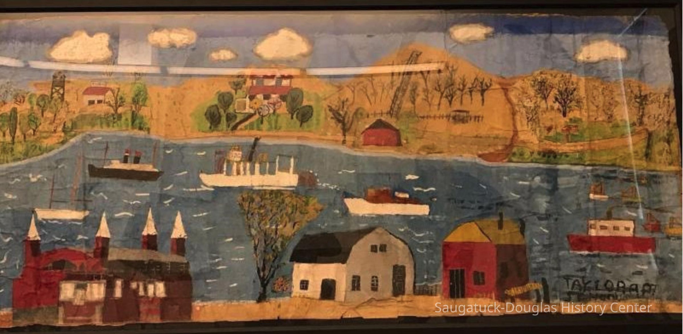 Motive is the Kalamazoo River with the cottages, the Big Pavilion, Mt. Baldhead and steps, barns and boat on the water.
