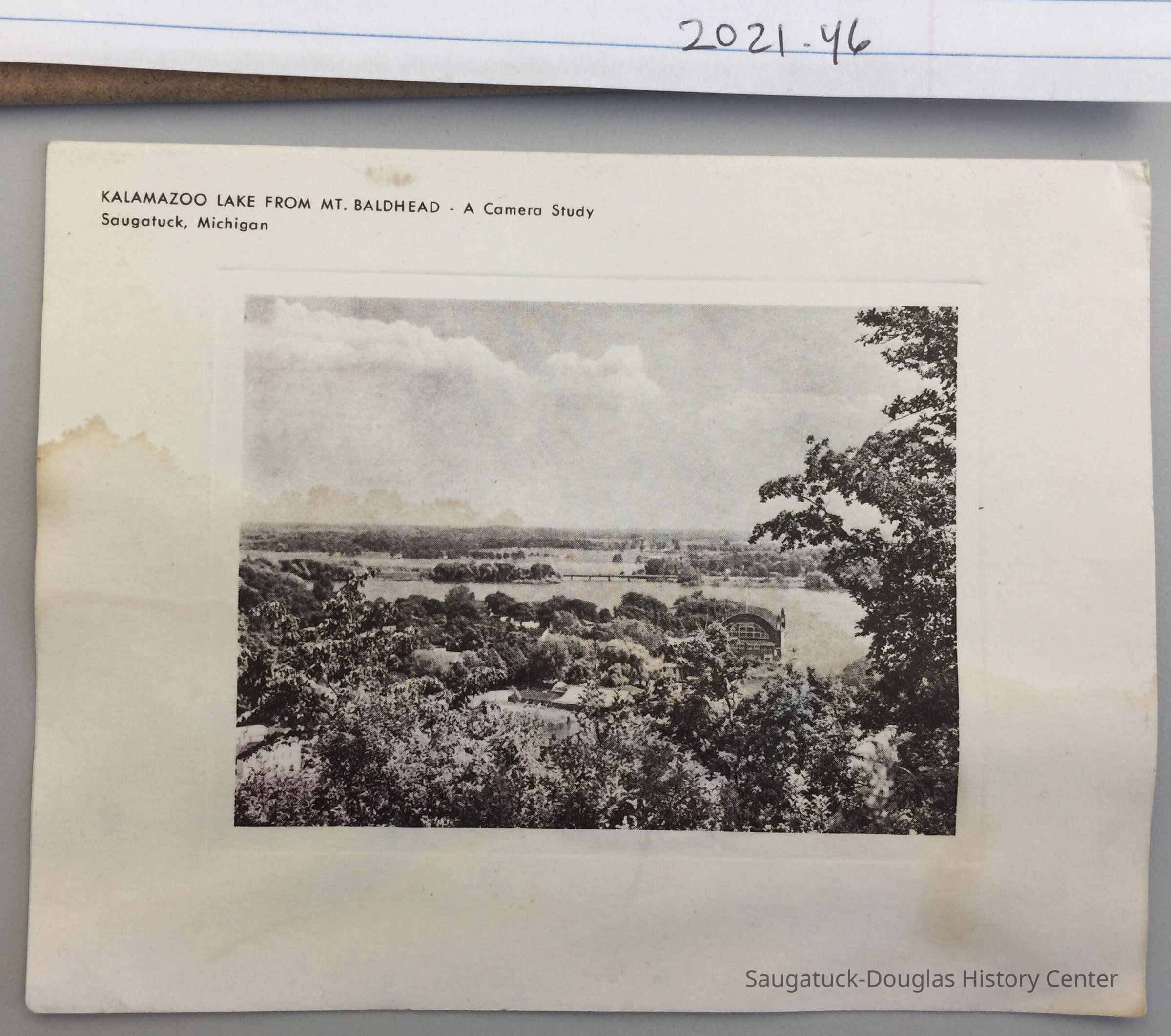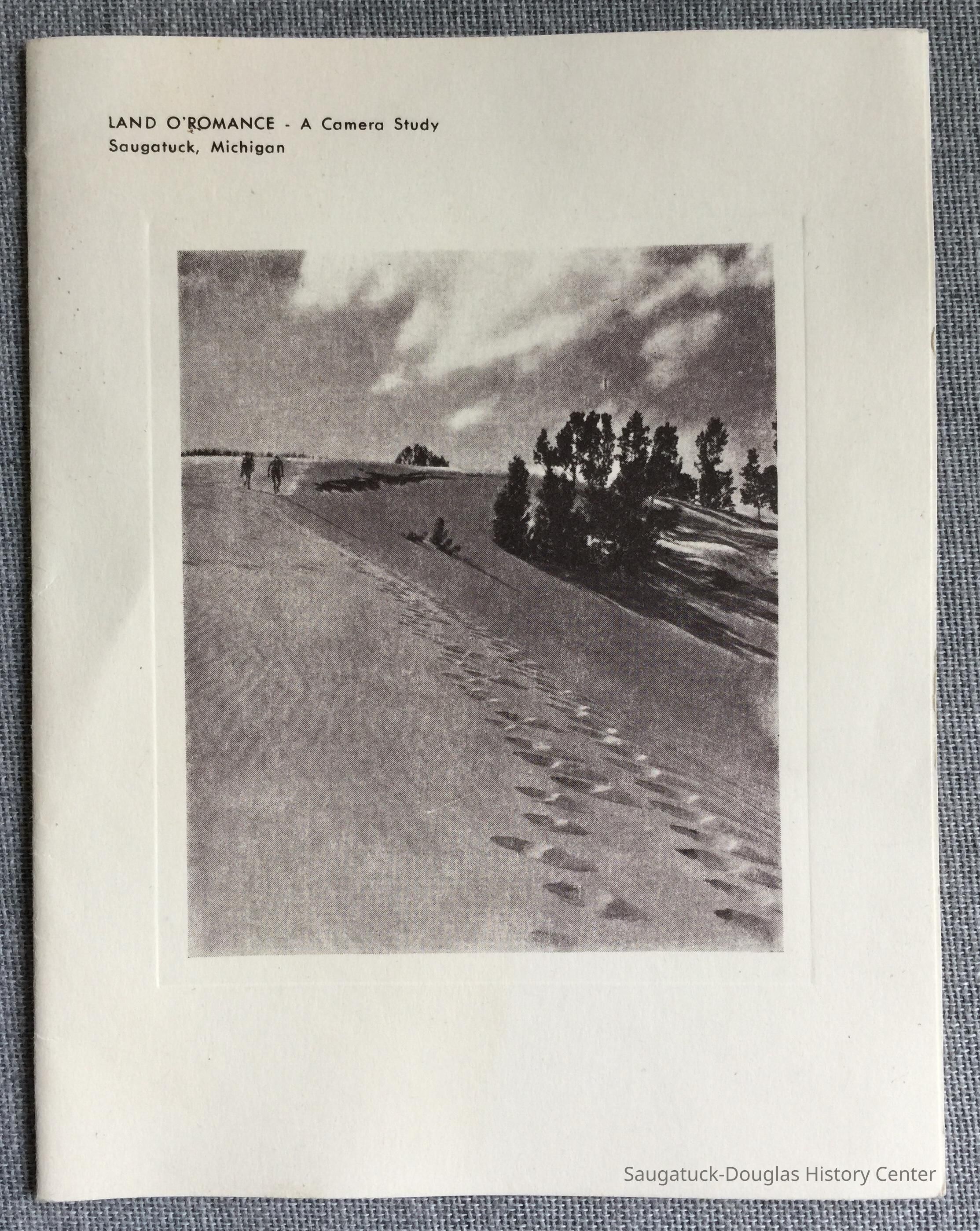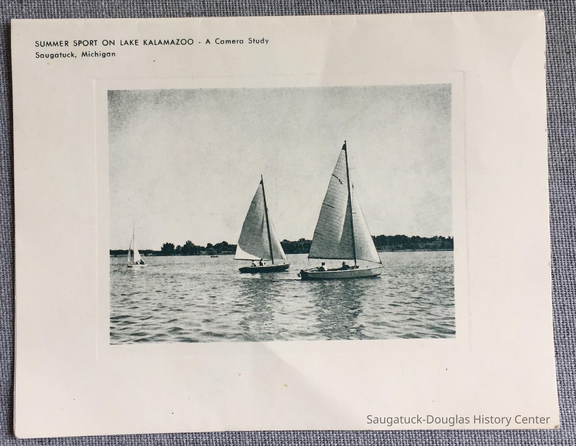 Three blank, folded cards adorned with commercial lithographs and embossing to frame the images. The first card (blue ink) is a photo of small sail boats. The second card (purple-brown ink) is a photo of the crest of a dune with footprints in the foreground and two figures in the distance. The third is a view of Saugatuck from Mt. Baldhead with water-stained paper.