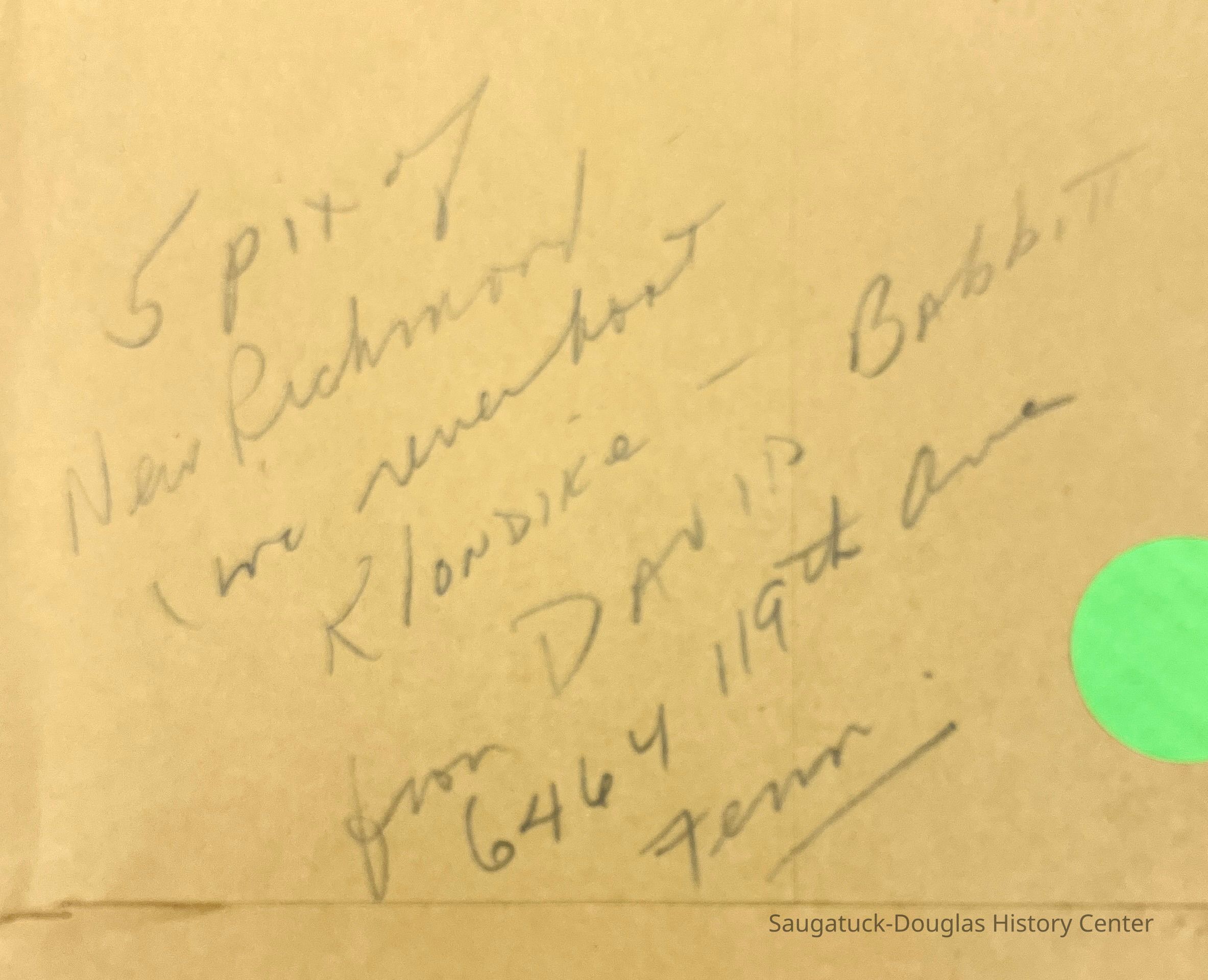 A handwritten note on the envelope states "5 pix of New Richmond inc. riverboat Klondike - David Babbitt from 6464 119th Ave. Fenn."