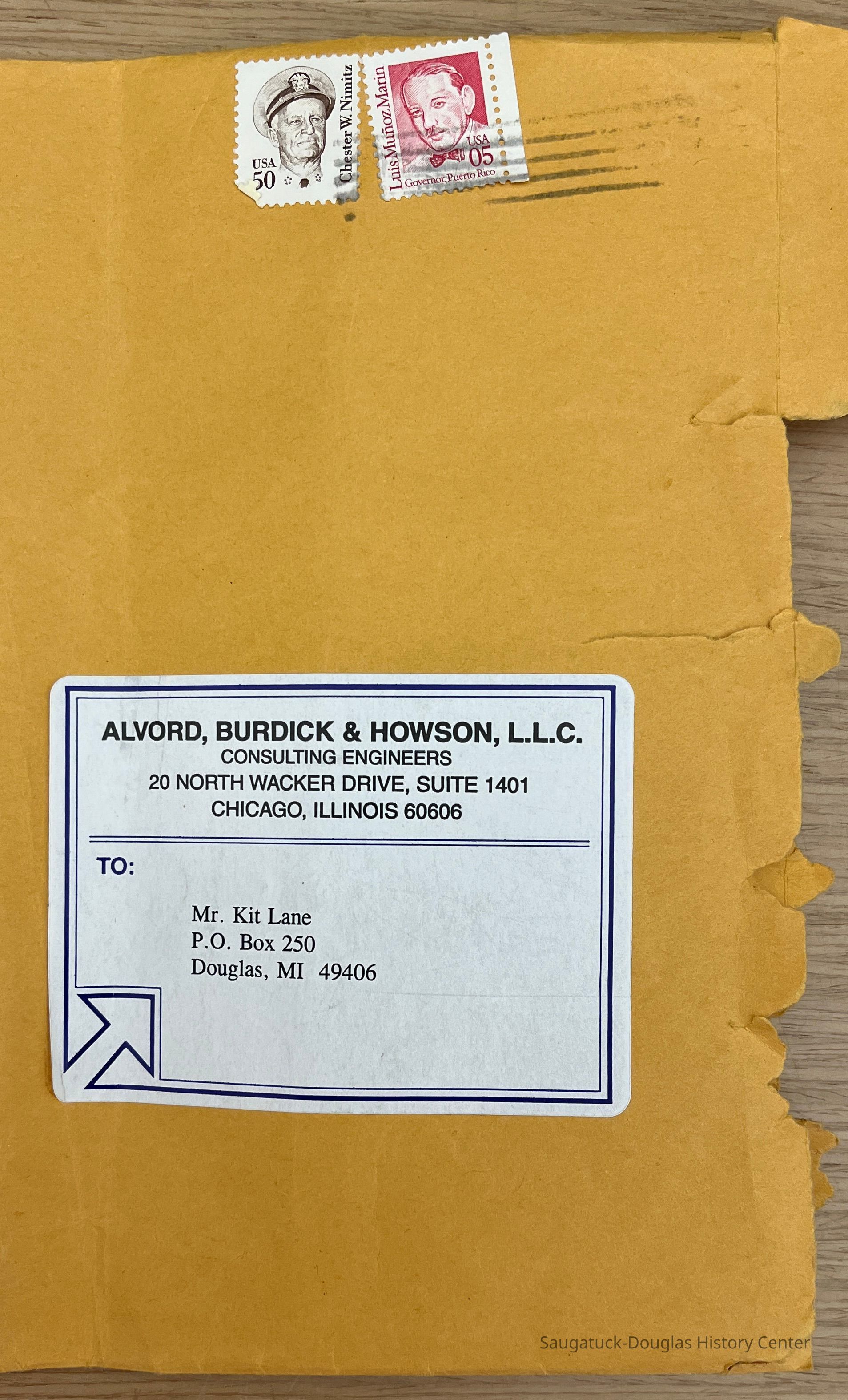 The photos are in a manila envelope with a mailing label indicating they were mailed to Kit Lane from Alvord, Burdick & Howson LLC Consulting Engineers in Chicago.