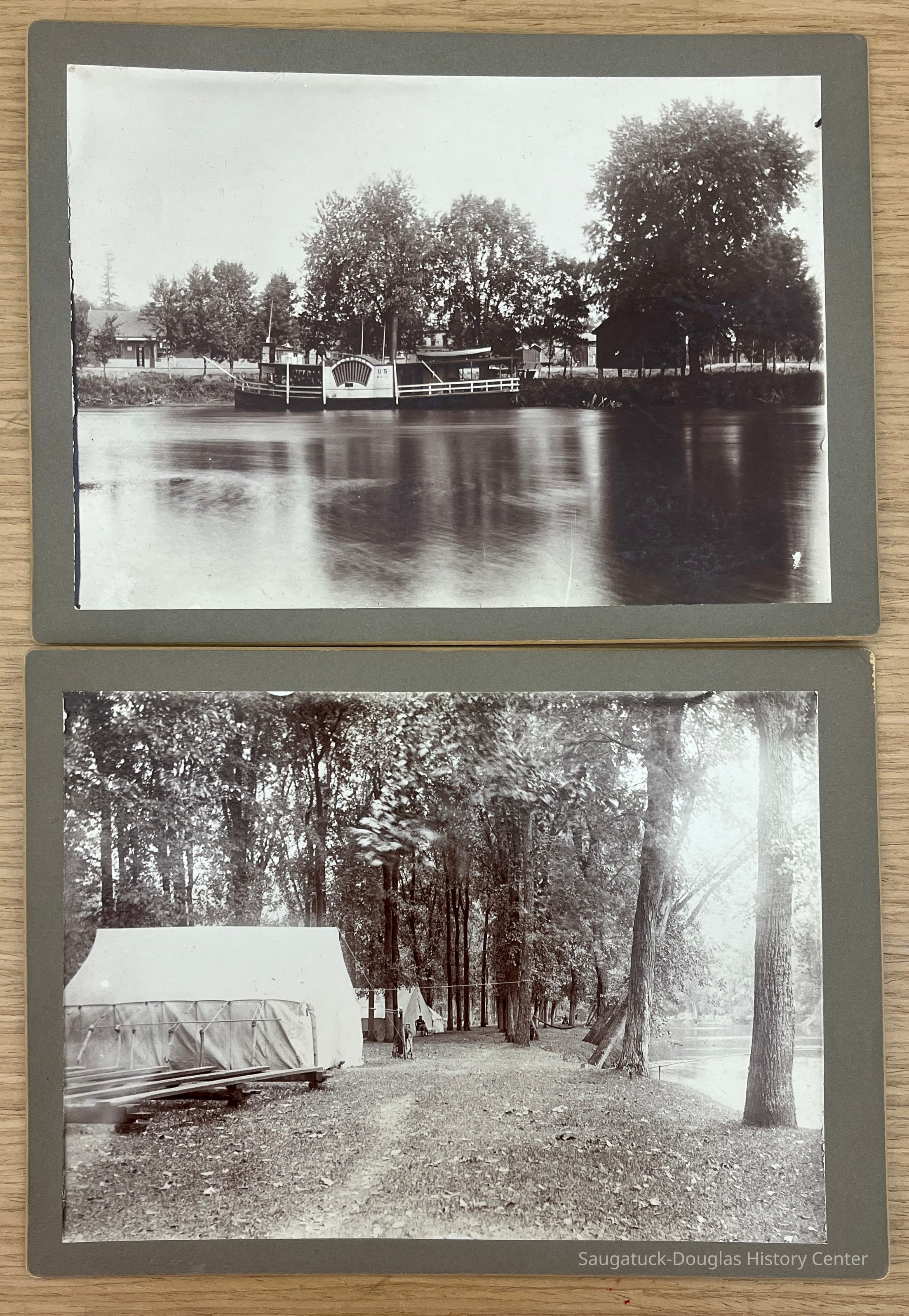 1. Riverboat Klondike docked beside a small gathering of buildings. "U.S. Mail" is painted on the boat's side wheel housing. "Klondike" is written on the back of the photo.