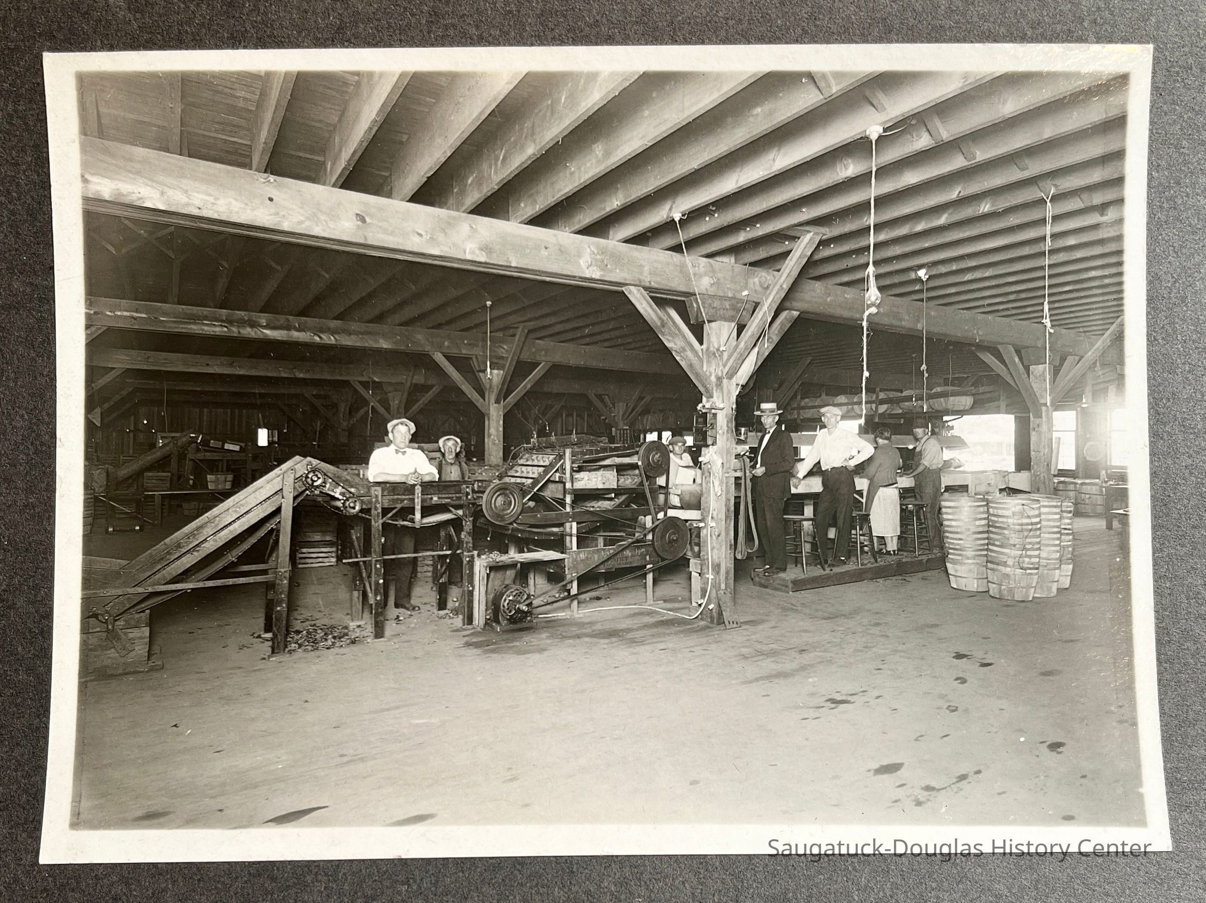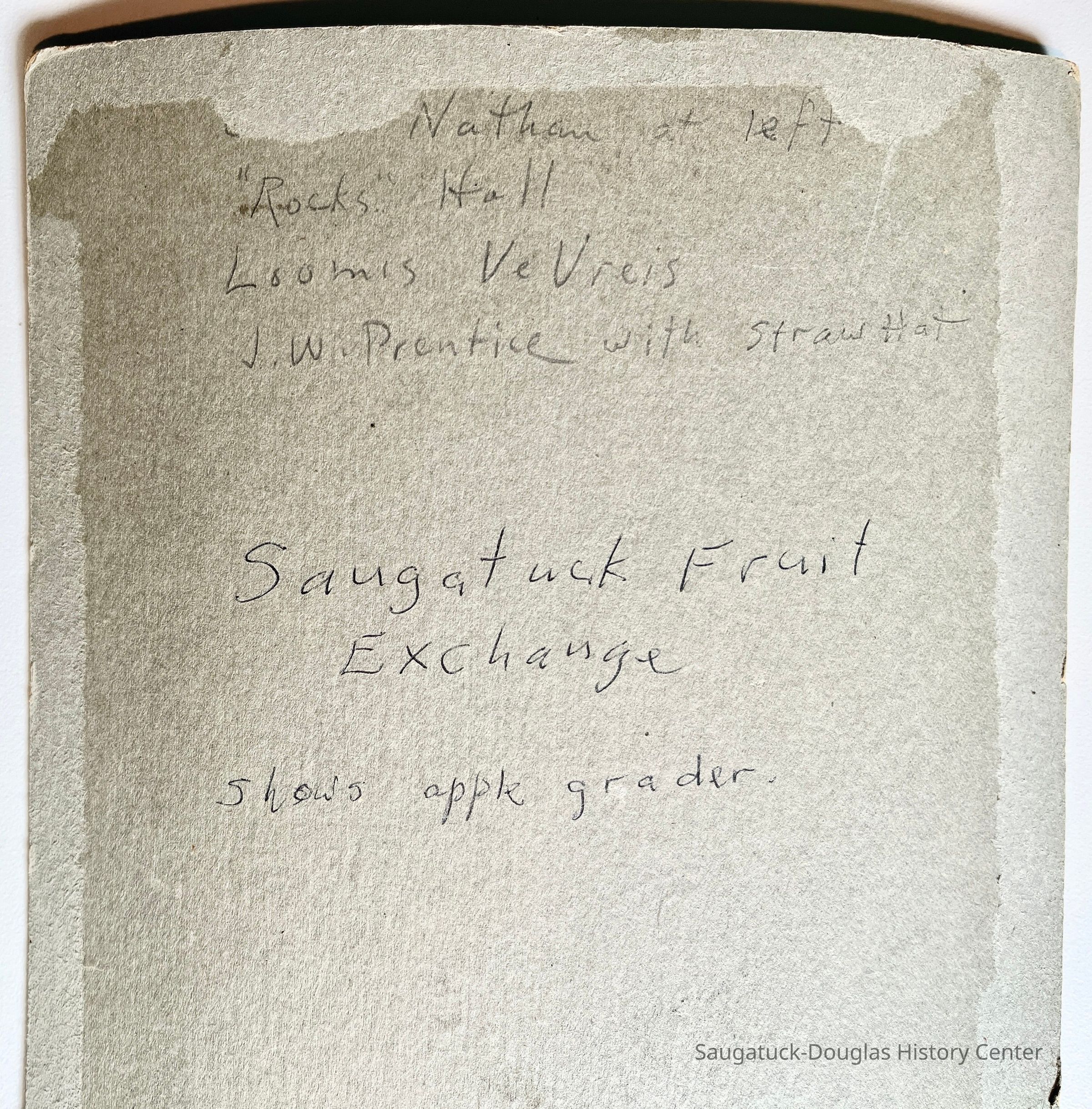 Photo of men posing by an apple-sorting machine. The print is mounted on a 7x9" board. Written on the back of the board is "Nathan at left; "Rocks" Hall; Loomis VeVries; J.W. Prentice with straw hat; Saugatuck Fruit Exchange; Shows apple grader."