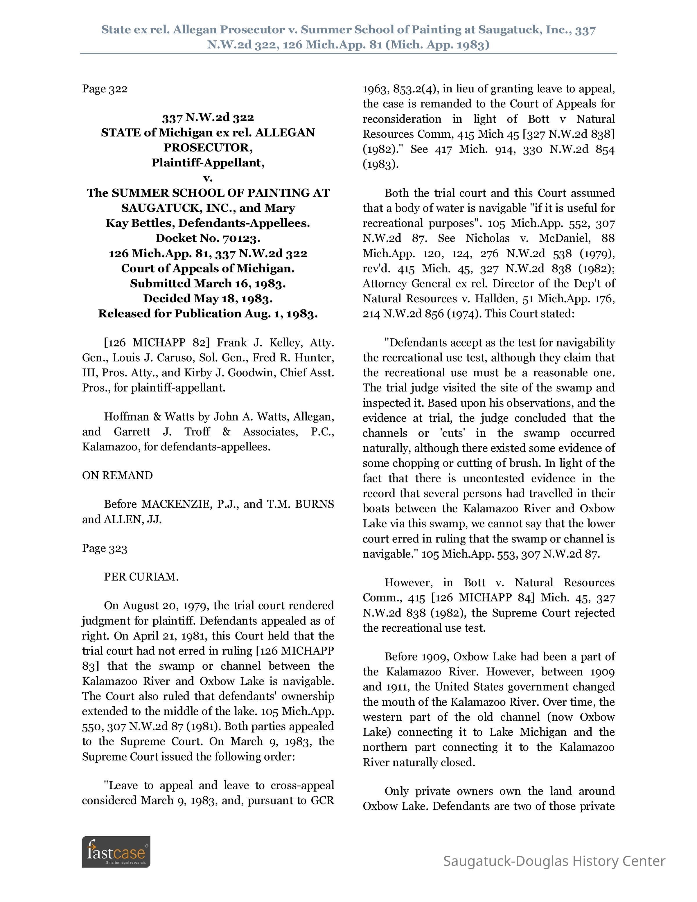This is one document in a multi-year, multi-appeal legal battle to decide who may have access to the Ox-Bow lagoon. This amicus or "friend of the court" brief was submitted by the Michigan Attorney General Frank J. Kelley, Solicitor General Louis J. Caruso, and Asst. Attorneys General Terrence P. Grady and Russel E. Prins of the Lands, Lakes and Leases Division in Lansing, who were all not parties in the case but had a strong interest in any precedent the case may establish. The state of Michigan's opinion was that the Ox-Bow lagoon it is a public lake with a navigable entrance because a recreational boat with passengers aboard can pass through it without touching bottom. Therefore it is illegal for the defendants to interfere with public access to the lake. The defendants in the case included people who owned the property around the lagoon, the Summer School of Painting [Ox-Bow] and Mary Kay Bettles. They maintained that the lagoon is private because the swamp that connected the lagoon to the Kalamazoo River is not navigable and because the body of water is completely surrounded by private land. They felt public has no right to use the lagoon and so it was within their rights to prohibit its use. The conclusion of the amicus brief reads "The Court of Appeals has erroneously concluded that the subject body of water is a "private lake", erroneously assuming that the title to all land riparian [on the edge of a body of water] to the subject "lake" is in private ownership. The opinion and order of the court, if not reversed, will result in a manifest injustice to the people depriving them of their right to utilize such waters for boating, bathing and other recreational pursuits." In the end, the Michigan Supreme Court declined to hear this case. Instead it instructed the appeal court to reconsider the case in the light of a similar ruling about definition of navigable lakes.