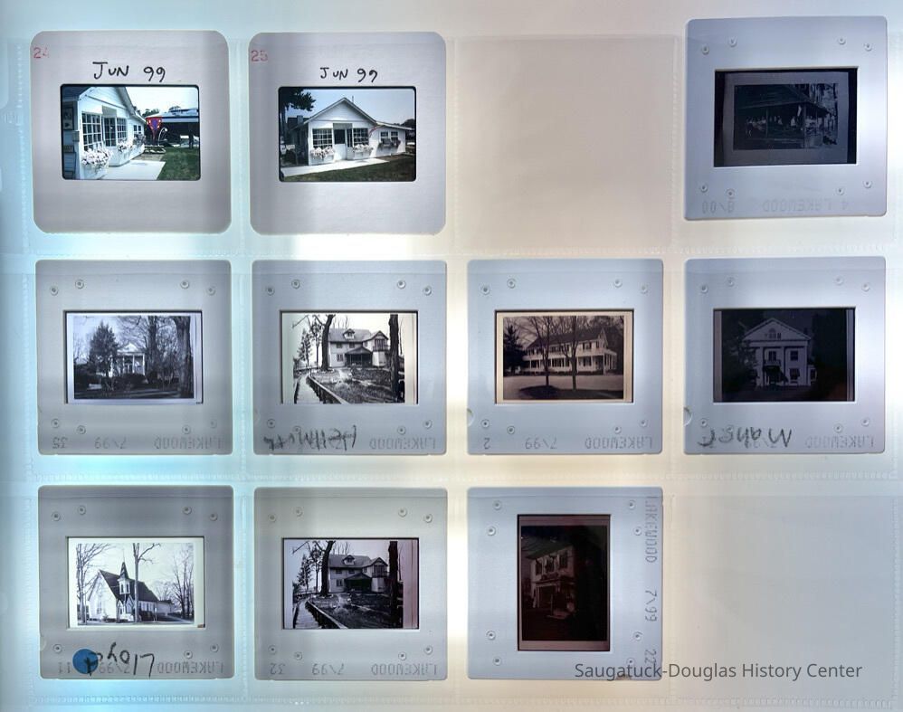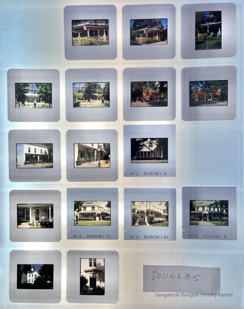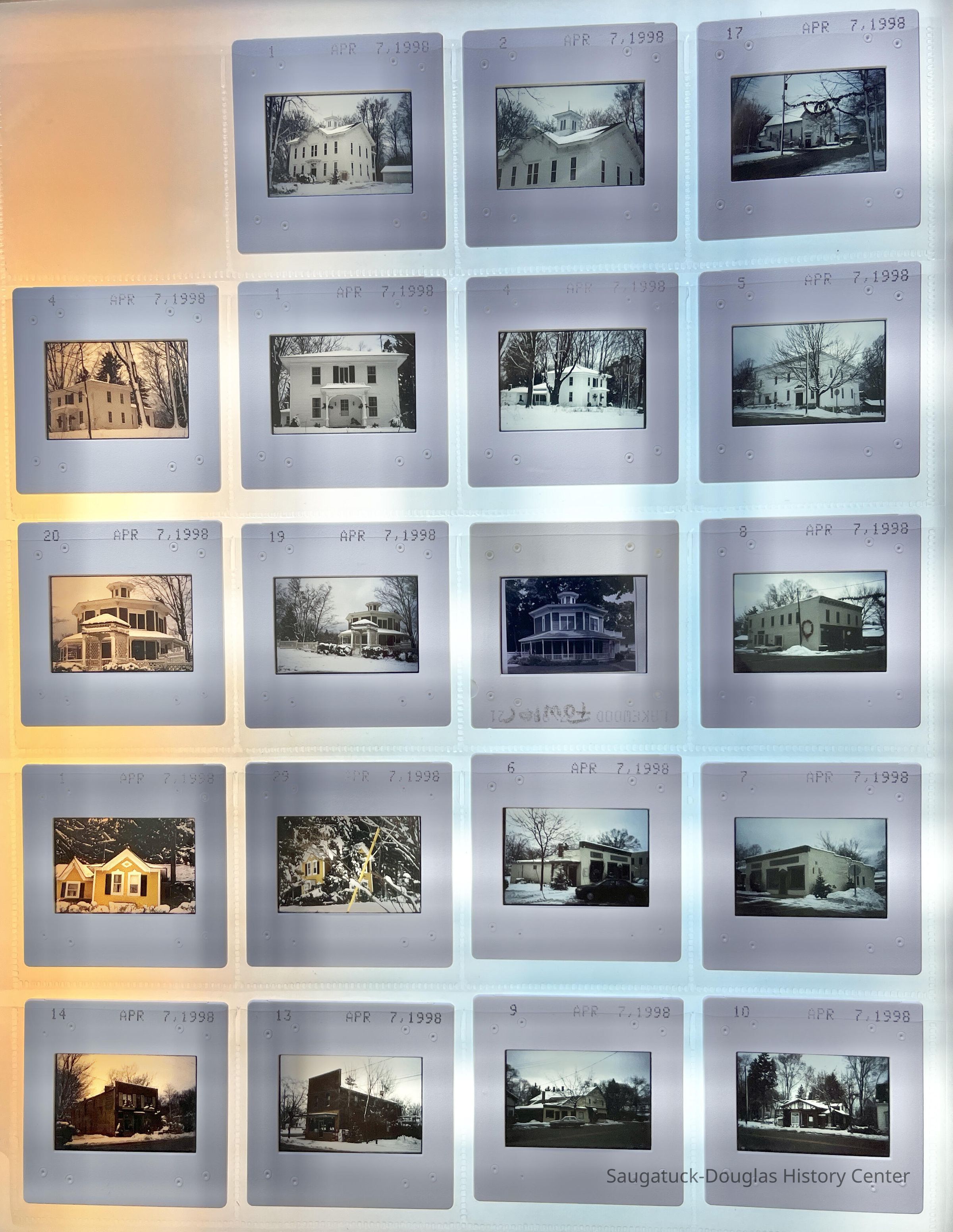 Color slide photos of historic buildings, houses and barns in Douglas and Saugatuck created by Mike or Mae Van Ark from 1994 to 1998. Many taken in winter. Structures include one sheet of Vicki Stull photos of Park House, Christian Science Church, All Saints Episcopal, Saugatuck City Hall, the Maplewood Hotel and residences unknown to this cataloger.