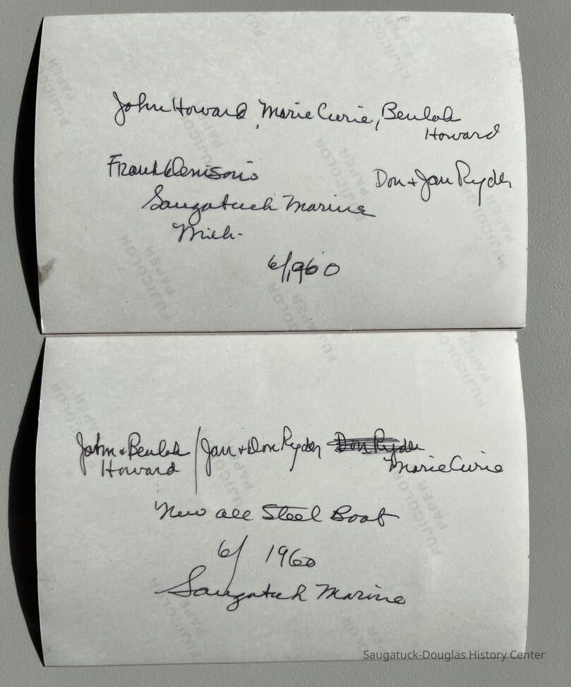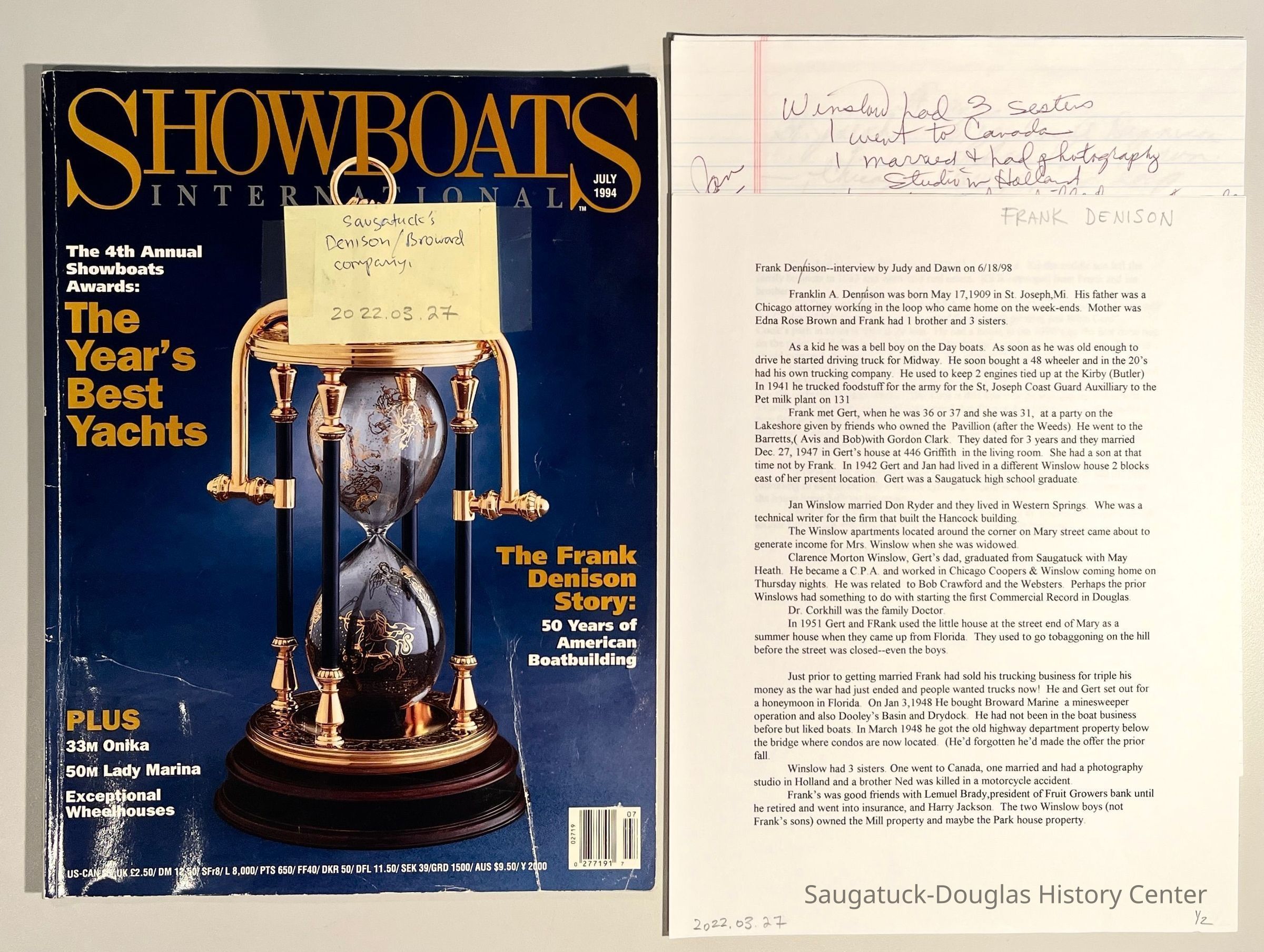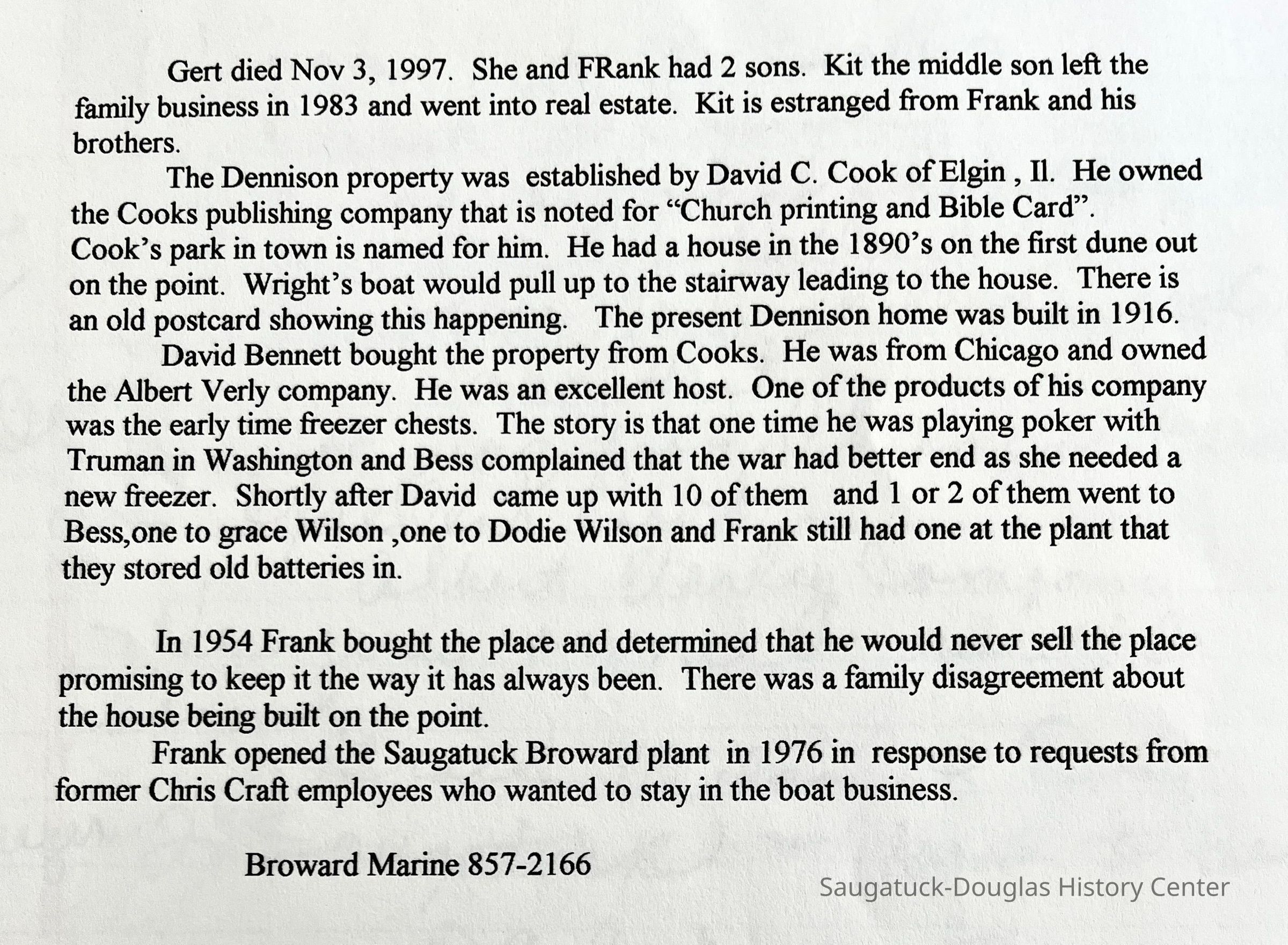 Broward Marine "North" 1979-c1999Denison, Frank A. 1909-2000Denison, Gertude B. (Winslow) "Shoosh" 1915-1997Ryder, Janet (Winslow) 1917-2002Denison, Kenelm "Ken" W.Denison, Christopher "Kit"Denison, Frank "Skipper" "Skip" Jr.Winslow, Geraldine (Strickland) 1893-1952Winslow, Clarence Morton 1885-1958446 Griffith/Pond-Winslow housePier Marina/Saugatuck Marine 1947-1970s