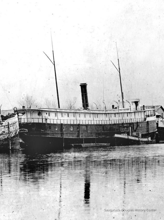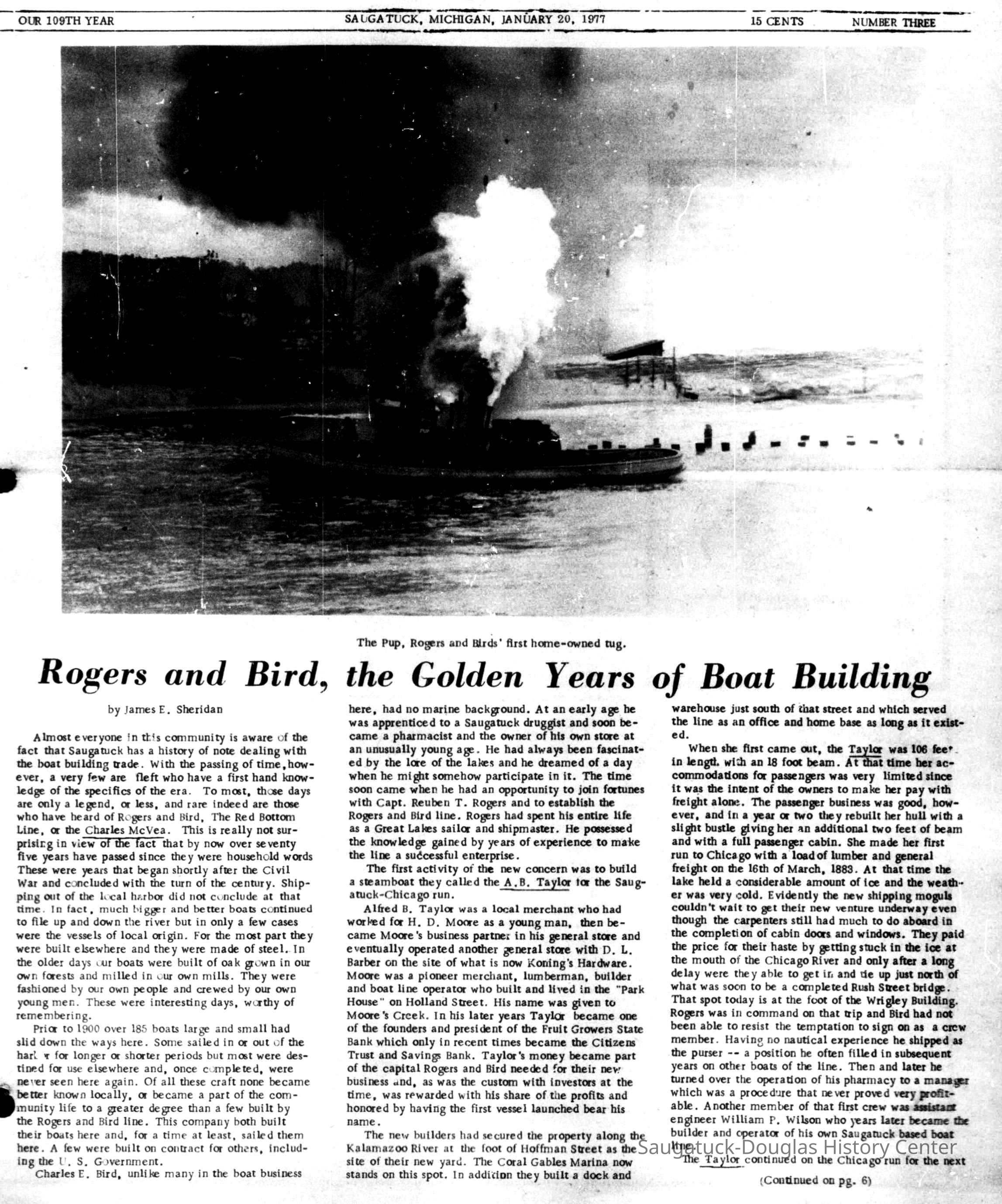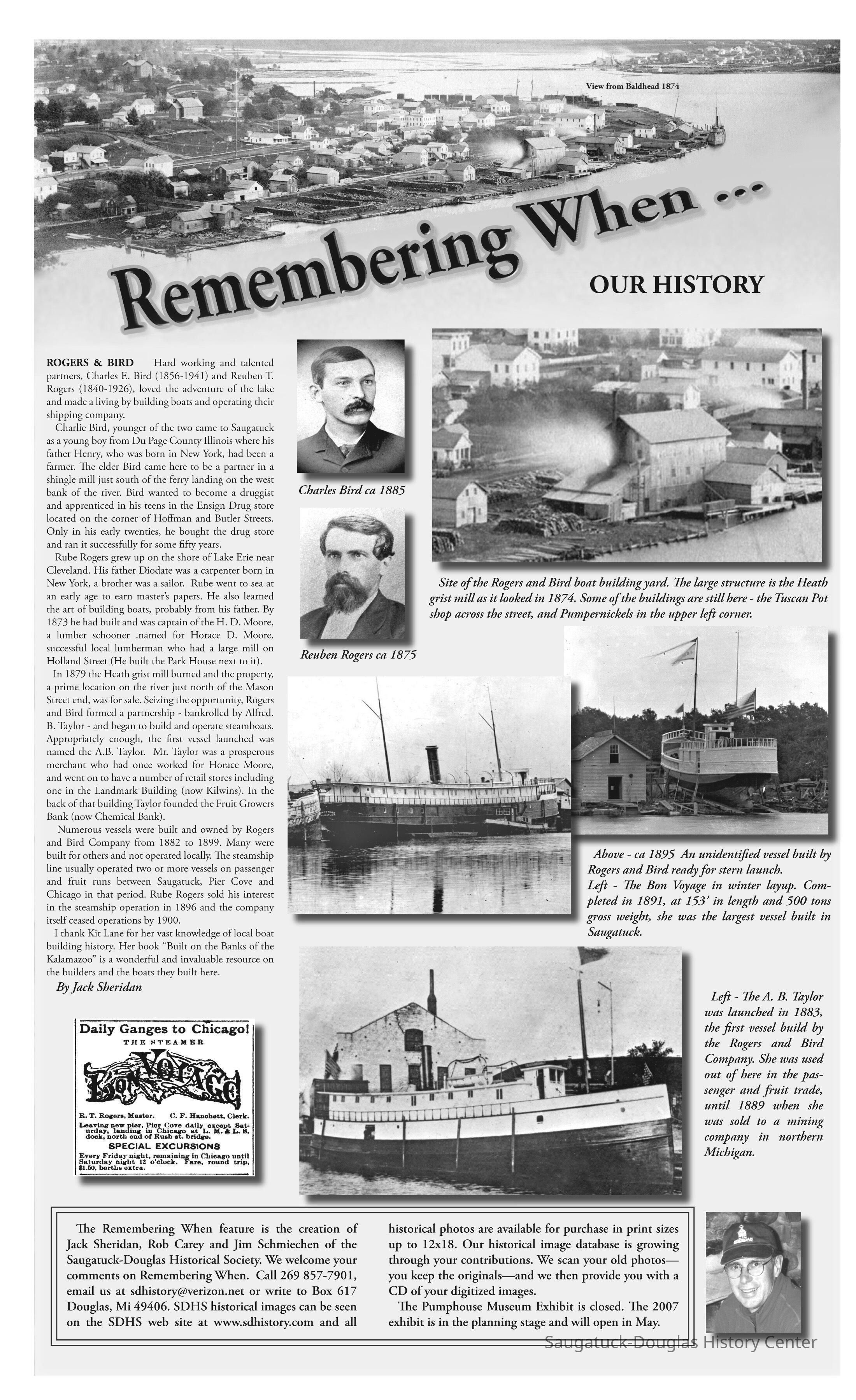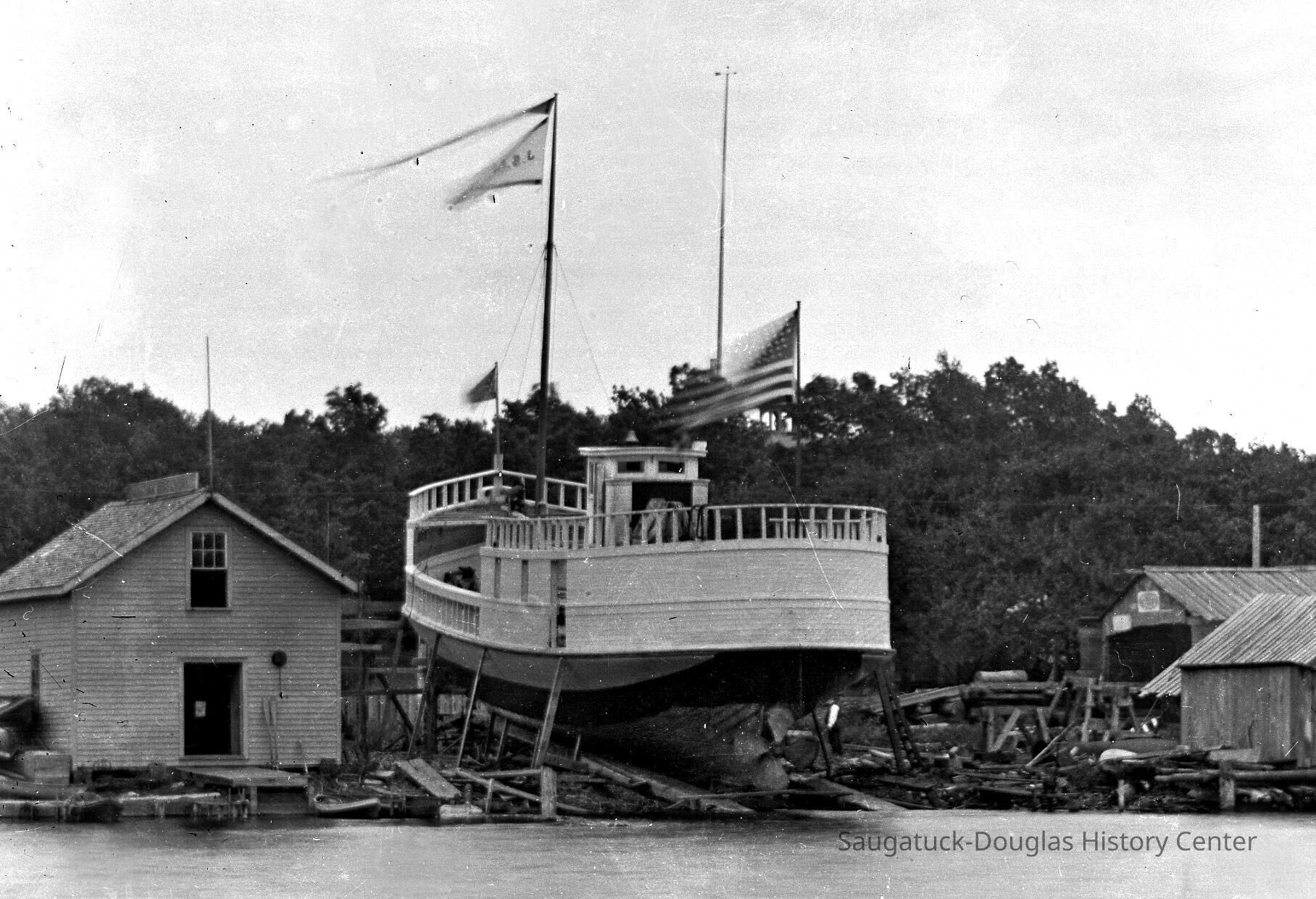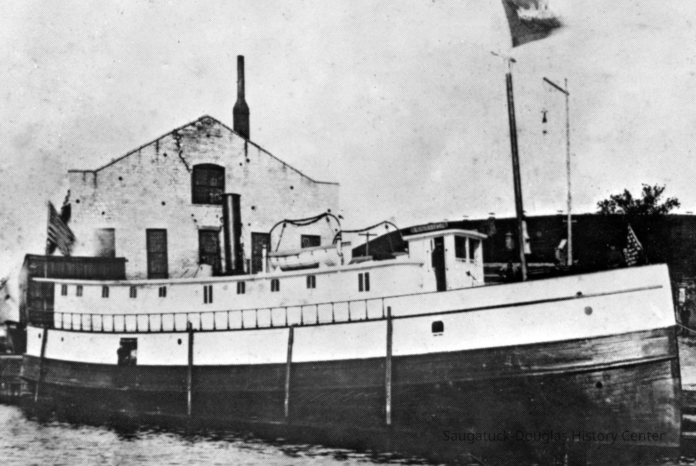 ROGERS & BIRD Hard working and talented partners, Charles E. Bird (1856-1941) and Reuben T. Rogers (1840-1926), loved the adventure of the lake and made a living by building boats and operating their shipping company. Charlie Bird, younger of the two came to Saugatuck as a young boy from Du Page County Illinois where his father Henry, who was born in New York, had been a farmer. The elder Bird came here to be a partner in a shingle mill just south of the ferry landing on the west bank of the river. Bird wanted to become a druggist and apprenticed in his teens in the Ensign Drug store located on the corner of Hoffman and Butler Streets. Only in his early twenties, he bought the drug store and ran it successfully for some fifty years. Rube Rogers grew up on the shore of Lake Erie near Cleveland. His father Diodate was a carpenter born in New York, a brother was a sailor. Rube went to sea at an early age to earn master’s papers. He also learned the art of building boats, probably from his father. By 1873 he had built and was captain of the H. D. Moore, a lumber schooner named for Horace D. Moore, successful local lumberman who had a large mill on Holland Street (He built the Park House next to it). In 1879 the Heath grist mill burned and the property, a prime location on the river just north of the Mason Street end, was for sale. Seizing the opportunity, Rogers and Bird formed a partnership - bankrolled by Alfred. B. Taylor - and began to build and operate steamboats. Appropriately enough, the first vessel launched was named the A.B. Taylor. Mr. Taylor was a prosperous merchant who had once worked for Horace Moore, and went on to have a number of retail stores including one in the Landmark Building (now Kilwins). In the back of that building Taylor founded the Fruit Growers Bank (now Chemical Bank). Numerous vessels were built and owned by Rogers and Bird Company from 1882 to 1899. Many were built for others and not operated locally. The steamship line usually operated two or more vessels on passenger and fruit runs between Saugatuck, Pier Cove and Chicago in that period. Rube Rogers sold his interest in the steamship operation in 1896 and the company itself ceased operations by 1900. I thank Kit Lane for her vast knowledge of local boat building history. Her book “Built on the Banks of the Kalamazoo” is a wonderful and invaluable resource on the builders and the boats they built here. By Jack Sheridan