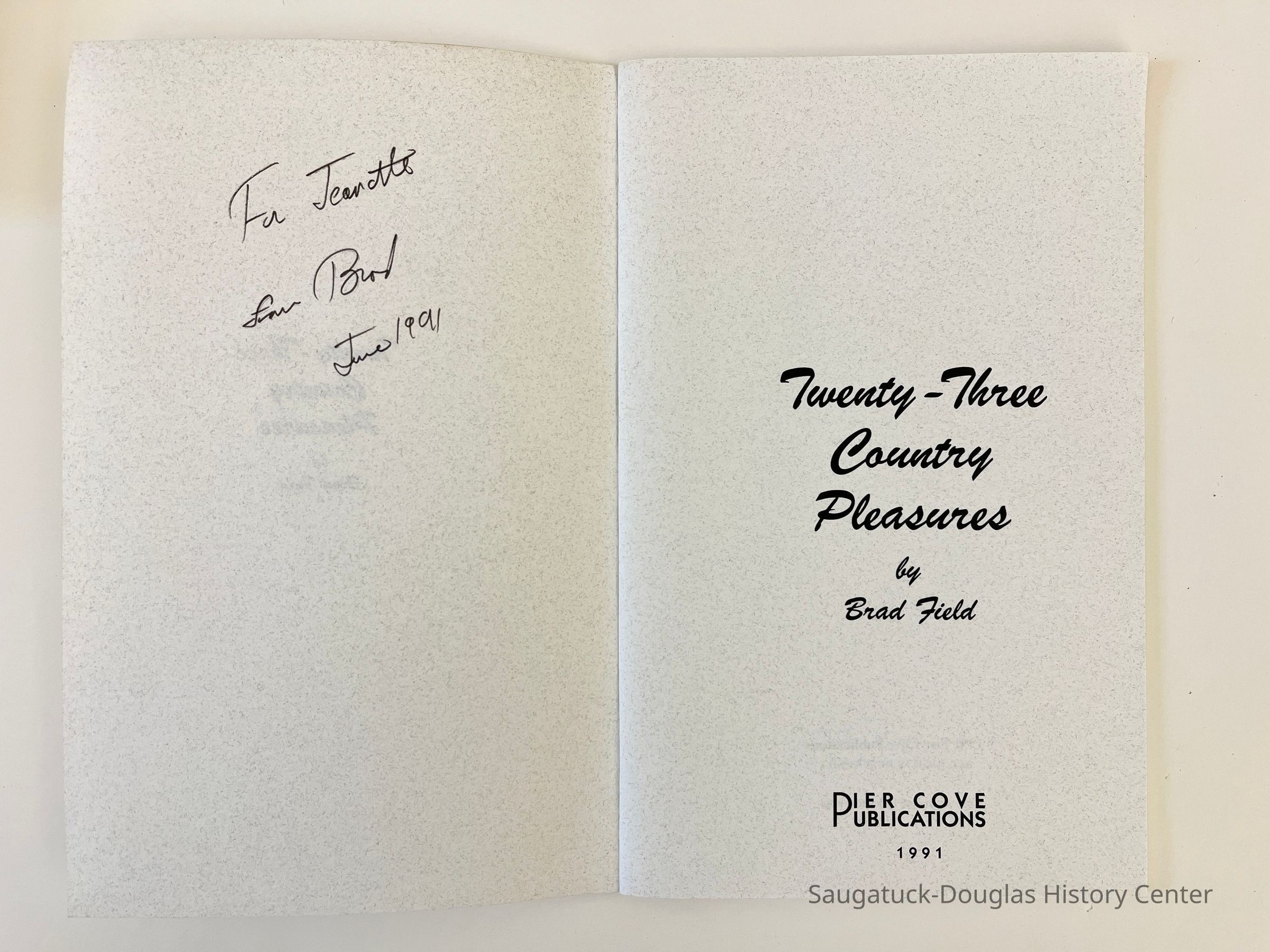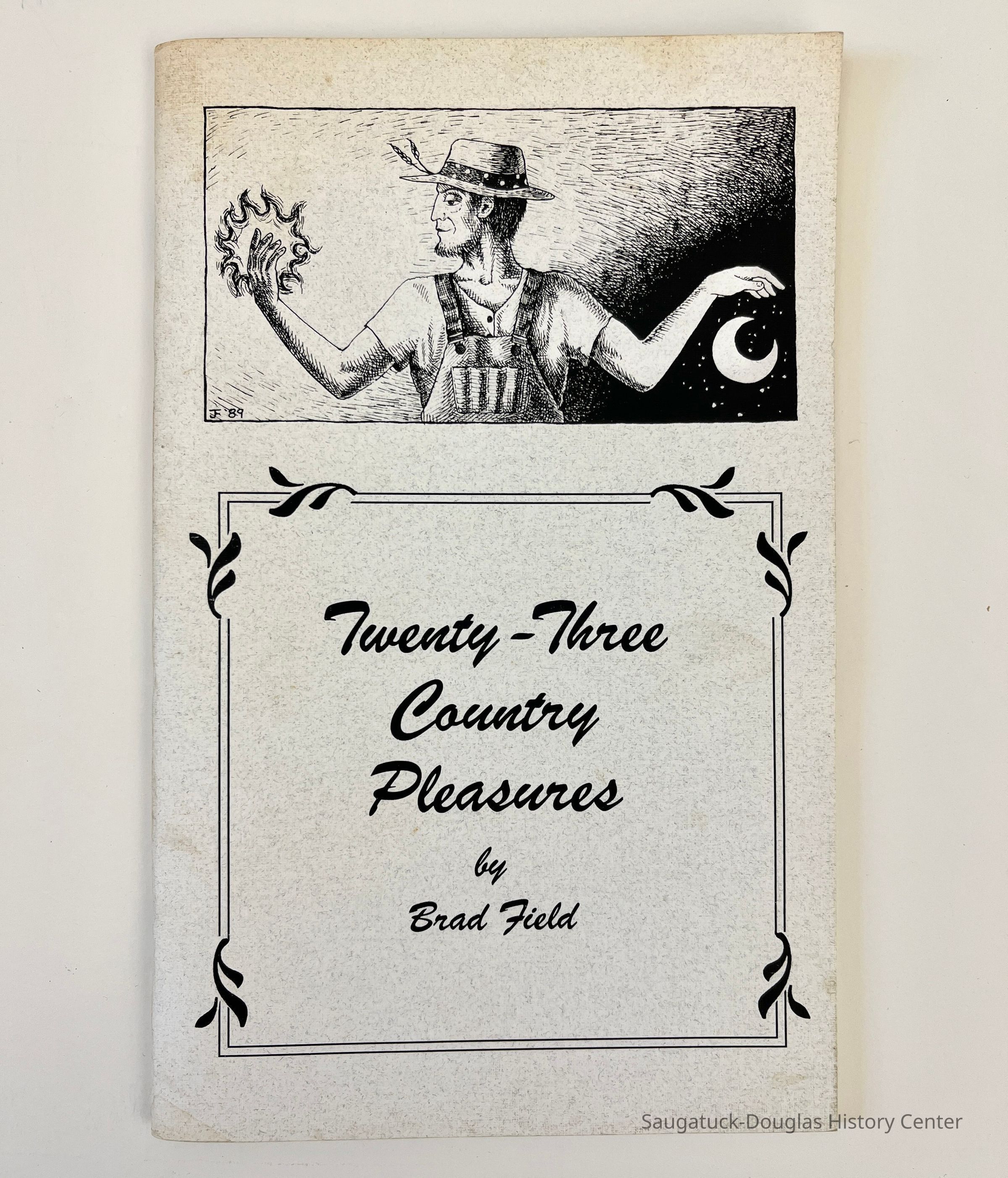 Booklet of poems published by Pier Cove Publications 1991. The cover has a line illustration by Jennifer Field of a man in overalls with a sun in one hand and a mood under the other. The book has a handwritten dedication "Fr Jeanette from Brad June 1991" in the front matter of the book.The book is printed on cream-colored paper with embedded blue flecks.