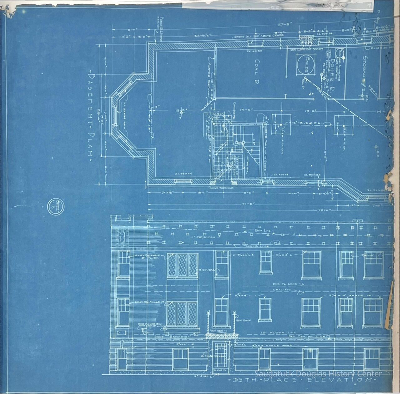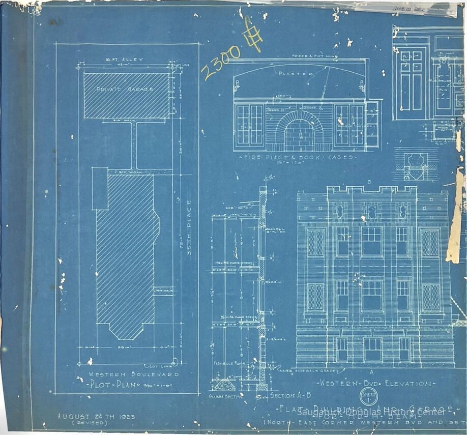This blueprint booklet consists of three half pages. It appears that the other half were cut off, the drawings abruptly end at the right side of each page. They show details for a flat building to be built in Chicago. The pages contain detailed drawings and half-drawings of the interior and exterior of the building. They include measurements and some materials to be used.