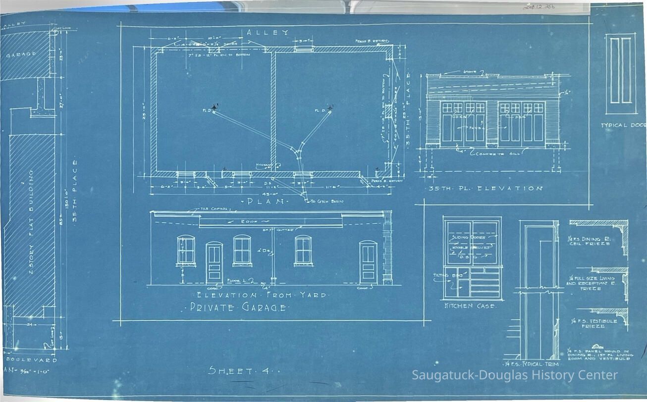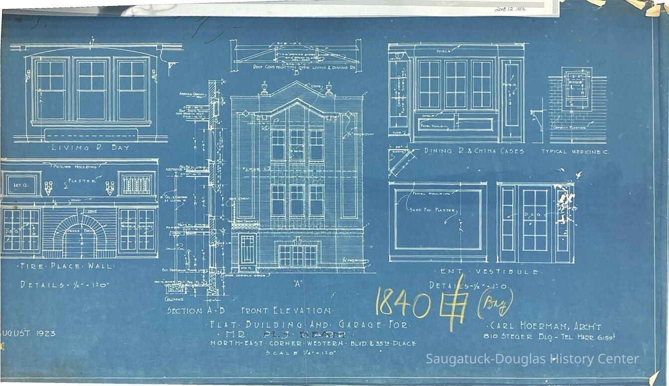 This blueprint booklet consists of four pages of detailed drawings for a flat building in Chicago. They feature the interior and exterior of the building and contain some measurements and materials to be used.