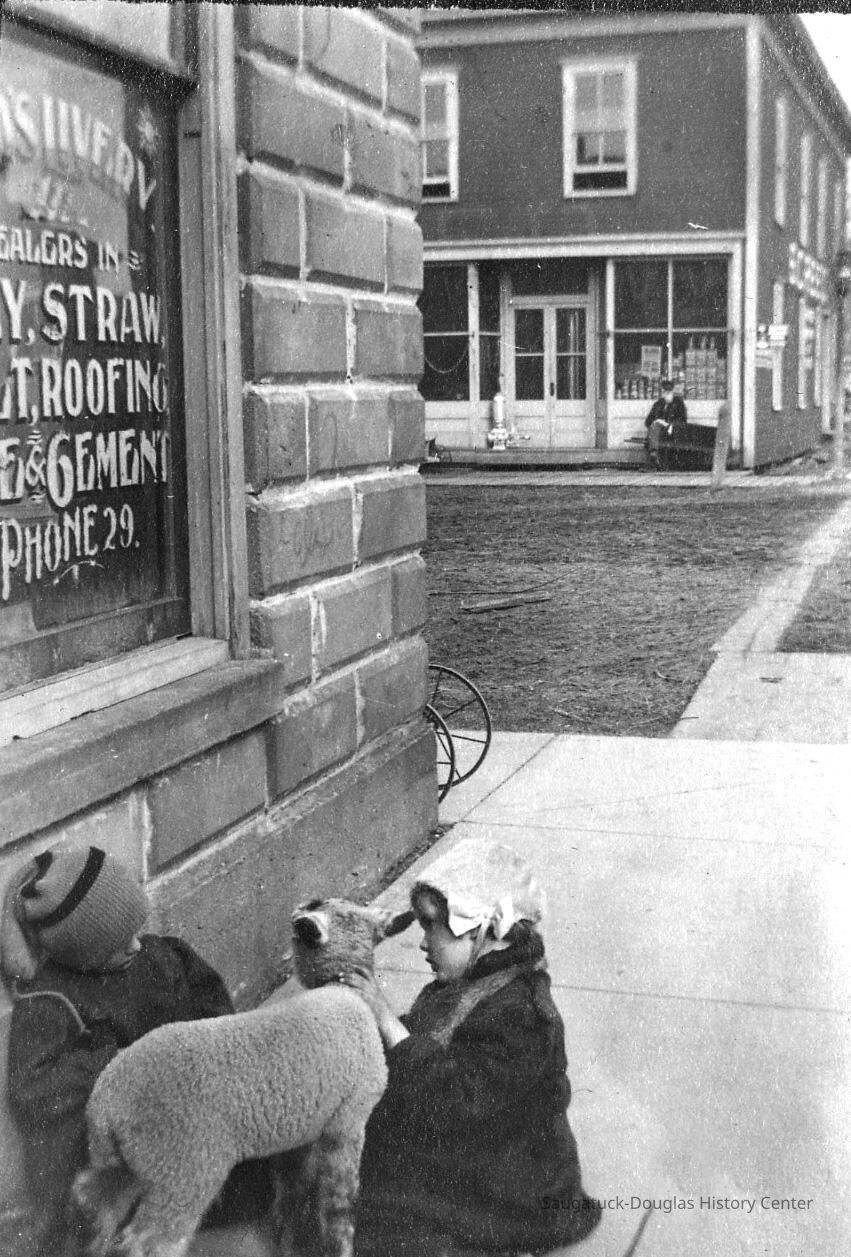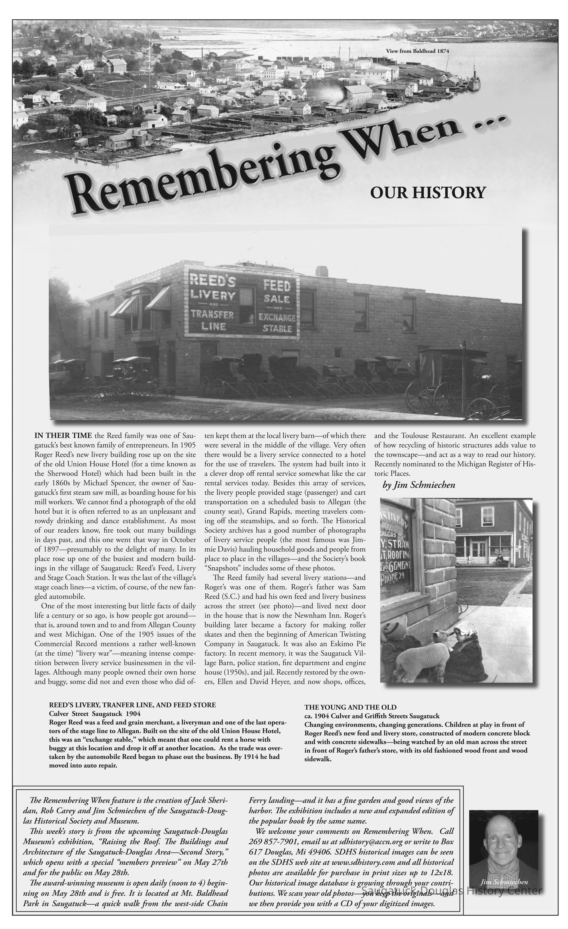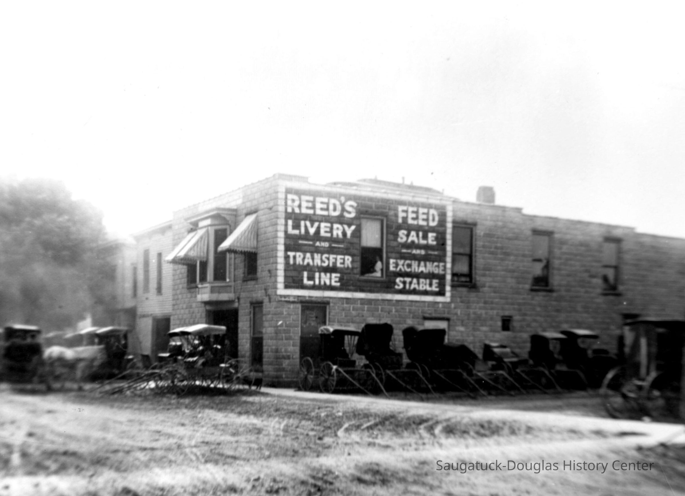 IN THEIR TIME the Reed family was one of Saugatuck’s best known family of entrepreneurs. In 1905 Roger Reed’s new livery building rose up on the site of the old Union House Hotel (for a time known as the Sherwood Hotel) which had been built in the early 1860s by Michael Spencer, the owner of Saugatuck’s first steam saw mill, as boarding house for his mill workers. We cannot find a photograph of the old hotel but it is often referred to as an unpleasant and rowdy drinking and dance establishment. As most of our readers know, fire took out many buildings in days past, and this one went that way in October of 1897—presumably to the delight of many. In its place rose up one of the busiest and modern buildings in the village of Saugatuck: Reed’s Feed, Livery and Stage Coach Station. It was the last of the village’s stage coach lines—a victim, of course, of the new fangled automobile. One of the most interesting but little facts of daily life a century or so ago, is how people got around—that is, around town and to and from Allegan County and west Michigan. One of the 1905 issues of the Commercial Record mentions a rather well-known (at the time) “livery war”—meaning intense competition between livery service businessmen in the villages. Although many people owned their own horse and buggy, some did not and even those who did often kept them at the local livery barn—of which there were several in the middle of the village. Very often there would be a livery service connected to a hotel for the use of travelers. The system had built into it a clever drop off rental service somewhat like the car rental services today. Besides this array of services, the livery people provided stage (passenger) and cart transportation on a scheduled basis to Allegan (the county seat), Grand Rapids, meeting travelers coming off the steamships, and so forth. The Historical Society archives has a good number of photographs of livery service people (the most famous was Jimmie Davis) hauling household goods and people from place to place in the villages—and the Society’s book “Snapshots” includes some of these photos. The Reed family had several livery stations—and Roger’s was one of them. Roger’s father was Sam Reed (S.C.) and had his own feed and livery business across the street (see photo)—and lived next door in the house that is now the Newnham Inn. Roger’s building later became a factory for making roller skates and then the beginning of American Twisting Company in Saugatuck. It was also an Eskimo Pie factory. In recent memory, it was the Saugatuck Village Barn, police station, fire department and engine house (1950s), and jail. Recently restored by the owners, Ellen and David Heyer, and now shops, offices, and the Toulouse Restaurant. An excellent example of how recycling of historic structures adds value to the townscape—and act as a way to read our history. Recently nominated to the Michigan Register of Historic Places. by Jim Schmiechen Photo captions: REED’S LIVERY, TRANSFER LINE, AND FEED STORE Culver Street Saugatuck 1904 Roger Reed was a feed and grain merchant, a liveryman and one of the last operators of the stage line to Allegan. Built on the site of the old Union House Hotel, this was an “exchange stable,” which meant that one could rent a horse with buggy at this location and drop it off at another location. As the trade was overtaken by the automobile Reed began to phase out the business. By 1914 he had moved into auto repair. THE YOUNG AND THE OLD ca. 1904 Culver and Griffith Streets Saugatuck Changing environments, changing generations. Children at play in front of Roger Reed’s new feed and livery store, constructed of modern concrete block and with concrete sidewalks—being watched by an old man across the street in front of Roger’s father’s store, with its old fashioned wood front and wood sidewalk.